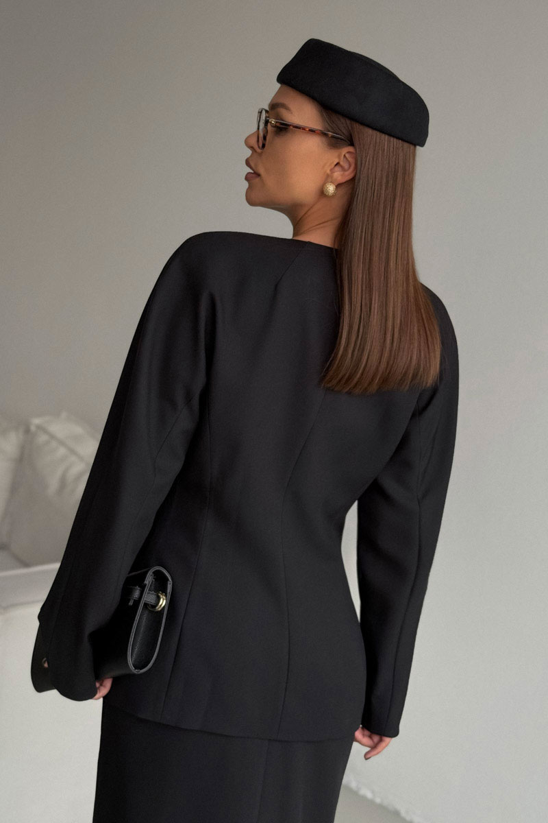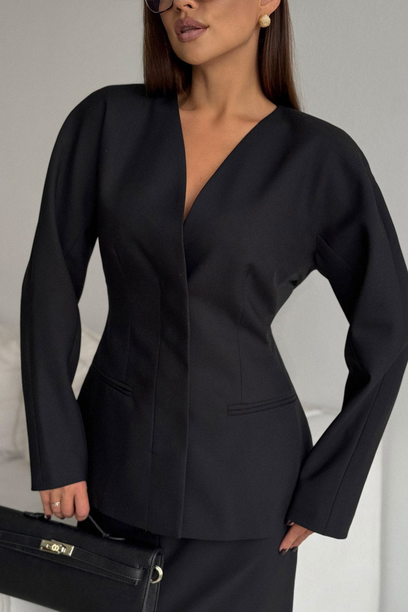 Жакет женский приталеннго Ф-силуэта, выполнен из костюмной ткани. Застежка потайная на петли и пуговицы. Рукав цельновыкроенный двухшовный.