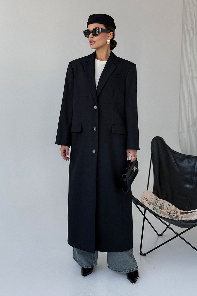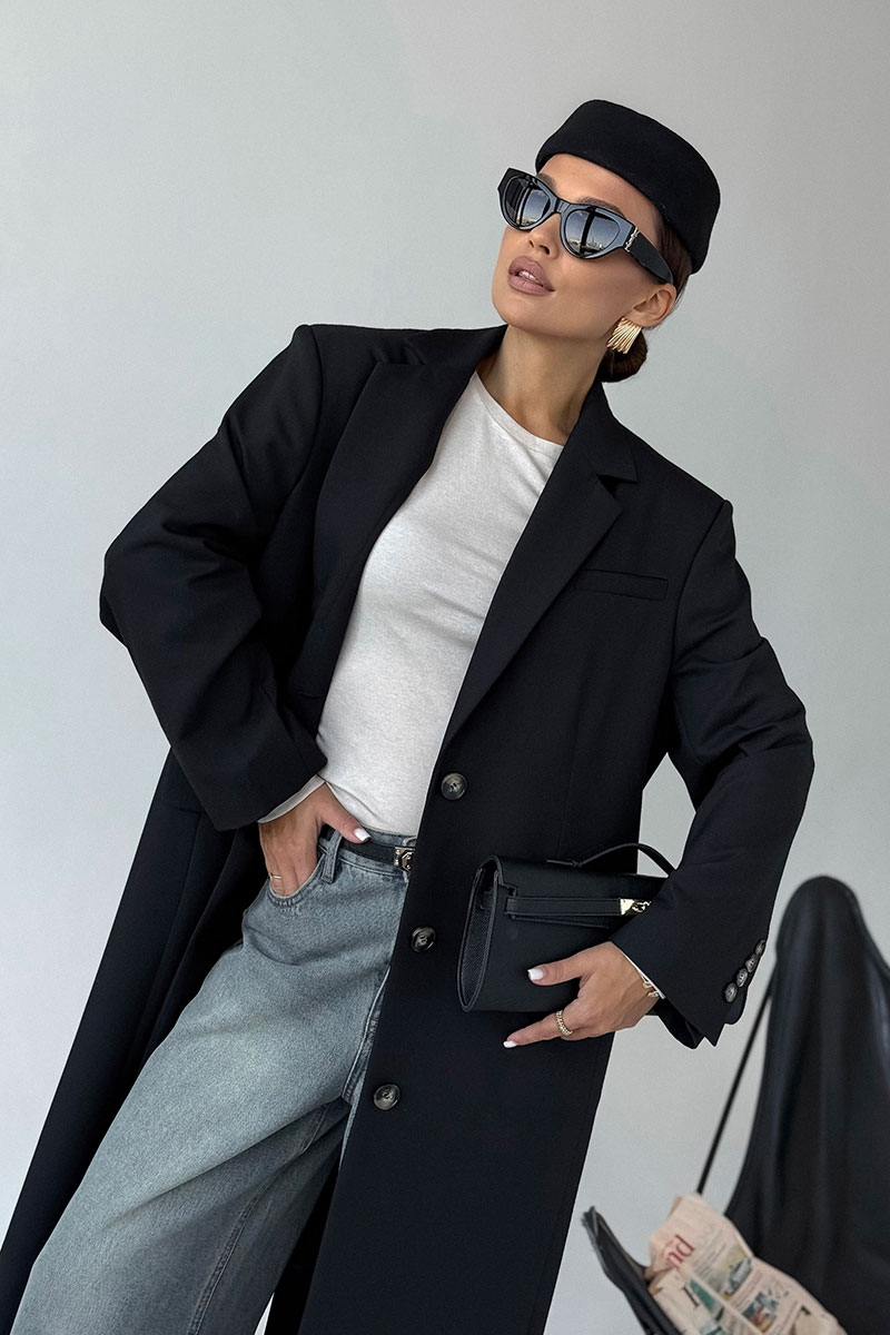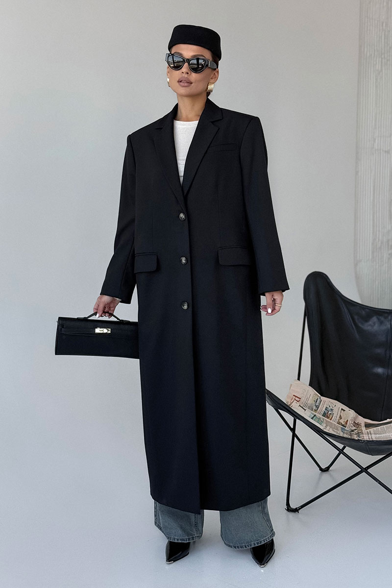 Жакет женский свободного силуэта, выполнен из костюмной ткани. Вортник стояче-отложной с отворотами лацканов, линия плеча расширена. Застежка центральная на петли и пуговицы. Рукав втачной двухшовный, по низу рукава шлица. По переду жакета прорезные карманы с клапанами. Сзади жакета по среднему шву шлица.