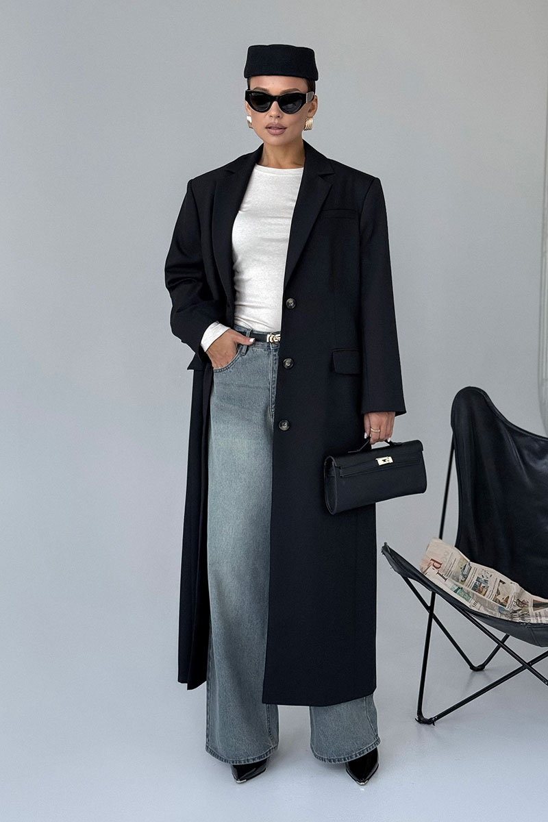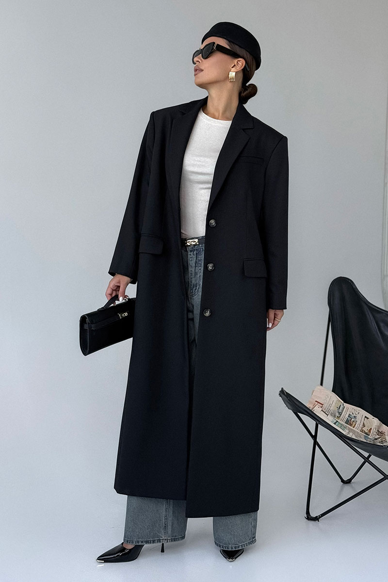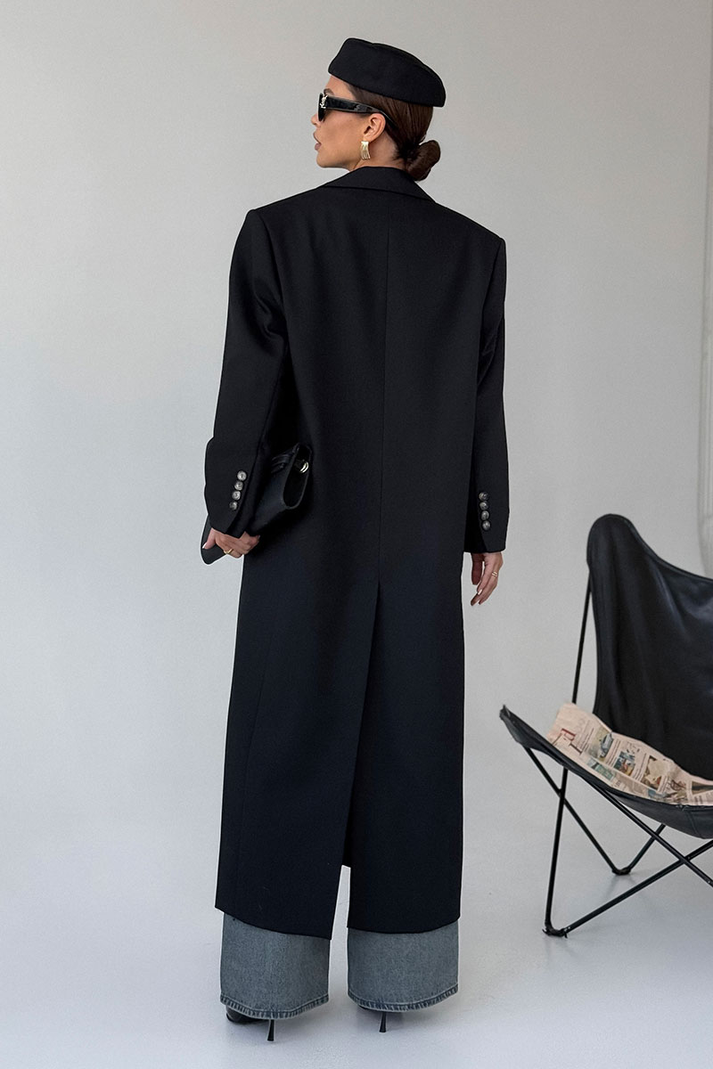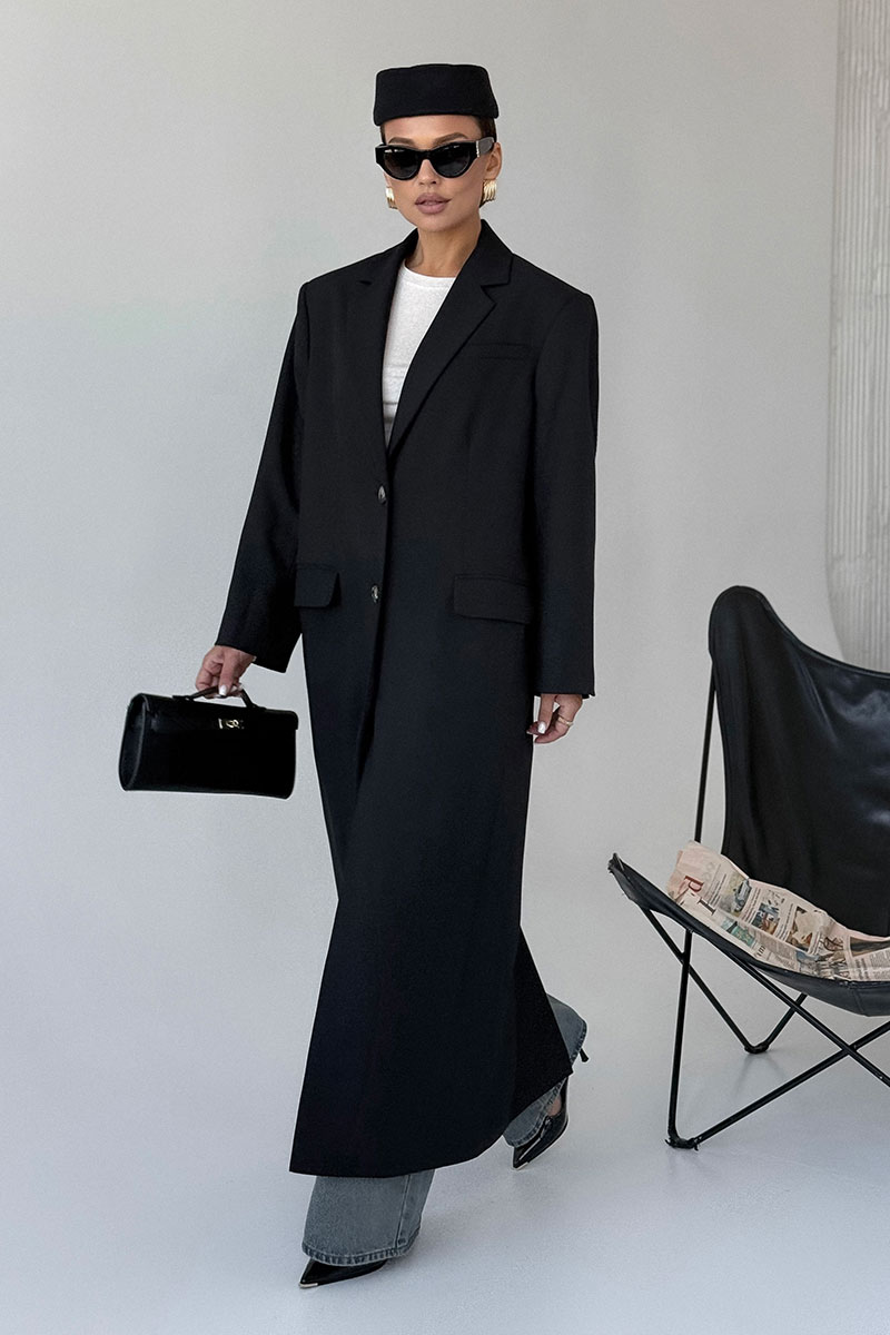 Жакет женский свободного силуэта, выполнен из костюмной ткани. Вортник стояче-отложной с отворотами лацканов, линия плеча расширена. Застежка центральная на петли и пуговицы. Рукав втачной двухшовный, по низу рукава шлица. По переду жакета прорезные карманы с клапанами. Сзади жакета по среднему шву шлица.