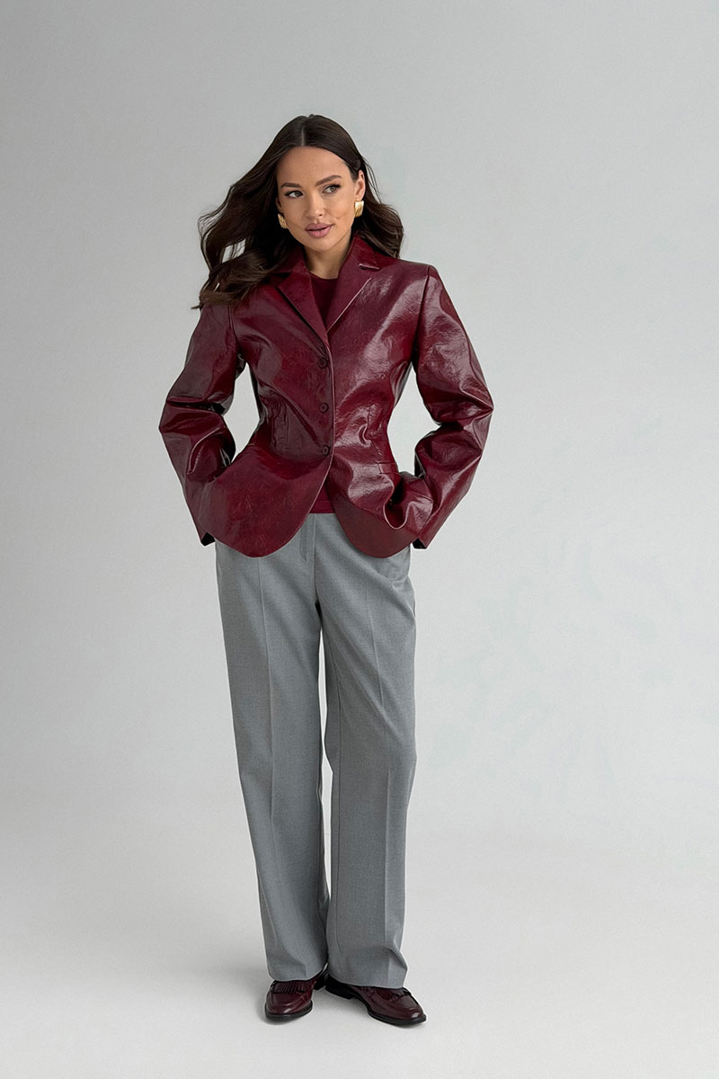 Жакет женский приталенного силуэта, выполнен из  искусственной кожи, жакет на подкладке. Вортник стояче - отложной с отворотами лацканов, застежка центральная на  петли и пуговицы. Рукав втачной двухшовный. По переду  жакета прорезные карманы с клапанами. Сзади жакета по среднему шву шлица.