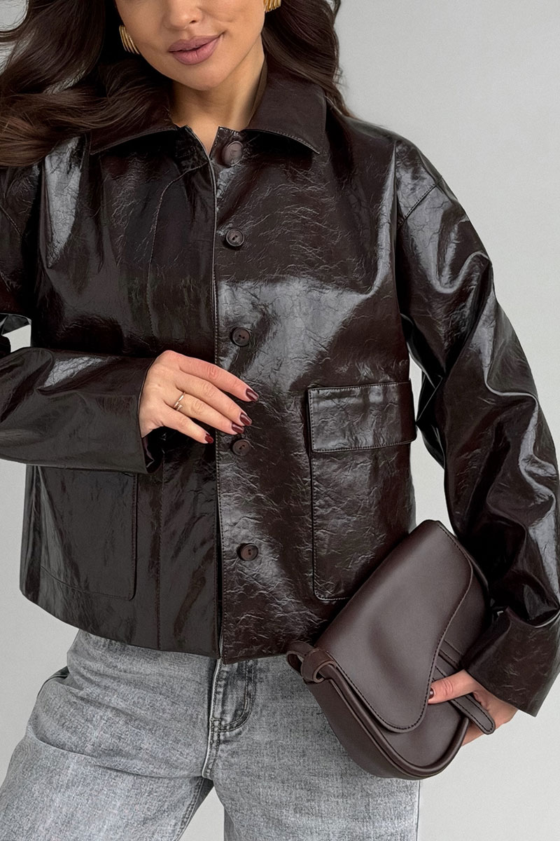 Жакет полуприлегающего силуэта , выполнен из искусственной кожи . Жакет на подкладке .Воротник стояче-отложной . По переду застежка центральная потайная и накладные карманы с клапанами . Рукав слегка спущенный.