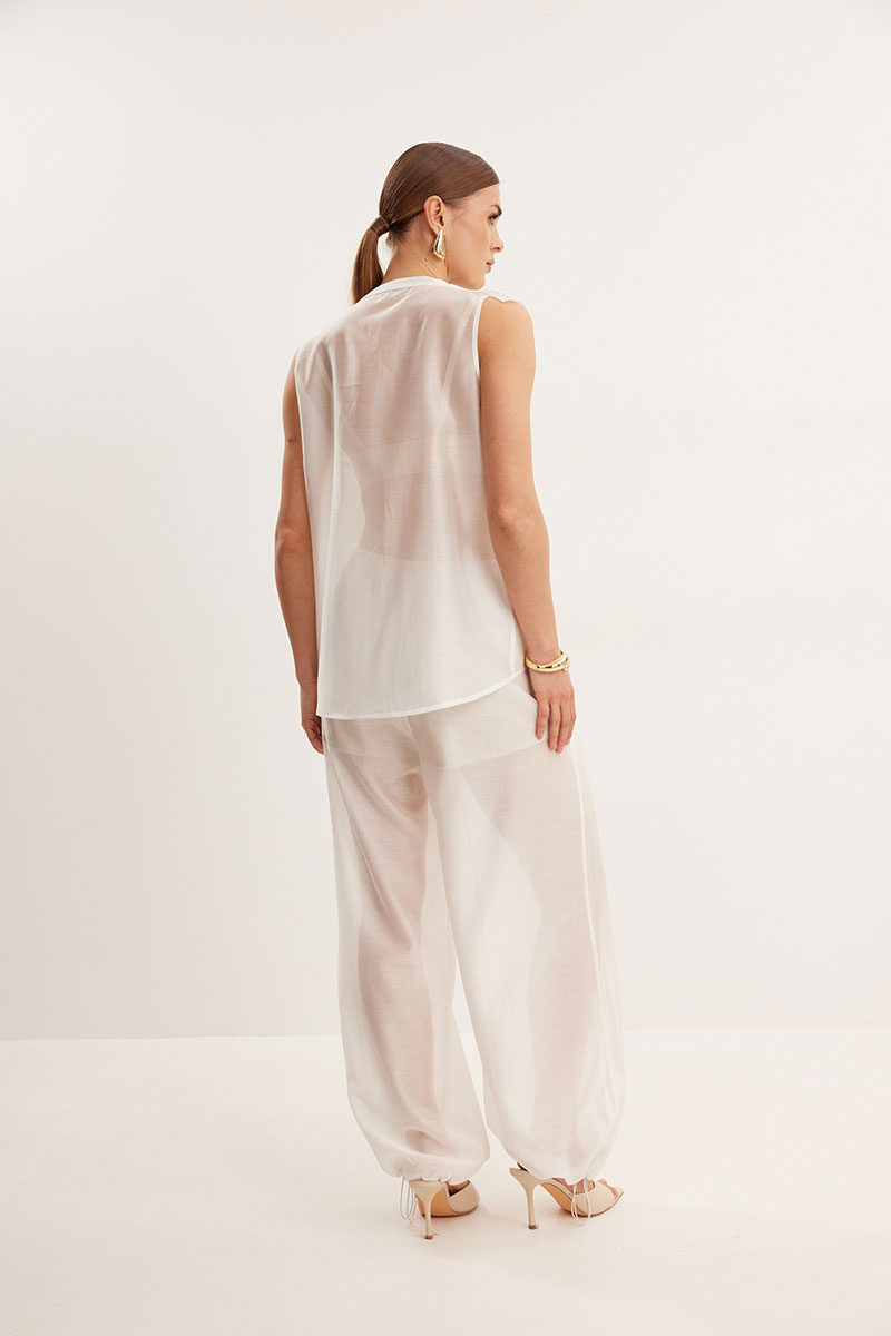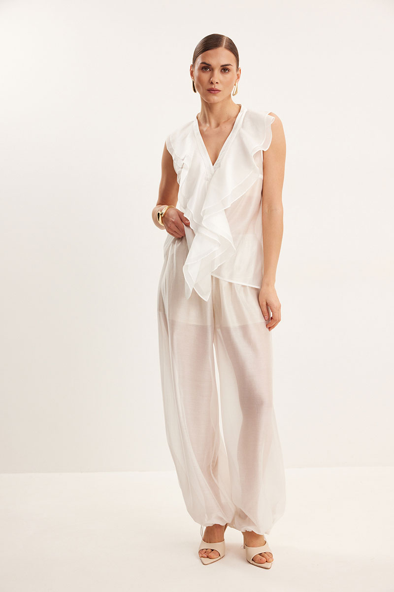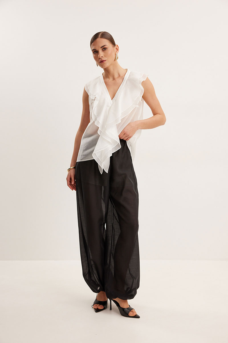 Блузка из вискозной вуали, полуприлегающего силуэта. Вырез Y- образной формы. По переду декор в виде двухслойного волана.