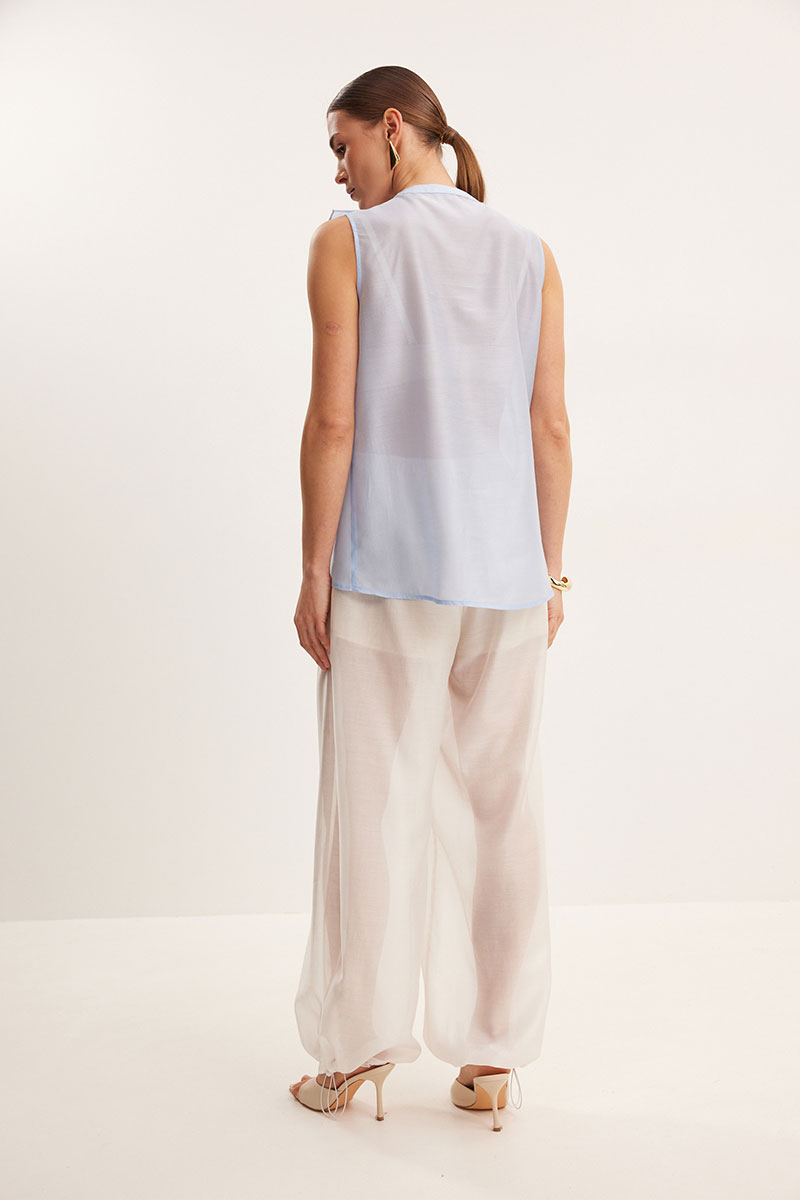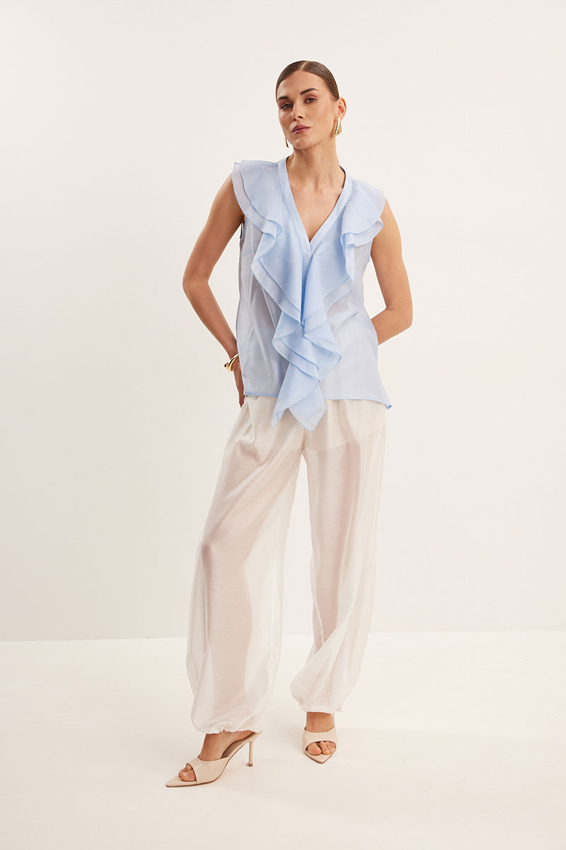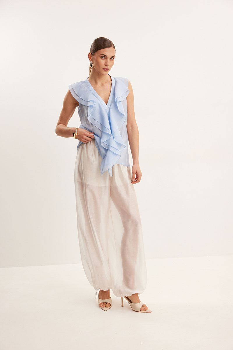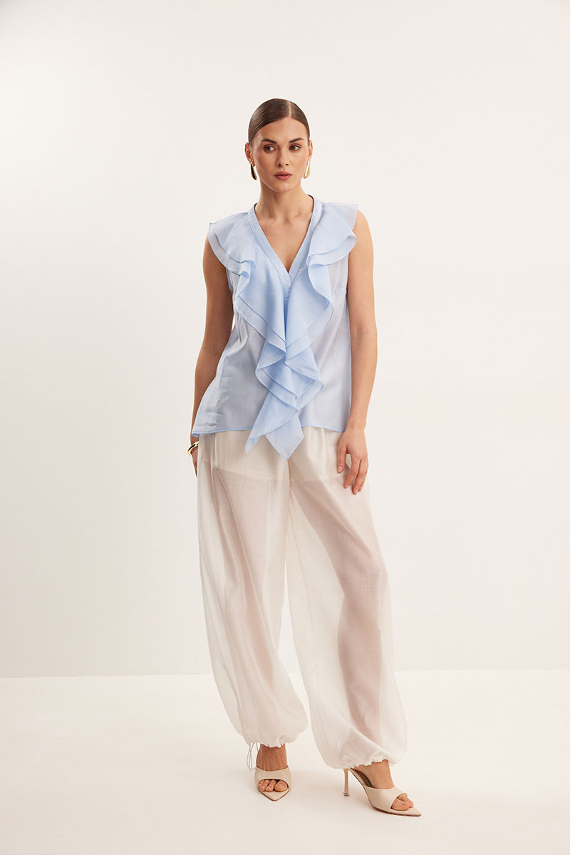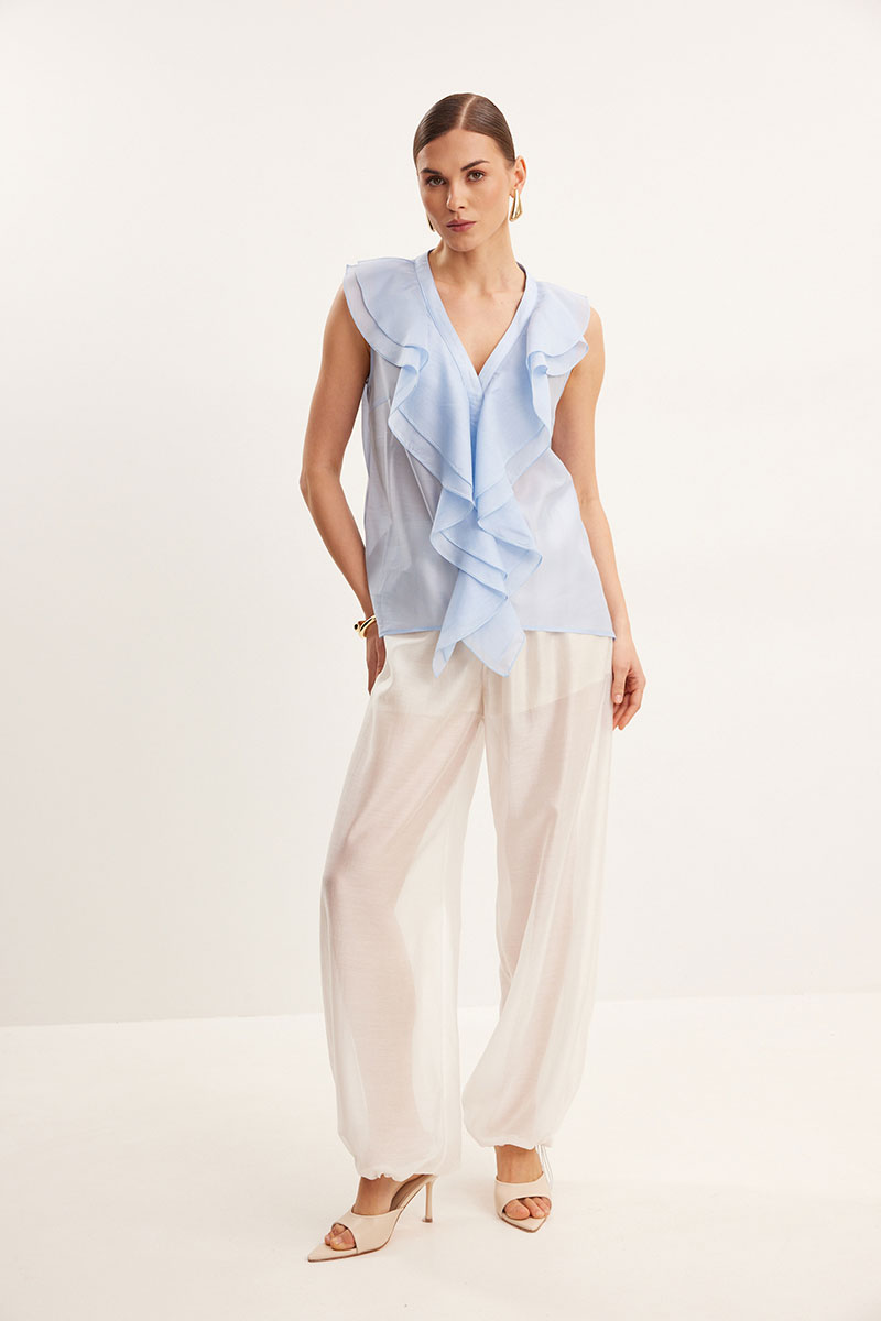 Блузка из вискозной вуали, полуприлегающего силуэта. Вырез Y- образной формы. По переду декор в виде двухслойного волана.