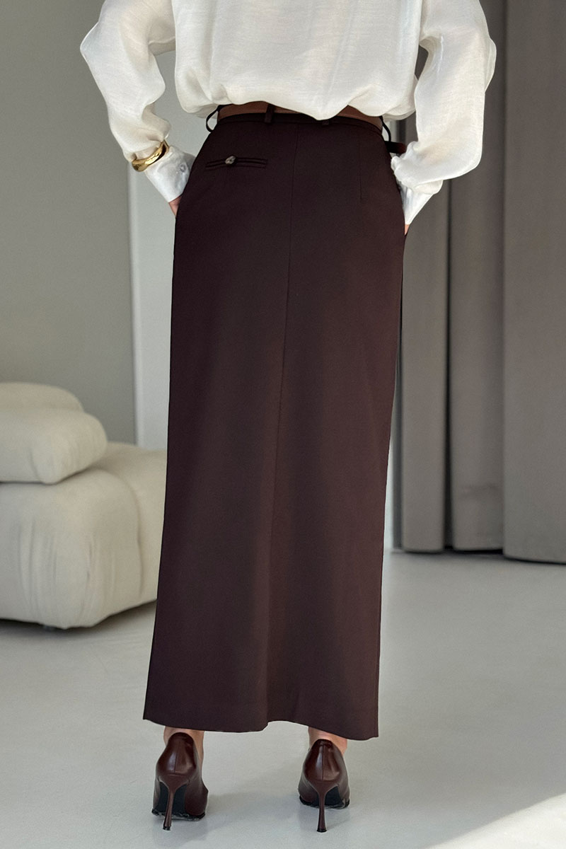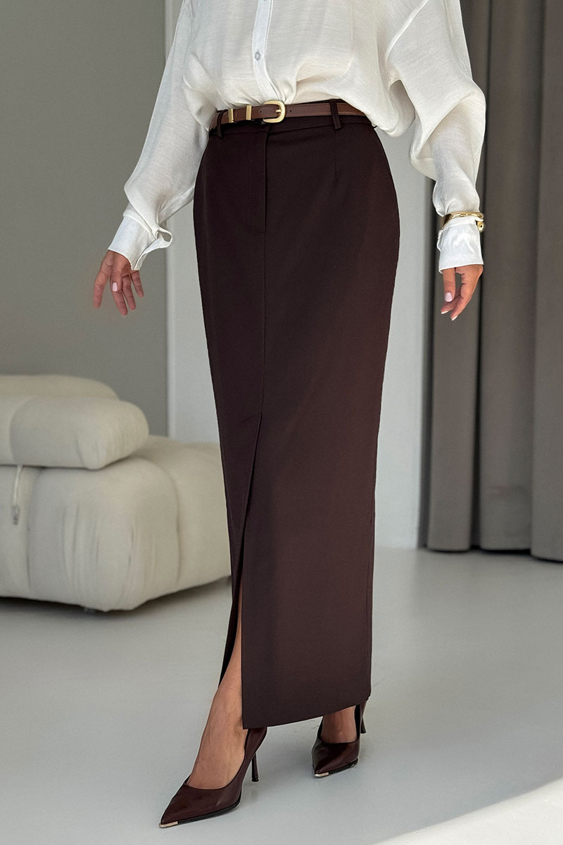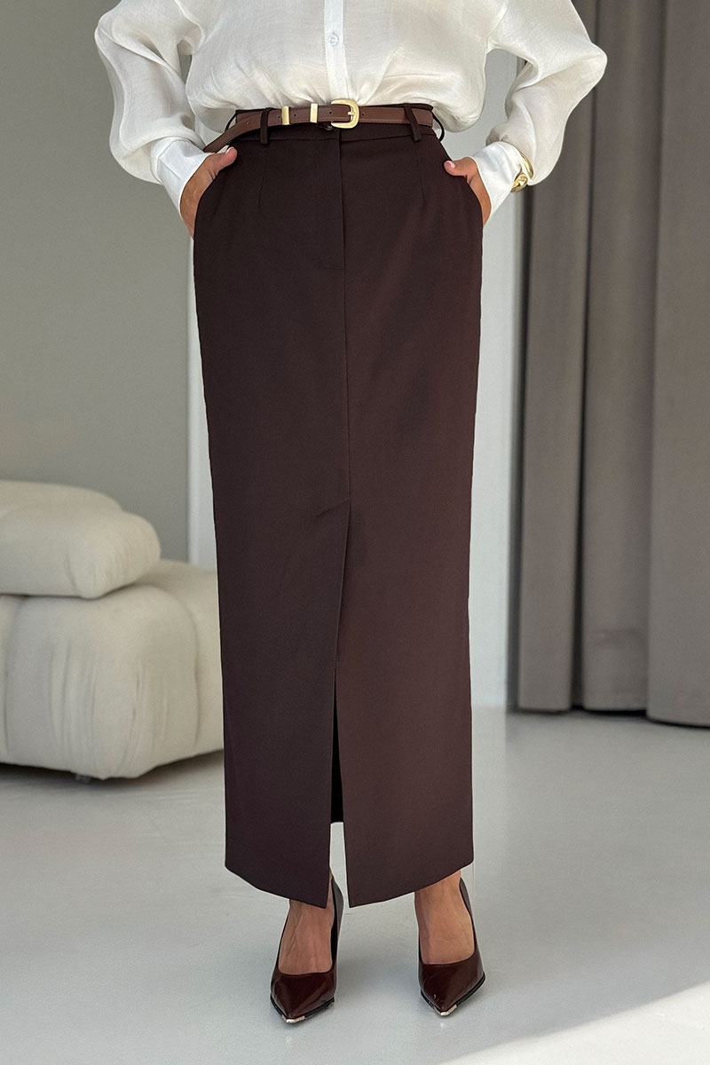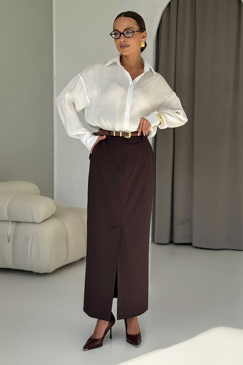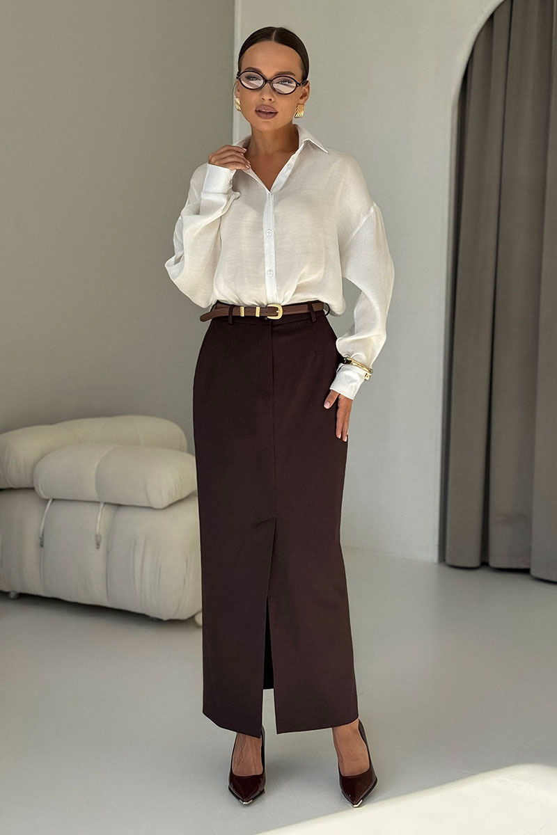 Юбка женская, прямого силуэта, спереди шлица и боковые карманы. Верх юбки обработан подкройным поясом. Спереди застежка в виде молнии, сзади функиональный карман в рамку.