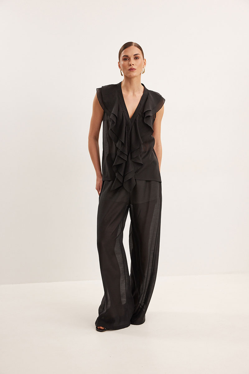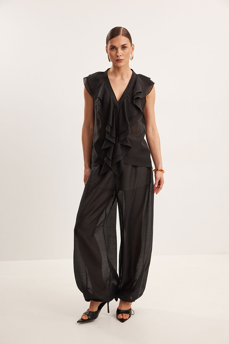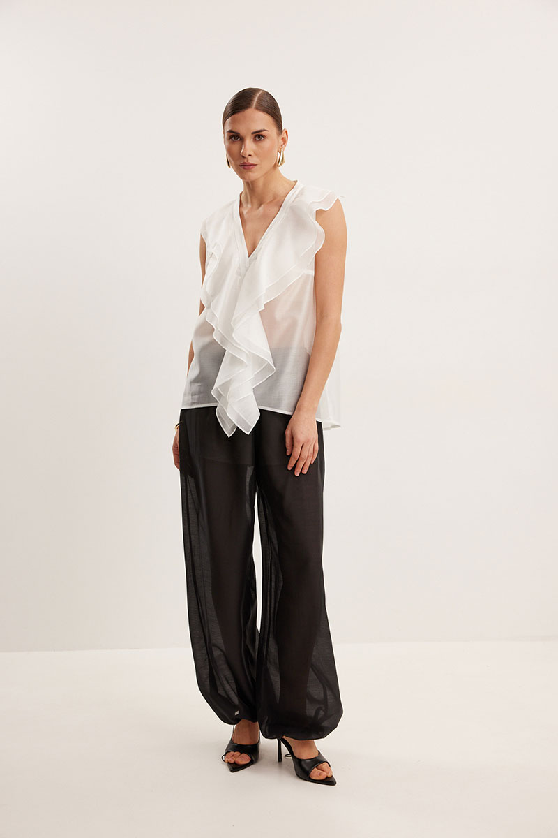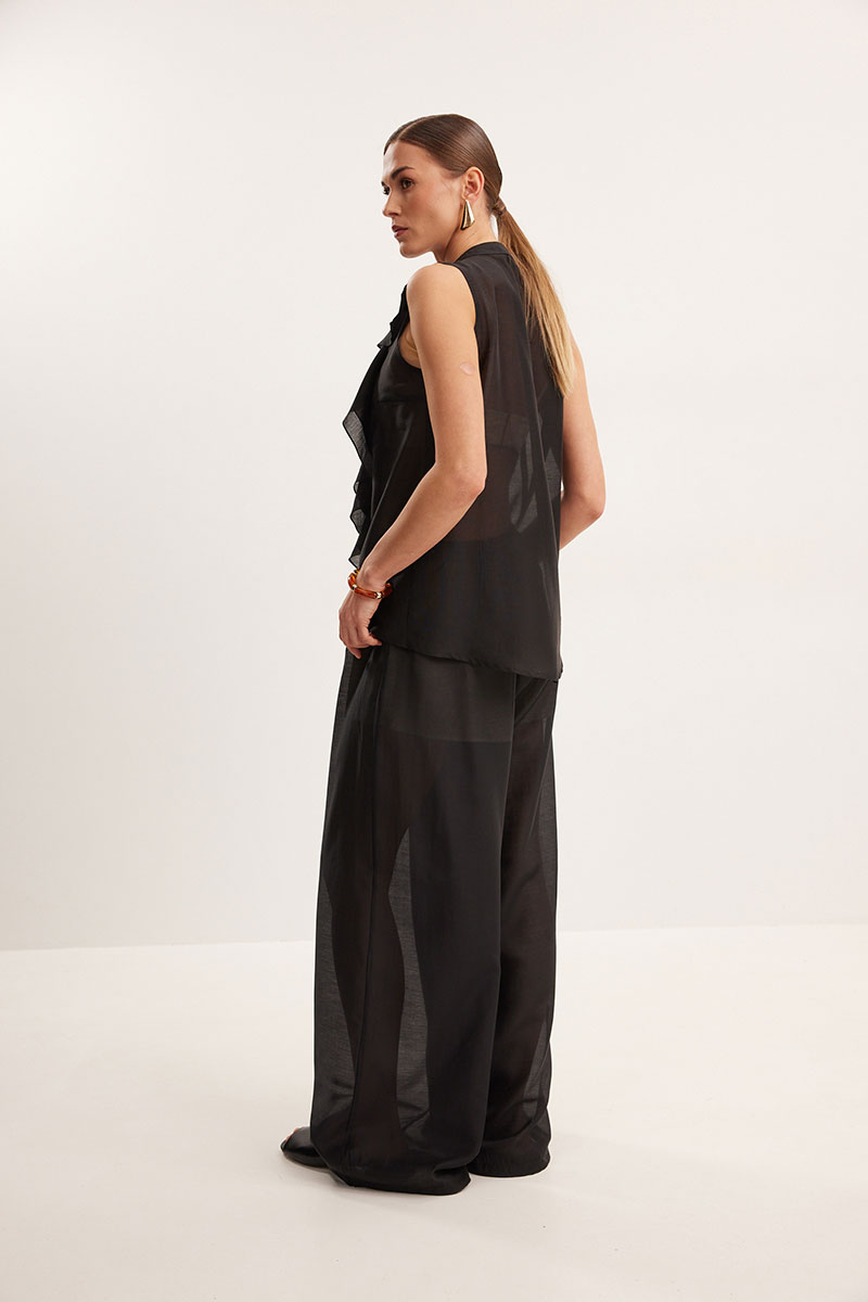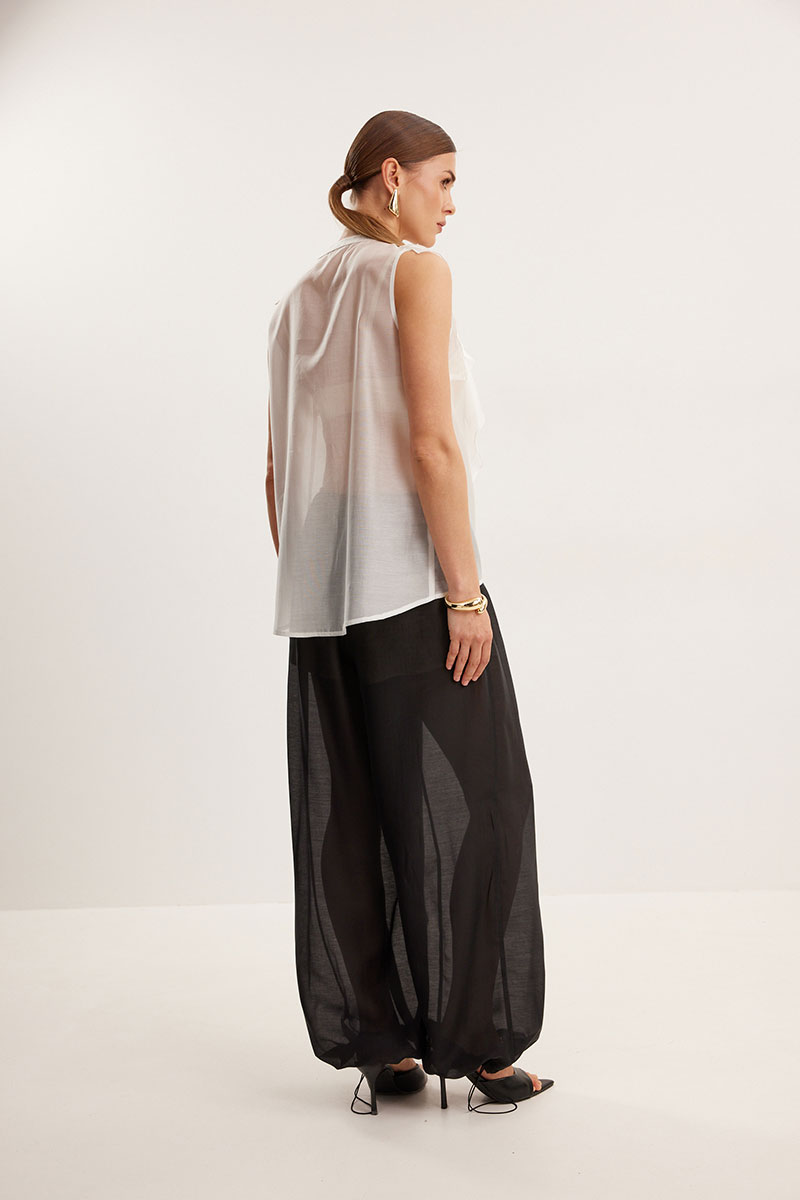 Брюки из вискозной вуали, на трикотажной подкладке. Верх брюк обработан закрытой резинкой. Внизу брюк кулиса, что дает возможность носить их в двух вариантах .
