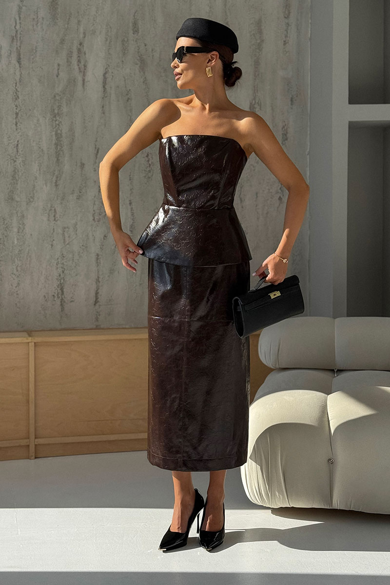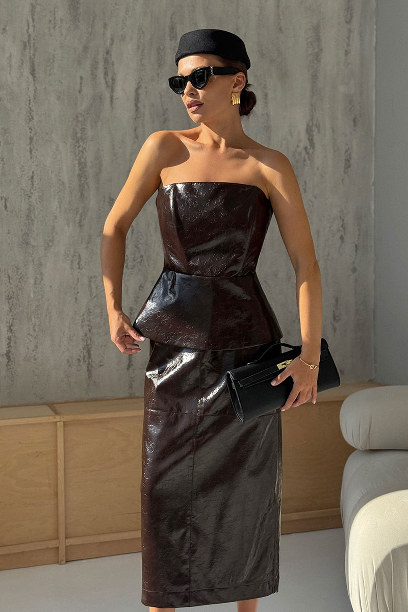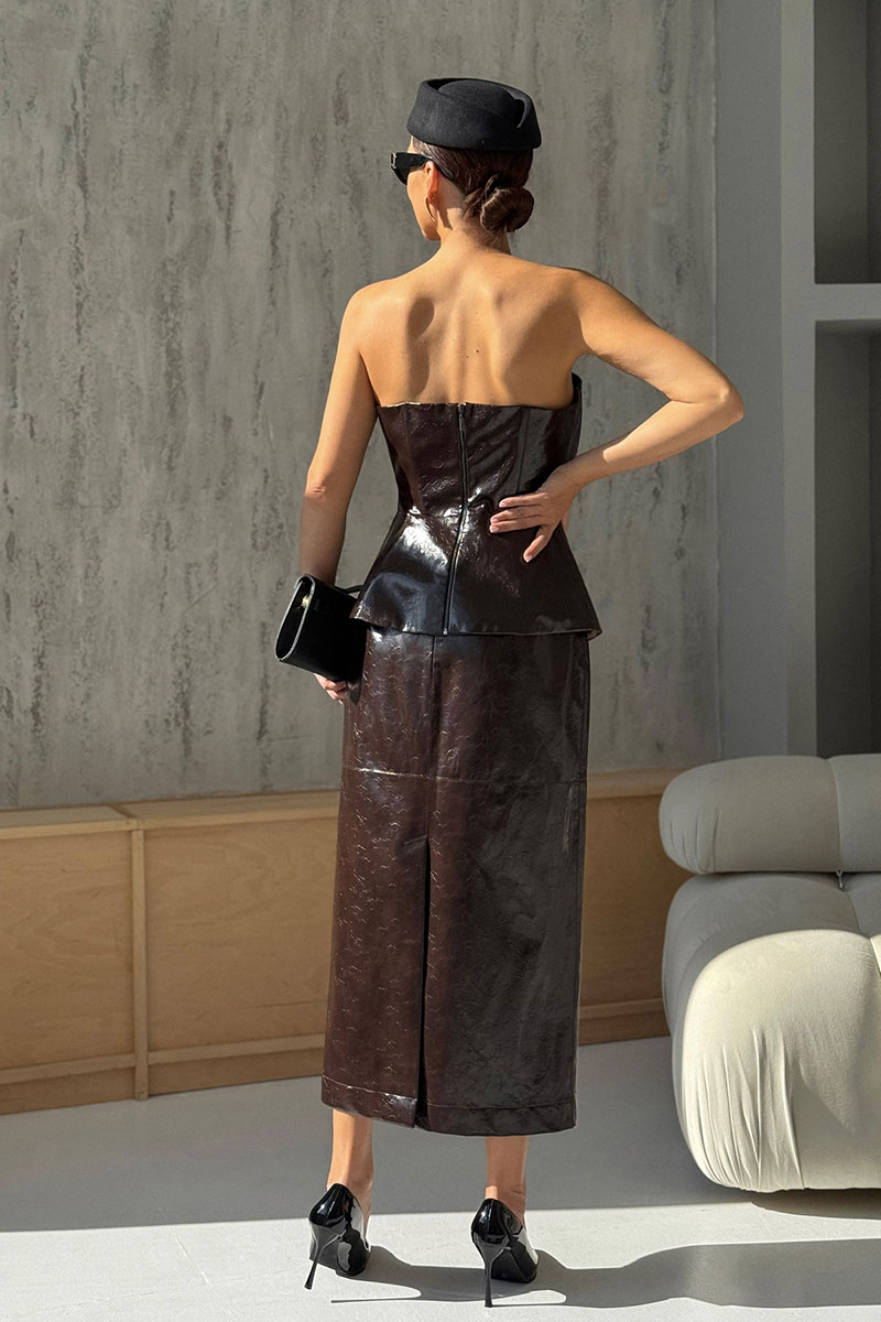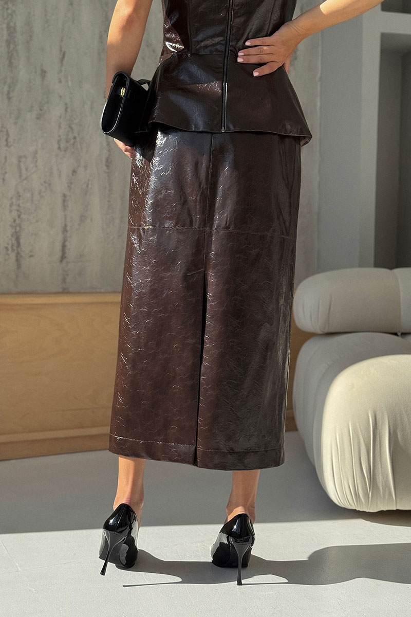 Юбка женская выполнена из искссутвенной кожи высокого качества на подкладке. Юбка прямого силуэта, верх юбки обработан покройным поясом. По переду юбки подрез с отделочными строчками. Застежка в виде потайной молнии по средней линии сзади.