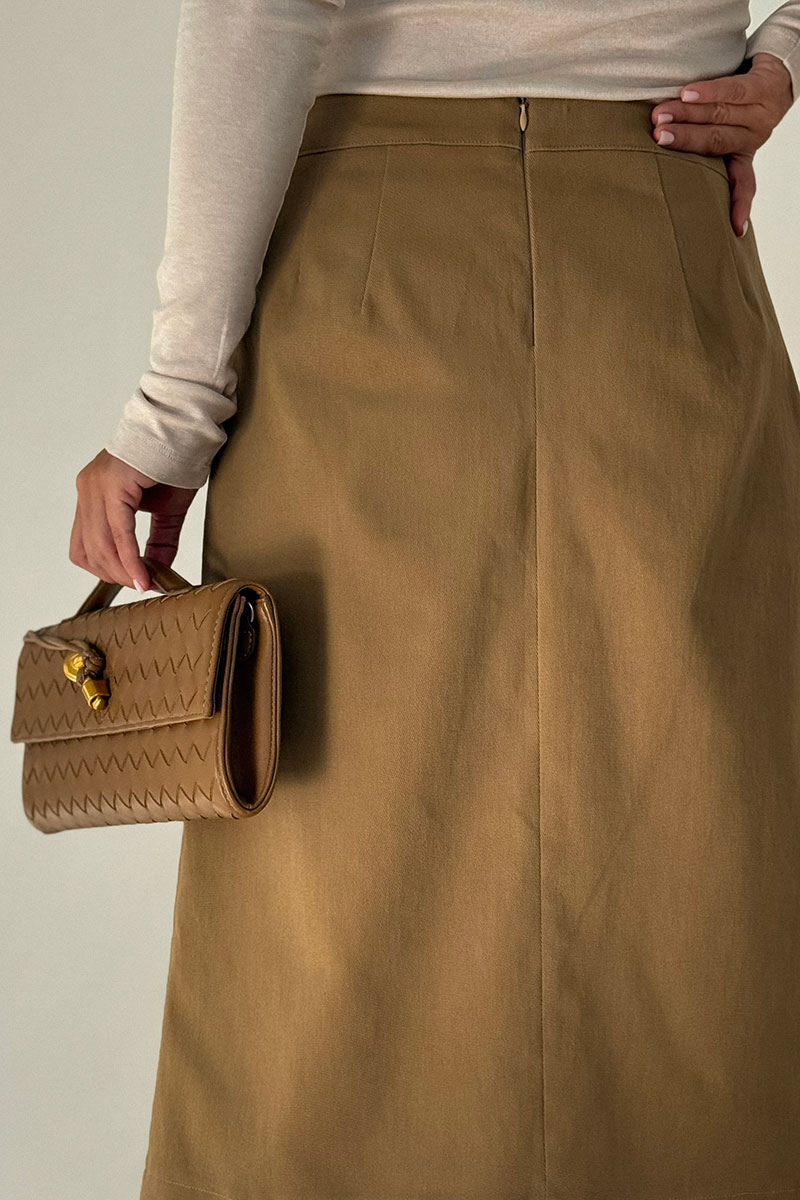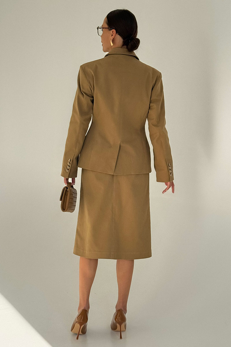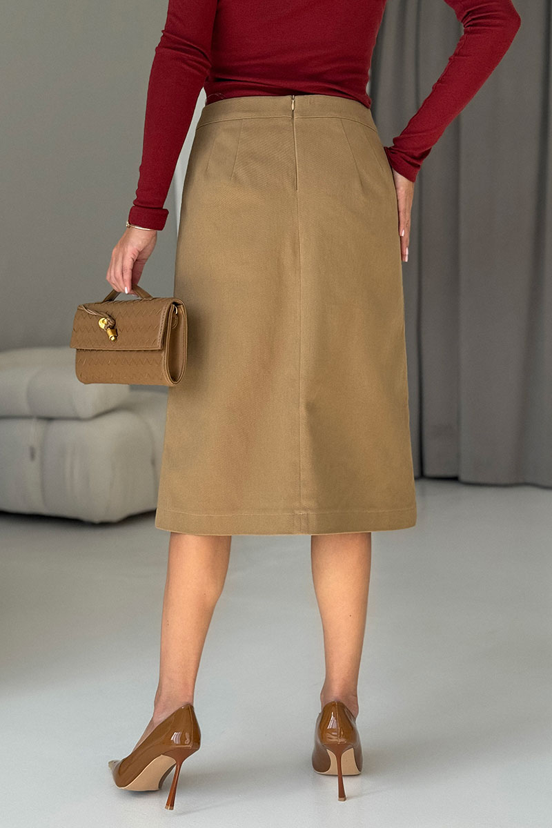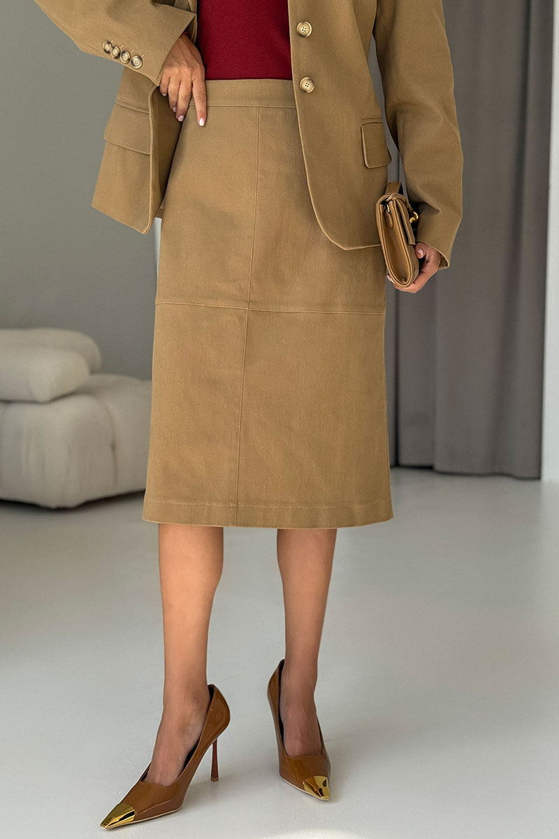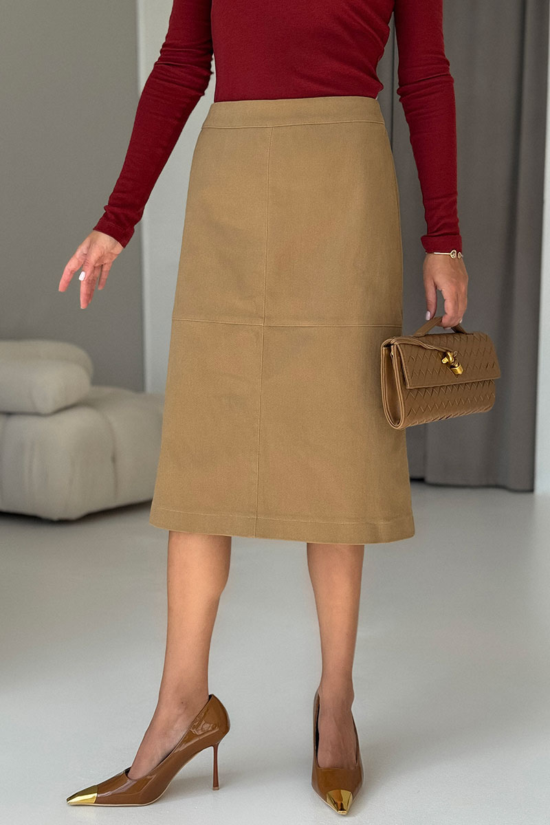 Юбка женская выполнена из костюмного джинса с бархатистым ворсом. Юбка слегка расширена к низу, верх юбки обработан покройным поясом. По переду юбки подрез с отделочными строчками. Застежка в виде потайной молнии по средней линии сзади.