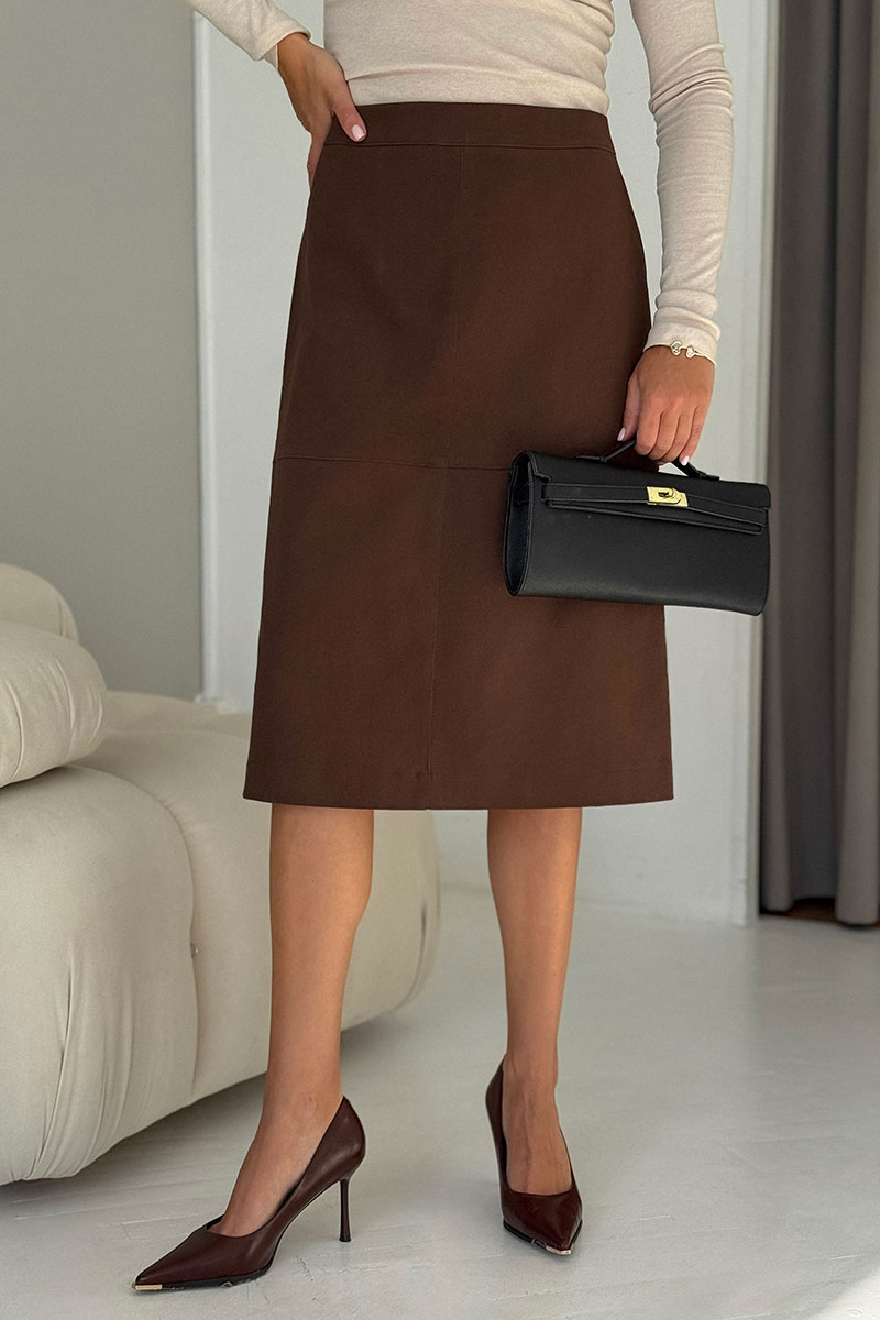 Юбка женская выполнена из костюмного джинса с бархатистым ворсом. Юбка слегка расширена к низу, верх юбки обработан покройным поясом. По переду юбки подрез с отделочными строчками. Застежка в виде потайной молнии по средней линии сзади.