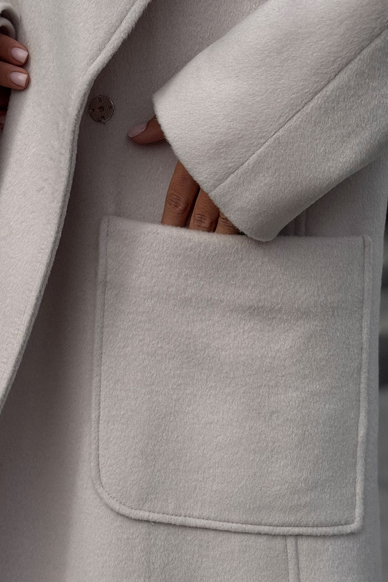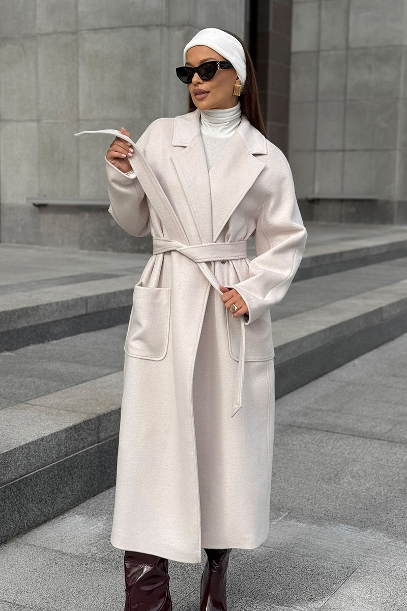 Пальто женское двубортное, выполнено из пальтовой ткани великолепного качества. Рукав спущенный, воротник стояче-отложной с отворотами лацканов. По переду накладные карманы, в комплекте пояс из основной ткани.