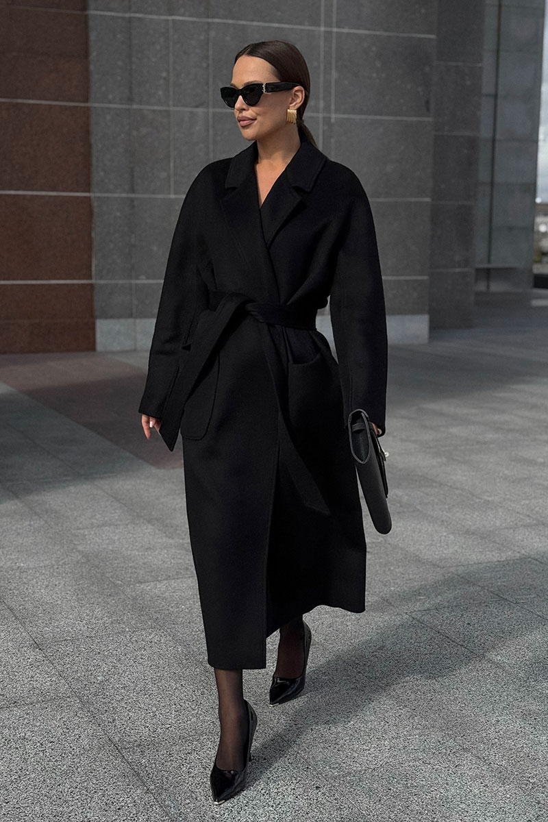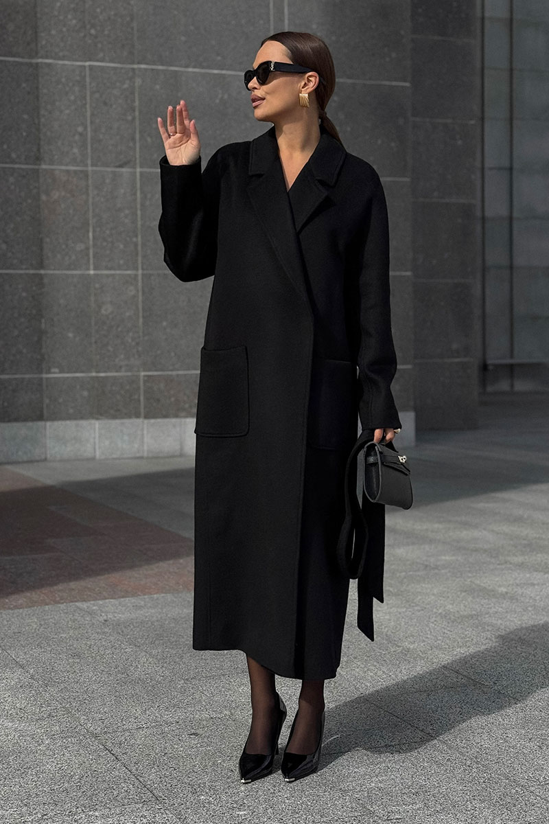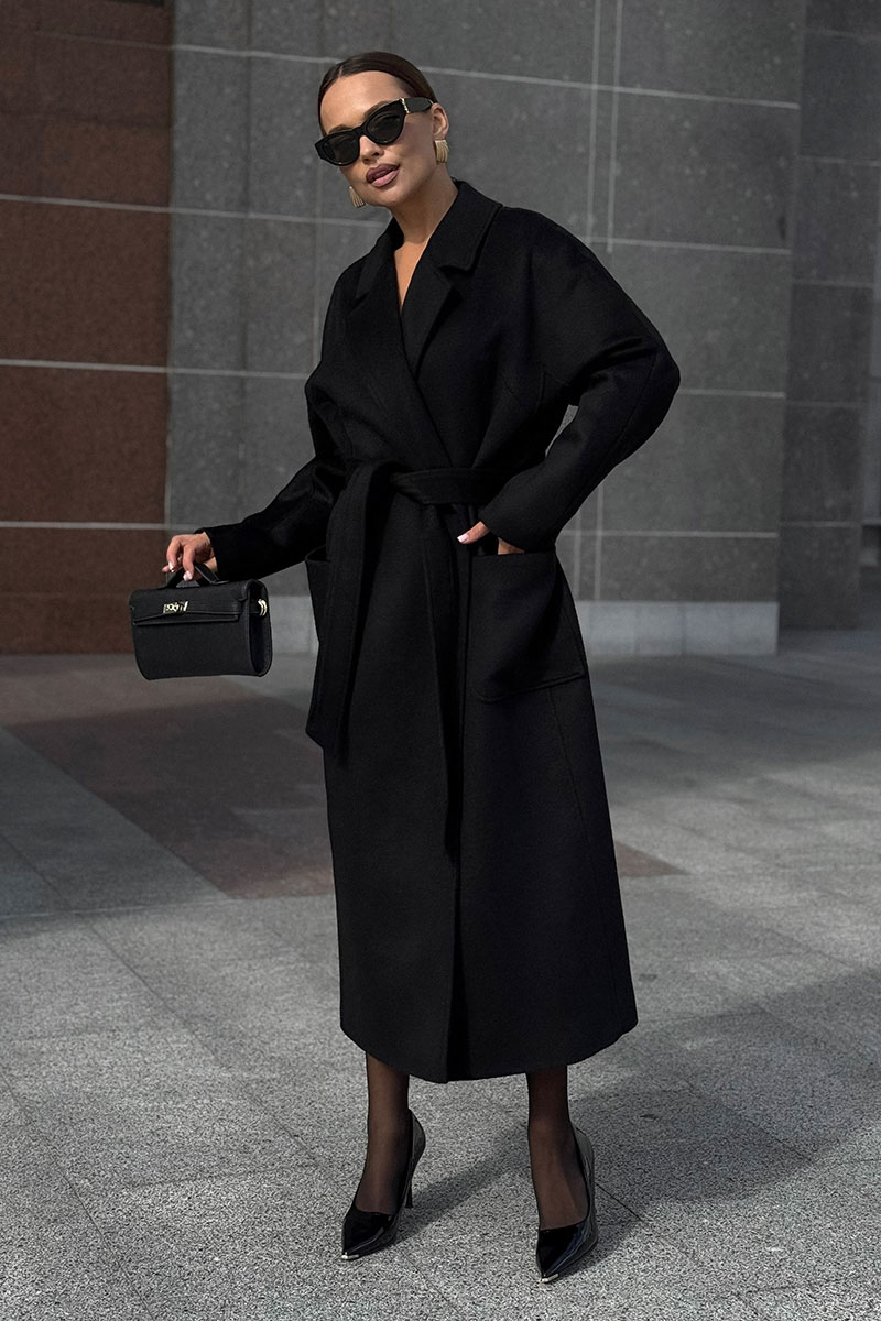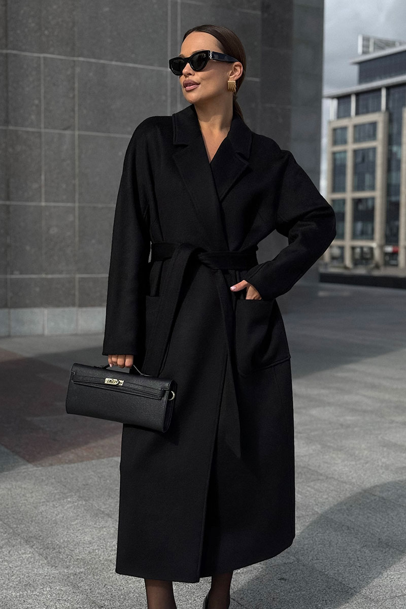 Пальто женское двубортное, выполнено из пальтовой ткани великолепного качества. Рукав спущенный, воротник стояче-отложной с отворотами лацканов. По переду накладные карманы, в комплекте пояс из основной ткани.