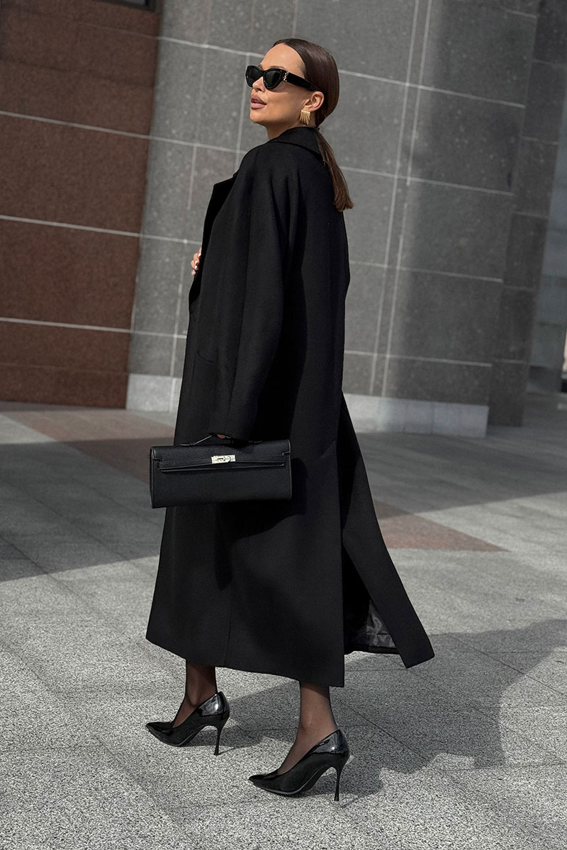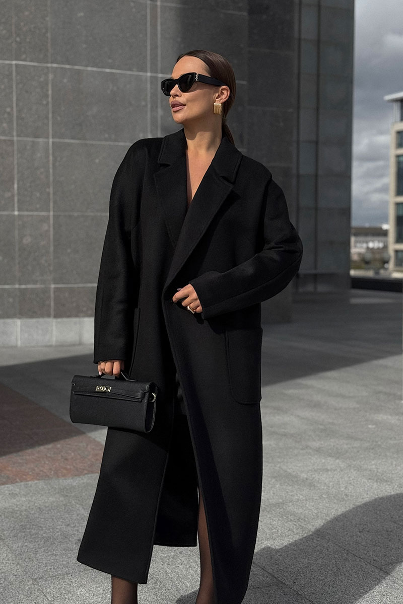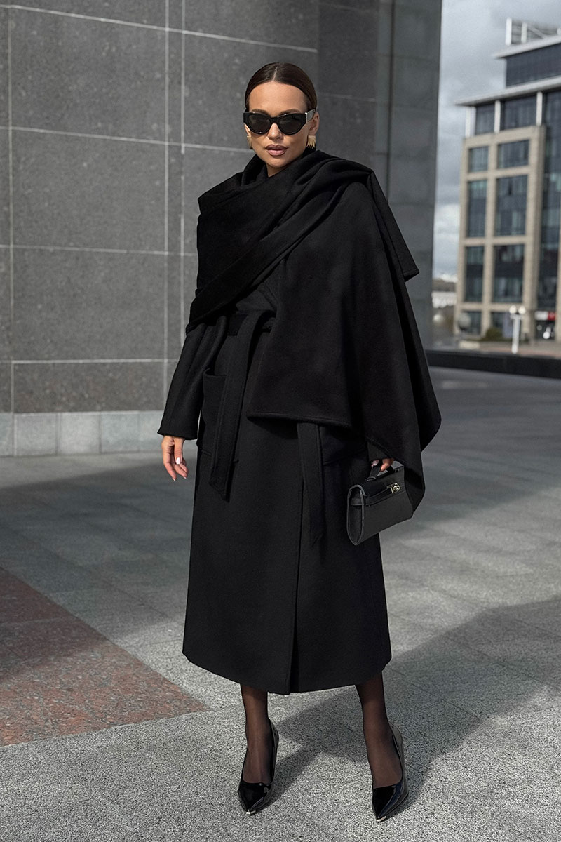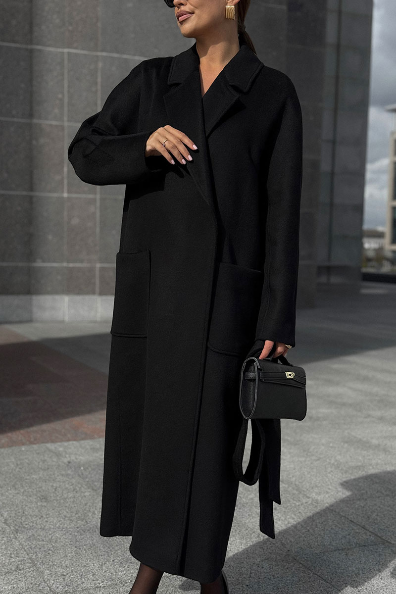 Пальто женское двубортное, выполнено из пальтовой ткани великолепного качества. Рукав спущенный, воротник стояче-отложной с отворотами лацканов. По переду накладные карманы, в комплекте пояс из основной ткани.