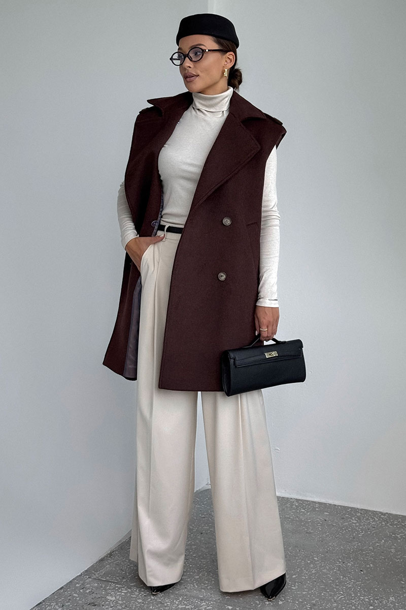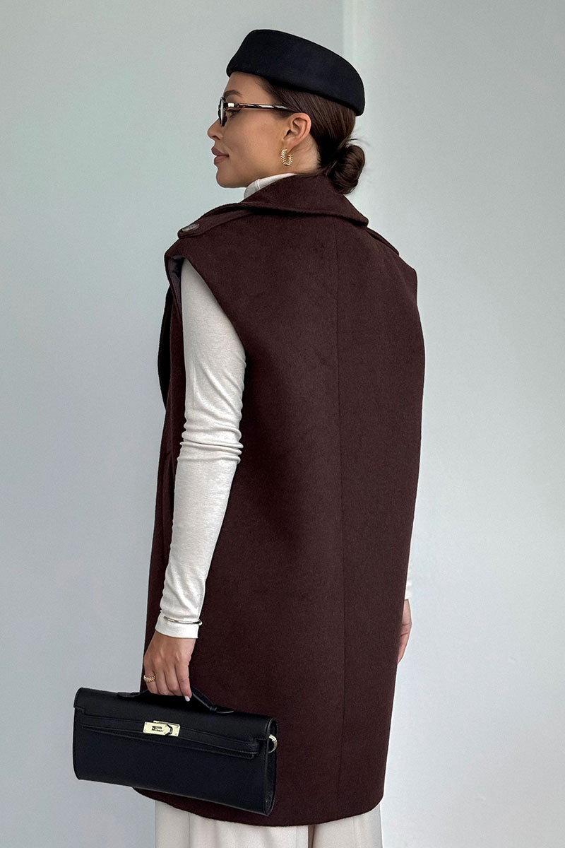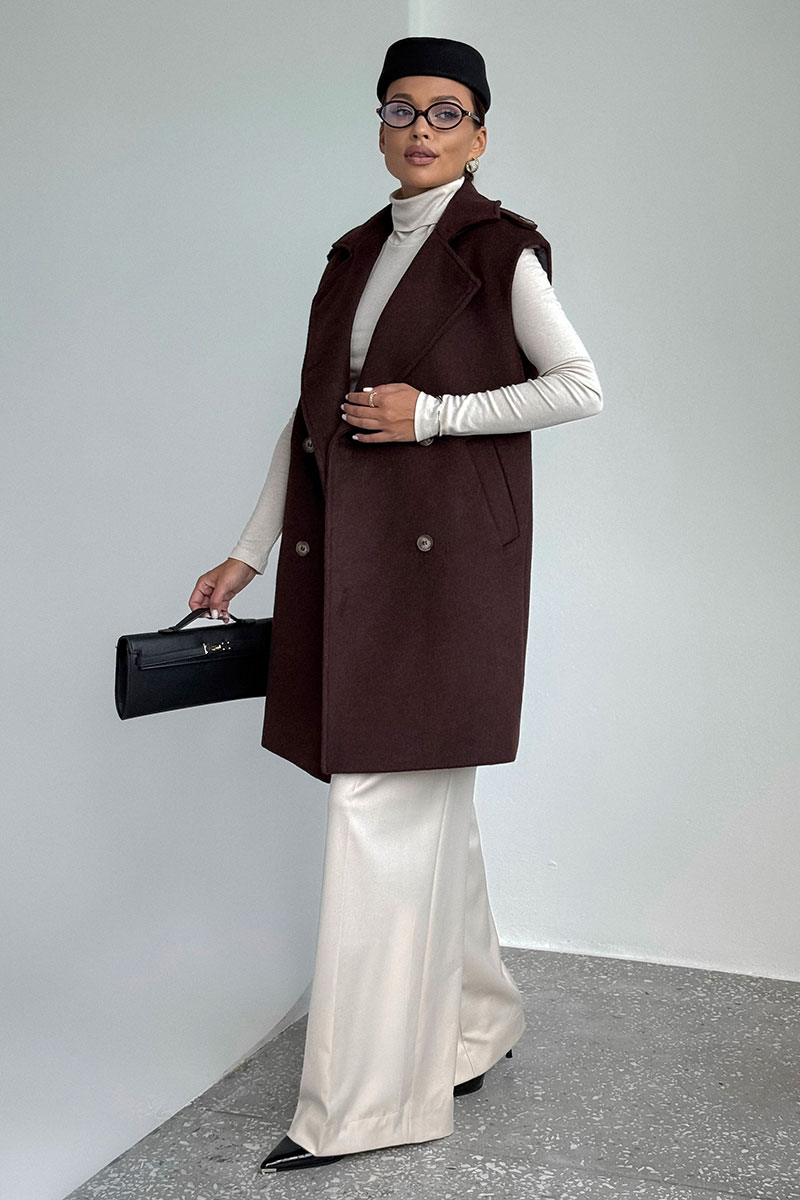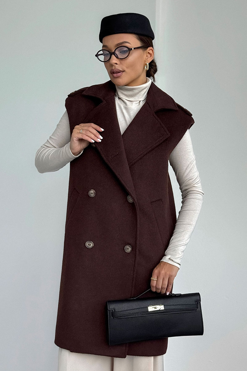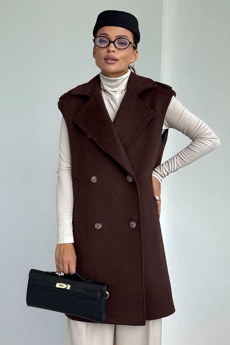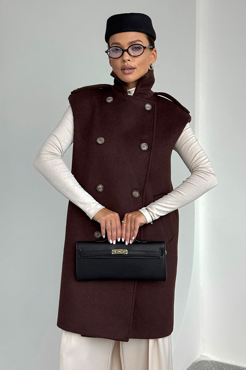 Жилет женский, выполнен из пальтовой ткани. Прямого силуэта, воротник стояче- отложной с отворотами лацканов. Застежка двубортная на петли и пуговицы. Линия плеча спущена, на плечевом шве отделочные паты. По переду жилета функциональные карманы. Жилет на вискозной подкладке.