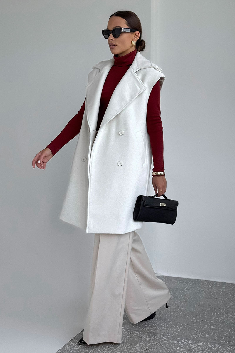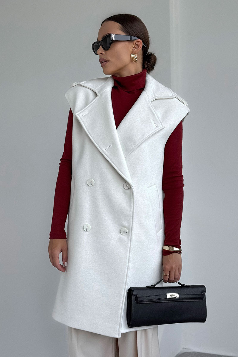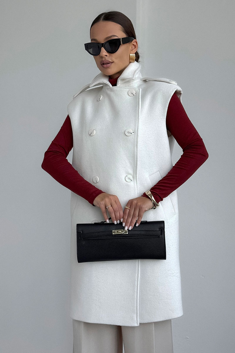 Жилет женский, выполнен из пальтовой ткани. Прямого силуэта, воротник стояче- отложной с отворотами лацканов. Застежка двубортная на петли и пуговицы. Линия плеча спущена, на плечевом шве отделочные паты. По переду жилета функциональные карманы. Жилет на вискозной подкладке.
