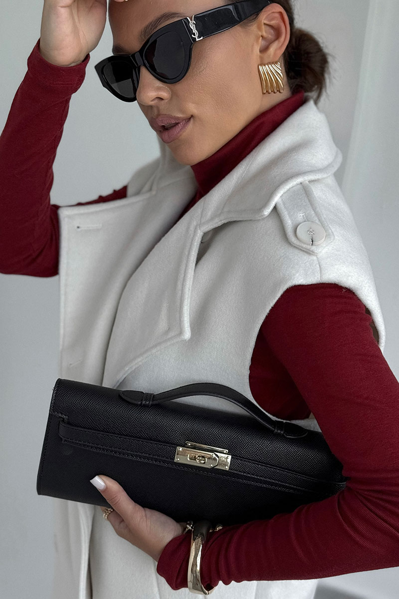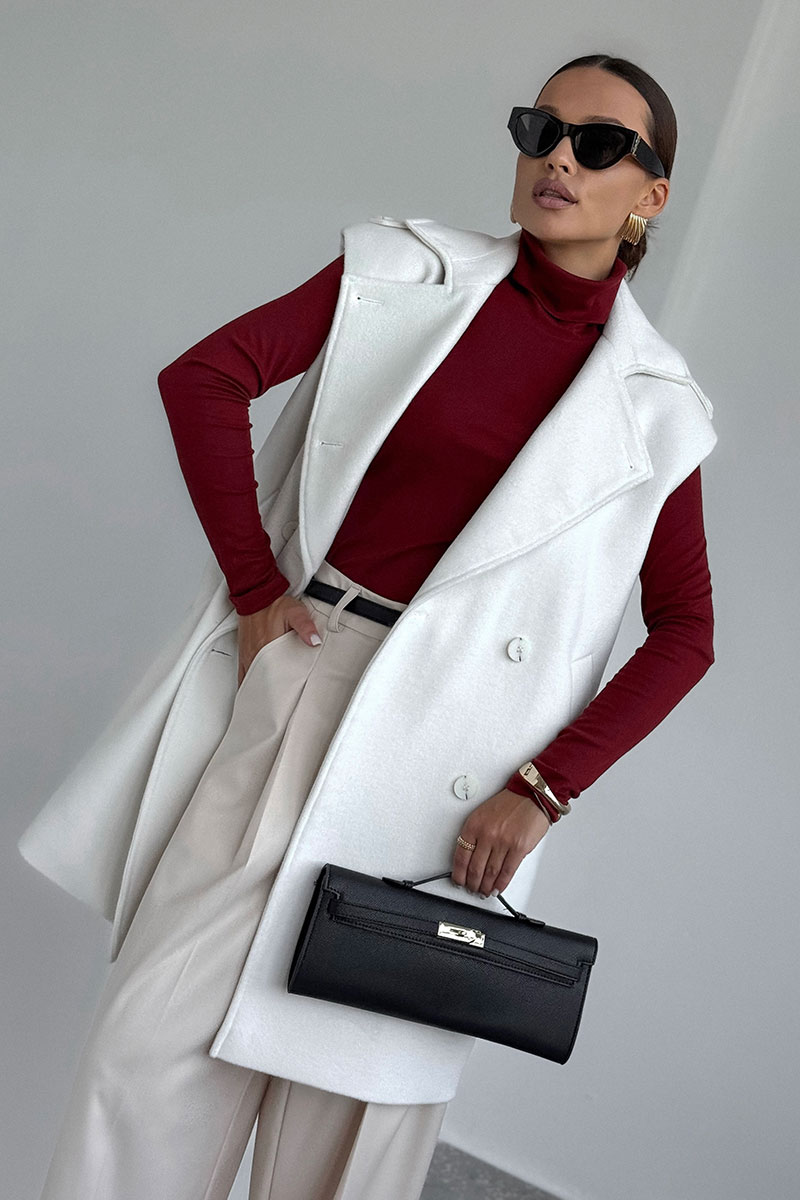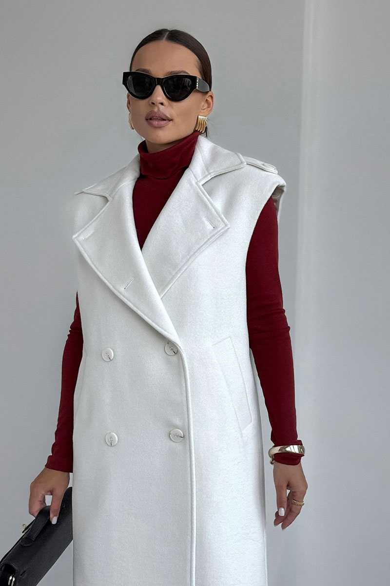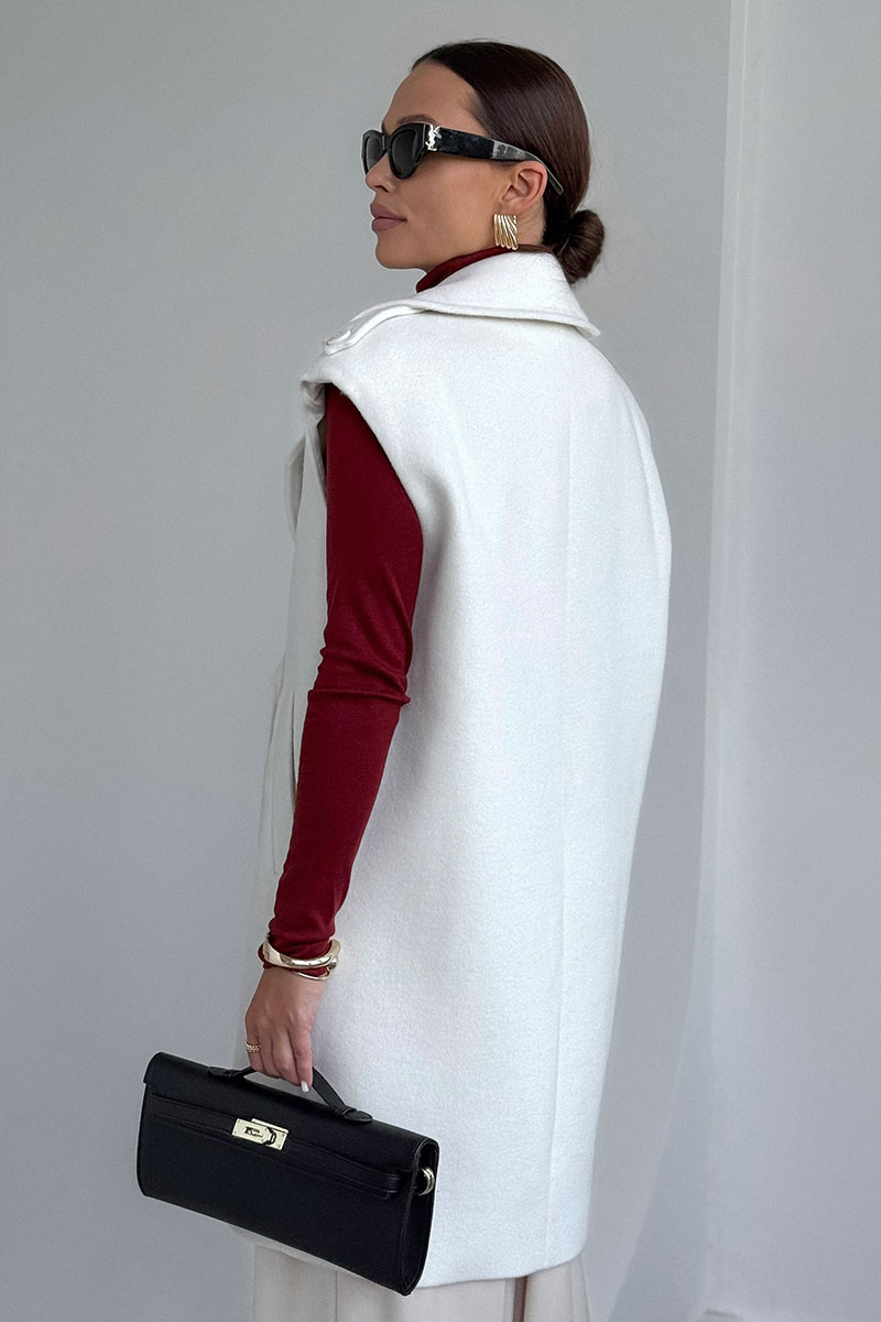 Жилет женский, выполнен из пальтовой ткани. Прямого силуэта, воротник стояче- отложной с отворотами лацканов. Застежка двубортная на петли и пуговицы. Линия плеча спущена, на плечевом шве отделочные паты. По переду жилета функциональные карманы. Жилет на вискозной подкладке.