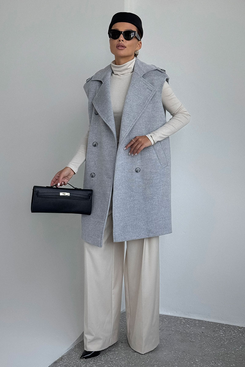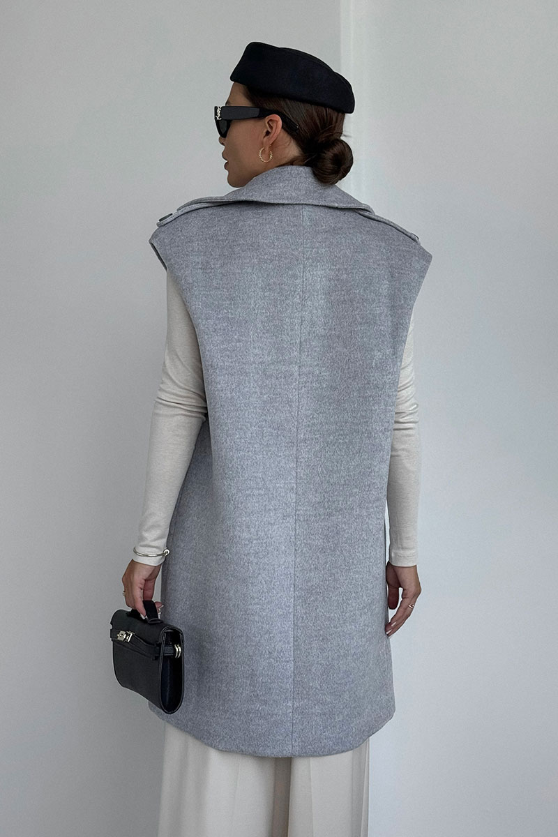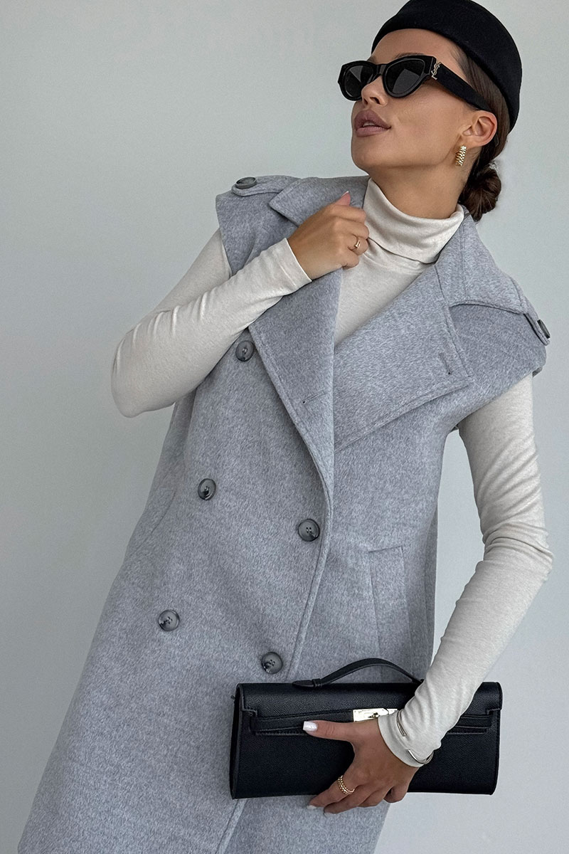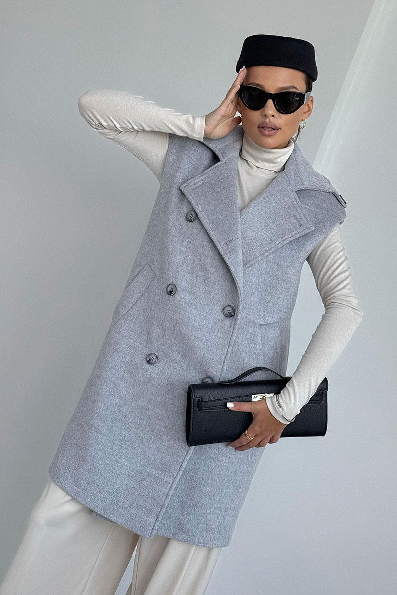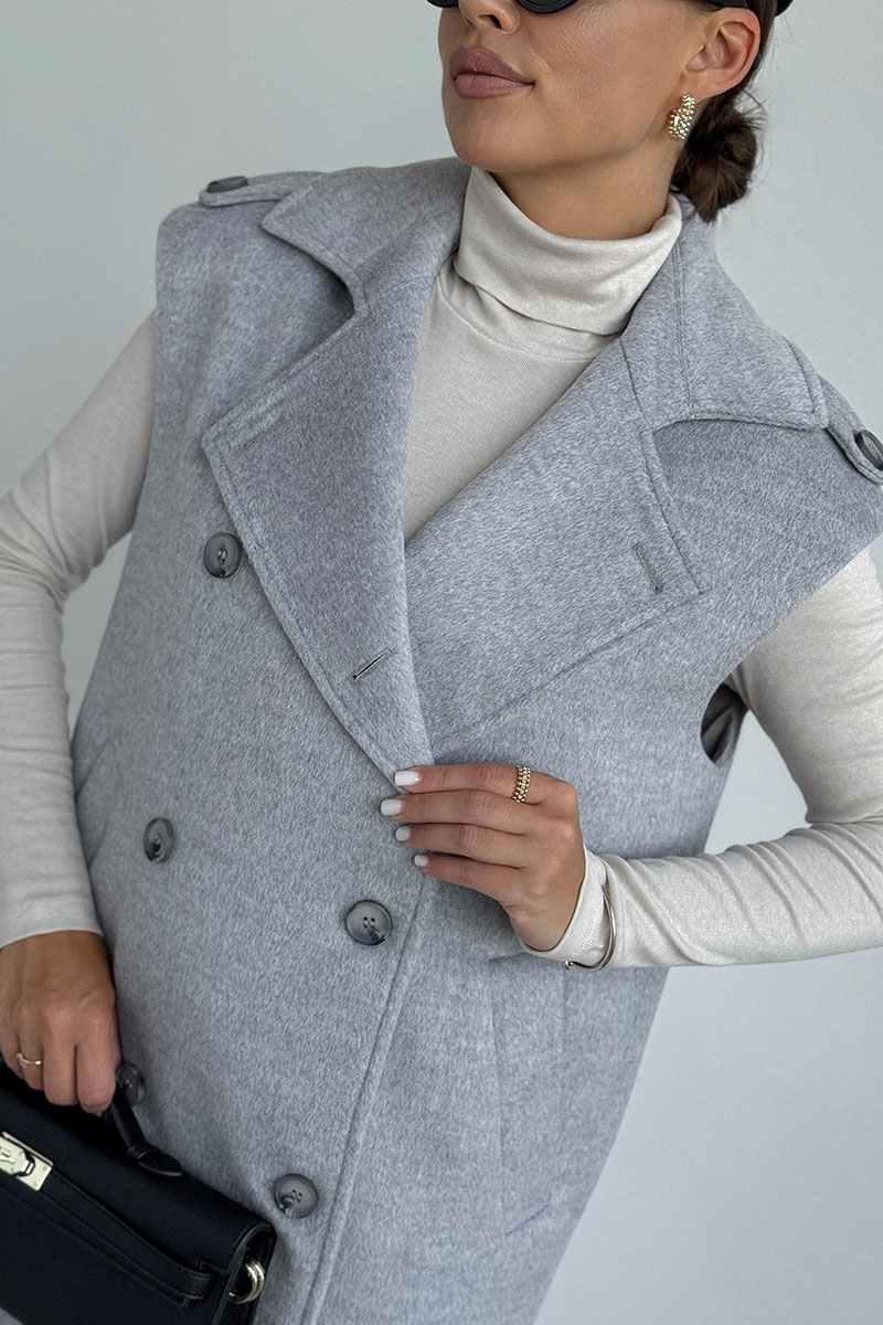 Жилет женский, выполнен из пальтовой ткани. Прямого силуэта, воротник стояче- отложной с отворотами лацканов. Застежка двубортная на петли и пуговицы. Линия плеча спущена, на плечевом шве отделочные паты. По переду жилета функциональные карманы. Жилет на вискозной подкладке.