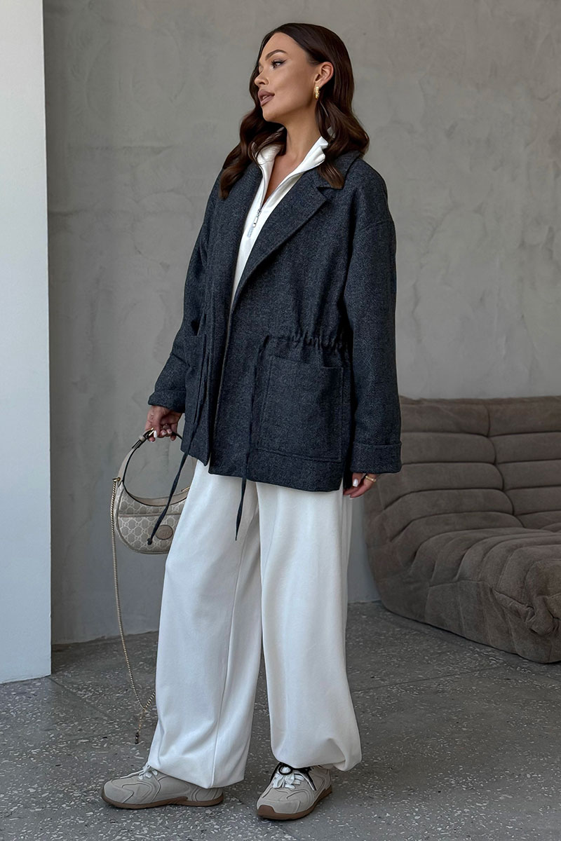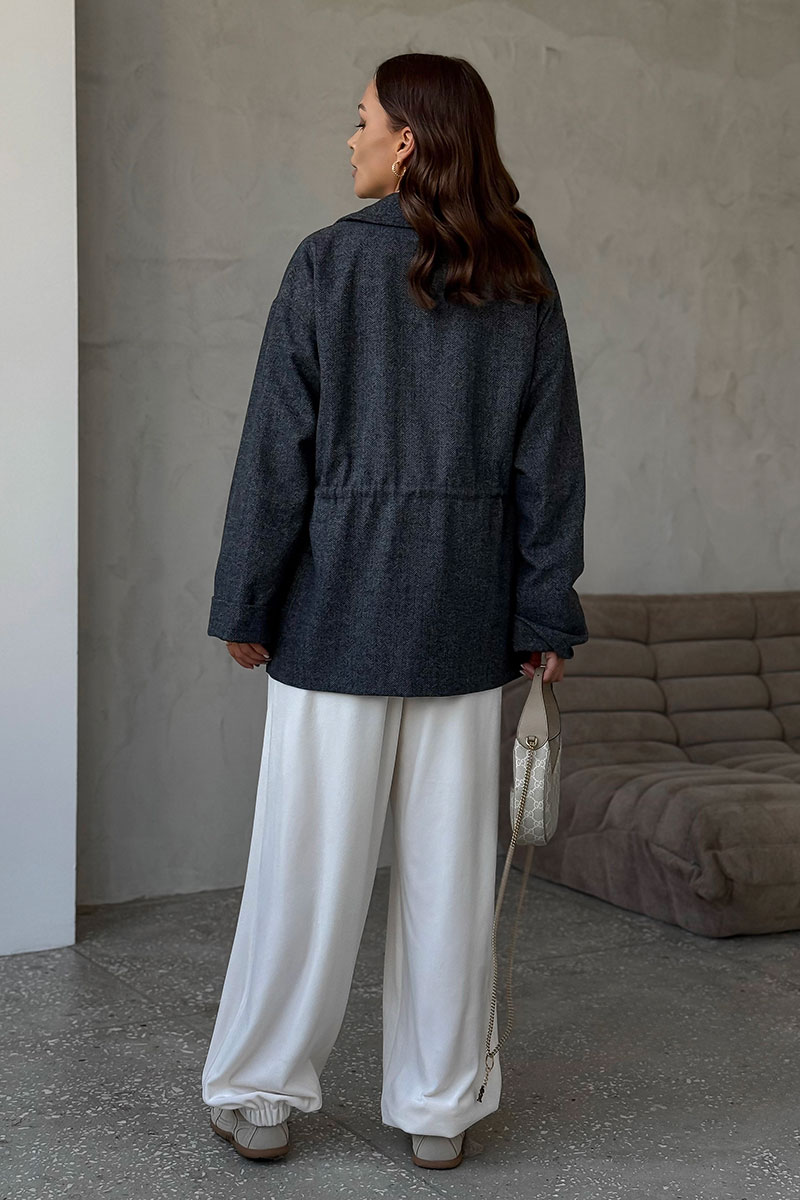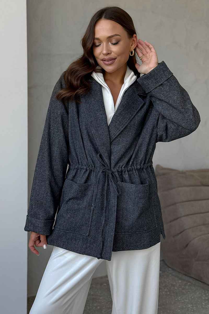 Жакет женский прямого силуэта, выполнен из облегченной пальтовой ткани в состав которой входит в шерсть. Линия плеча спущена, по низу рукава отложная манжета. Воротник стояче-отложной с от воротами лацканов. Застежка в виде кулисы, по переду жакета накладные карманы, по боковым швам внизу фигурные разрезы. Жакет на вискозной подкладке.