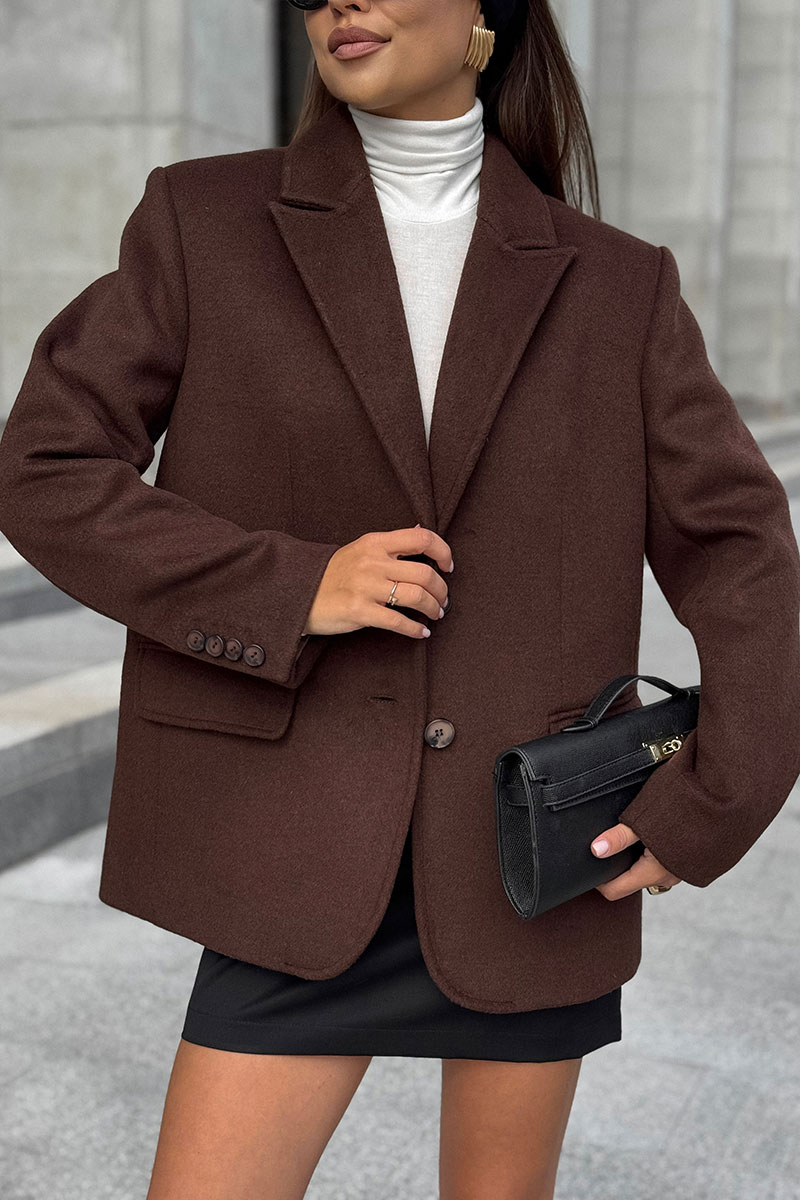 Жакет женский однобортный, выполнен из пальтовой ткани великолепного качества. Рукав втачной двухшовный со шлицей, воротник стояче-отложной с отворотами лацканов. Застежка центральная на петли пуговицы. По переду прорезные карманы с клапаном.