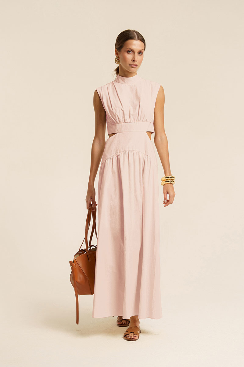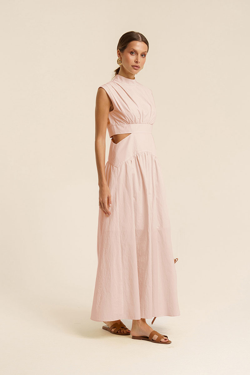 Платье женское приталенного силуэта из хлопковой ткани с эффектом "крэш". Вырез горловины оформлен воротником-стойкой. Застежка со стороны спинки в среднем шве на молнию в области талии и петлю с пуговицей в воротнике. Изделие посажено на хлопковую подкладку. По бокам- декоративные элементы в виде прорезей. На верхней части и юбке выполнена мягкая сборка.