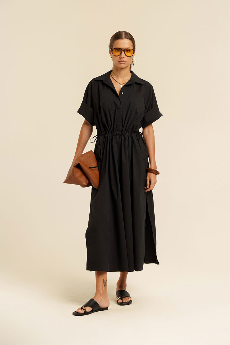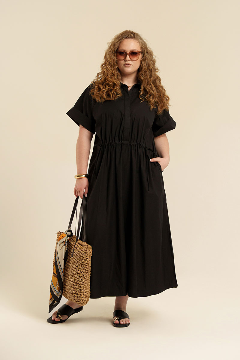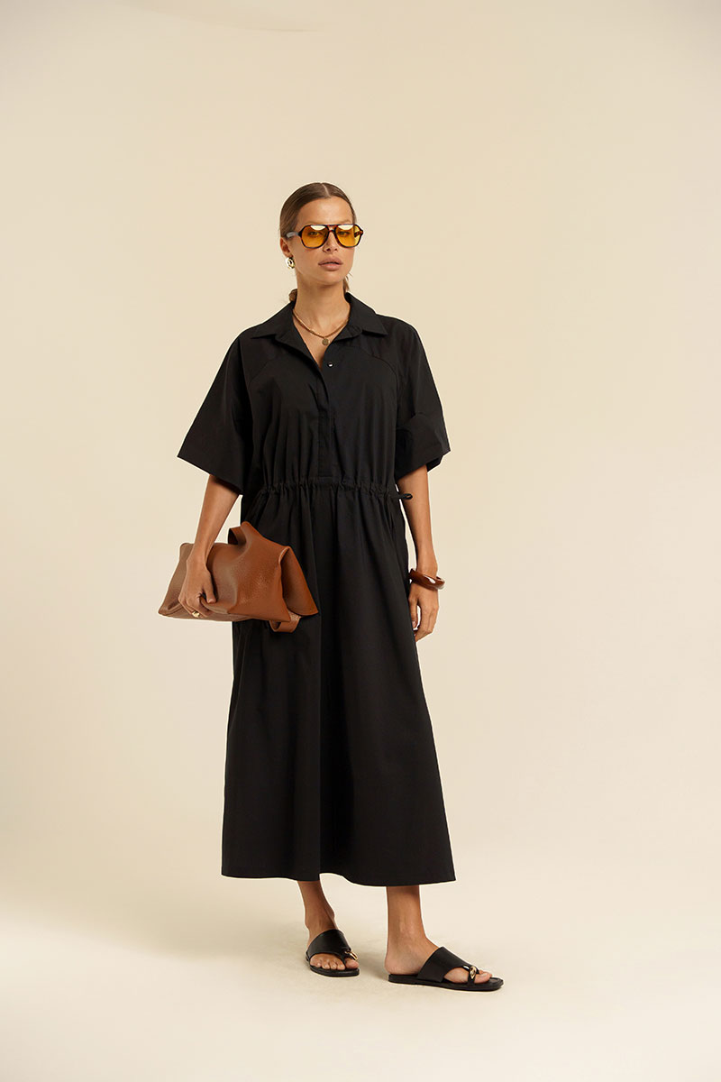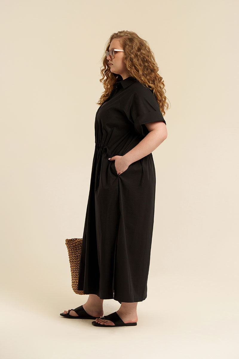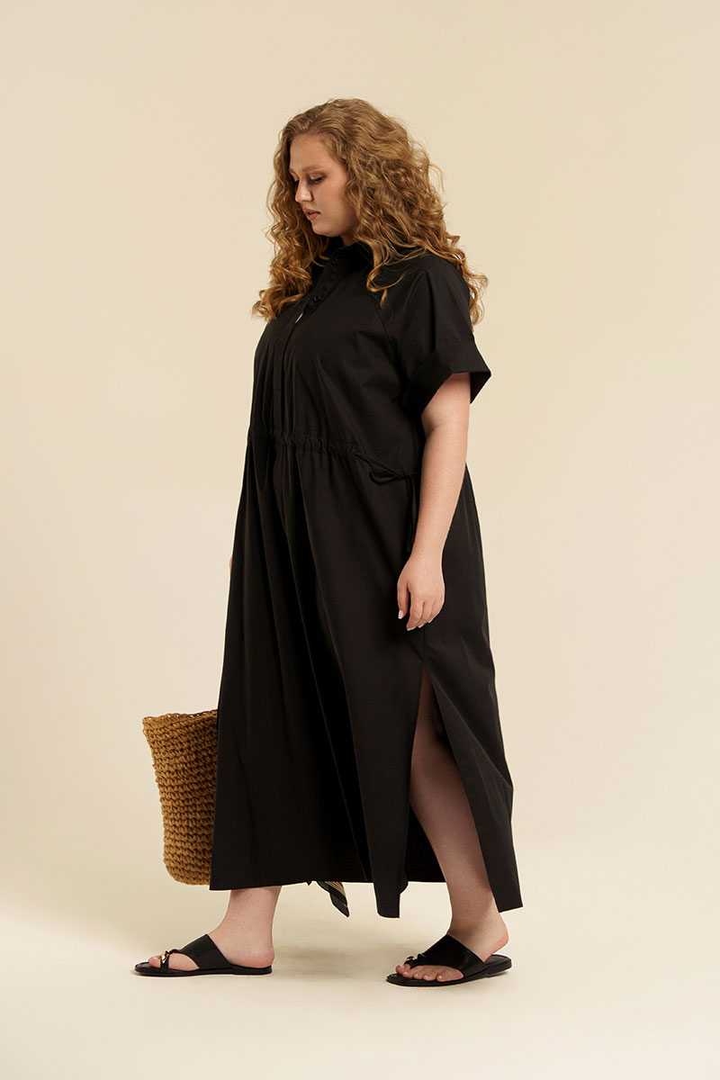 Платье женское свободного покроя из хлопковой ткани. Вырез горловины оформлен воротником рубашечного типа. Застежка- планка с потайными пуговицами. Рукава- реглан, переходящий в кокетки. На спинке- небольшая сборка в области лопаток. Имеются карманы в бок
