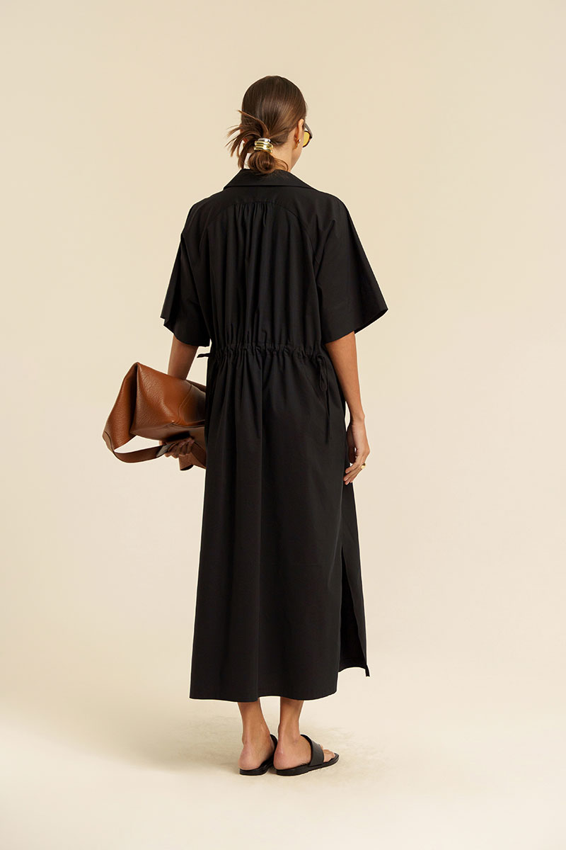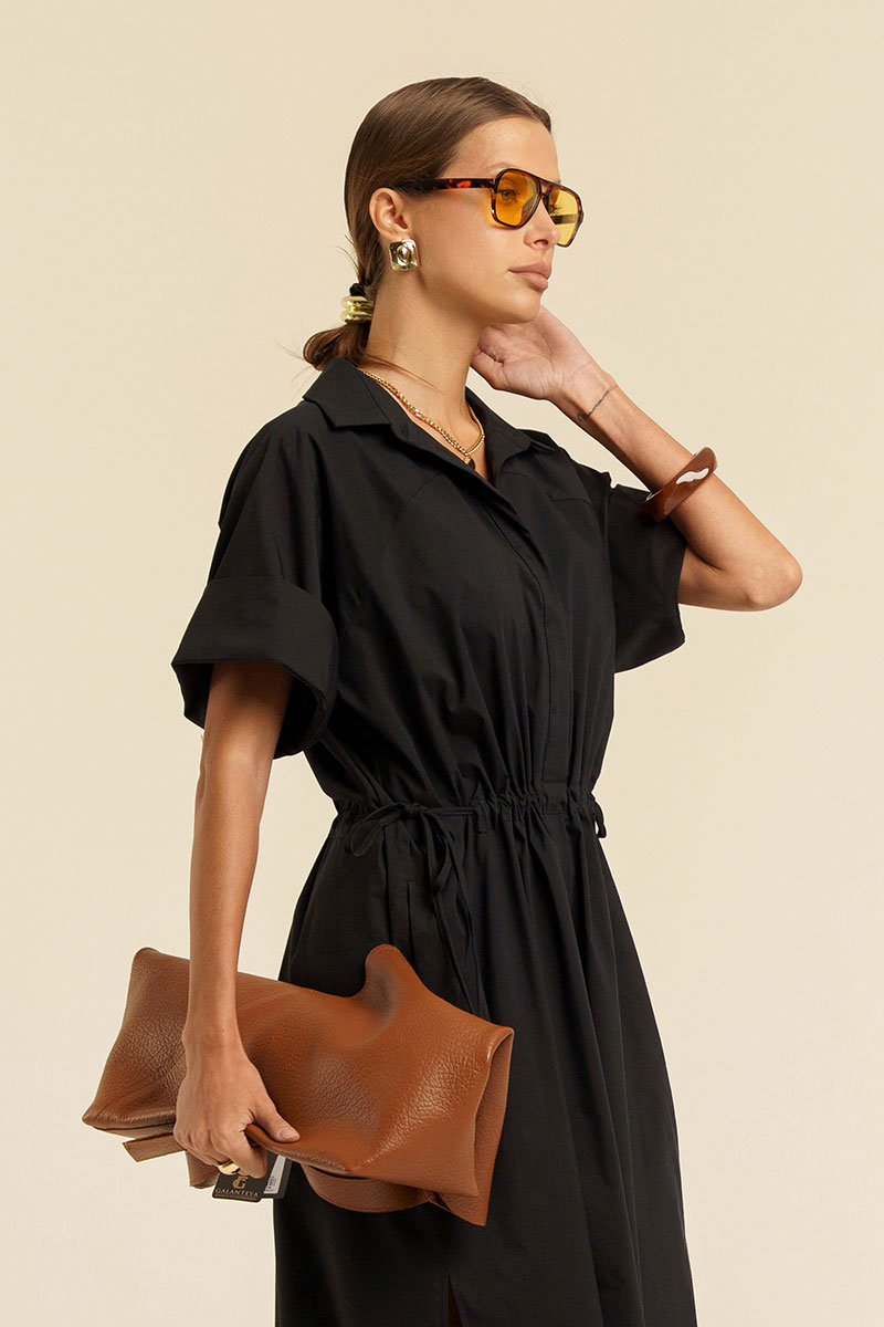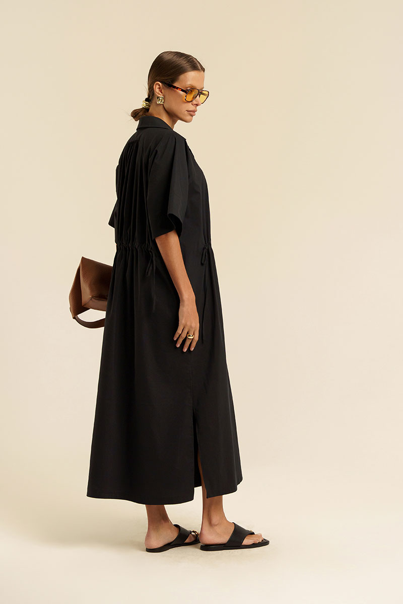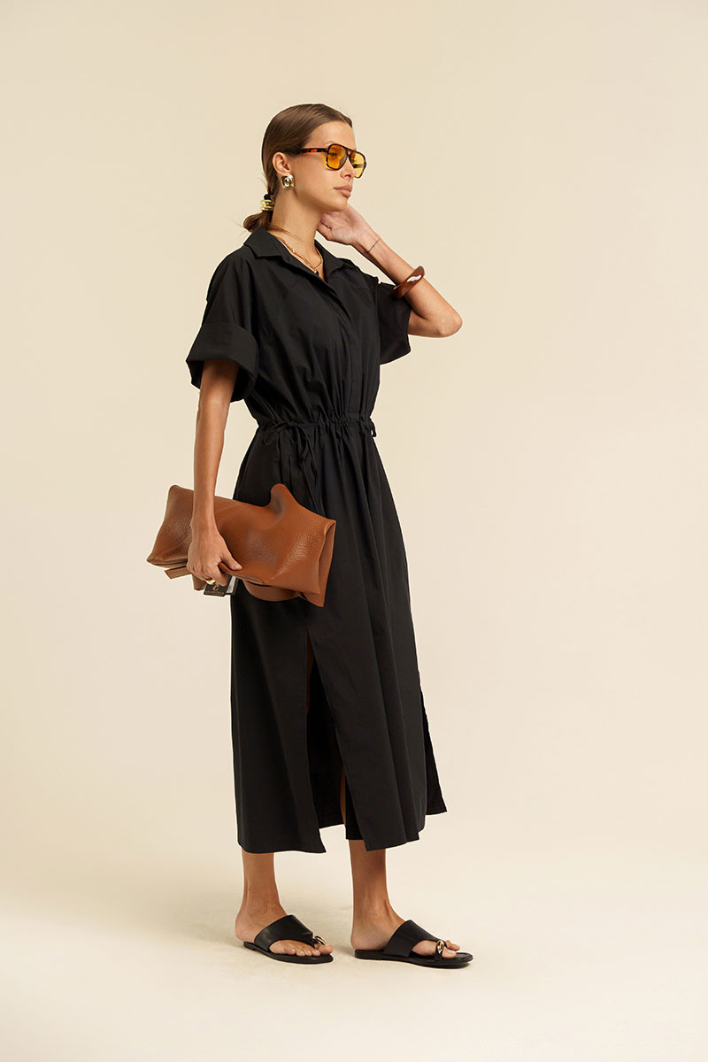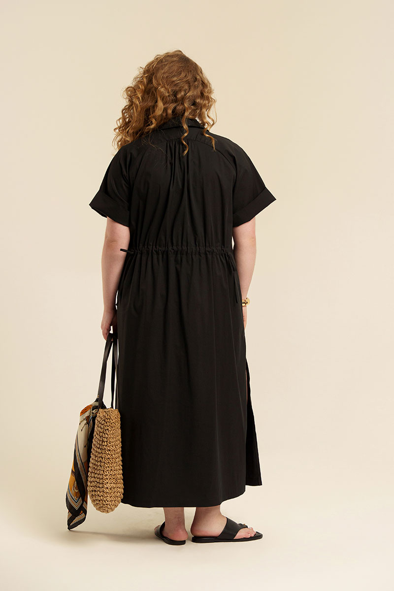 Платье женское свободного покроя из хлопковой ткани. Вырез горловины оформлен воротником рубашечного типа. Застежка- планка с потайными пуговицами. Рукава- реглан, переходящий в кокетки. На спинке- небольшая сборка в области лопаток. Имеются карманы в бок