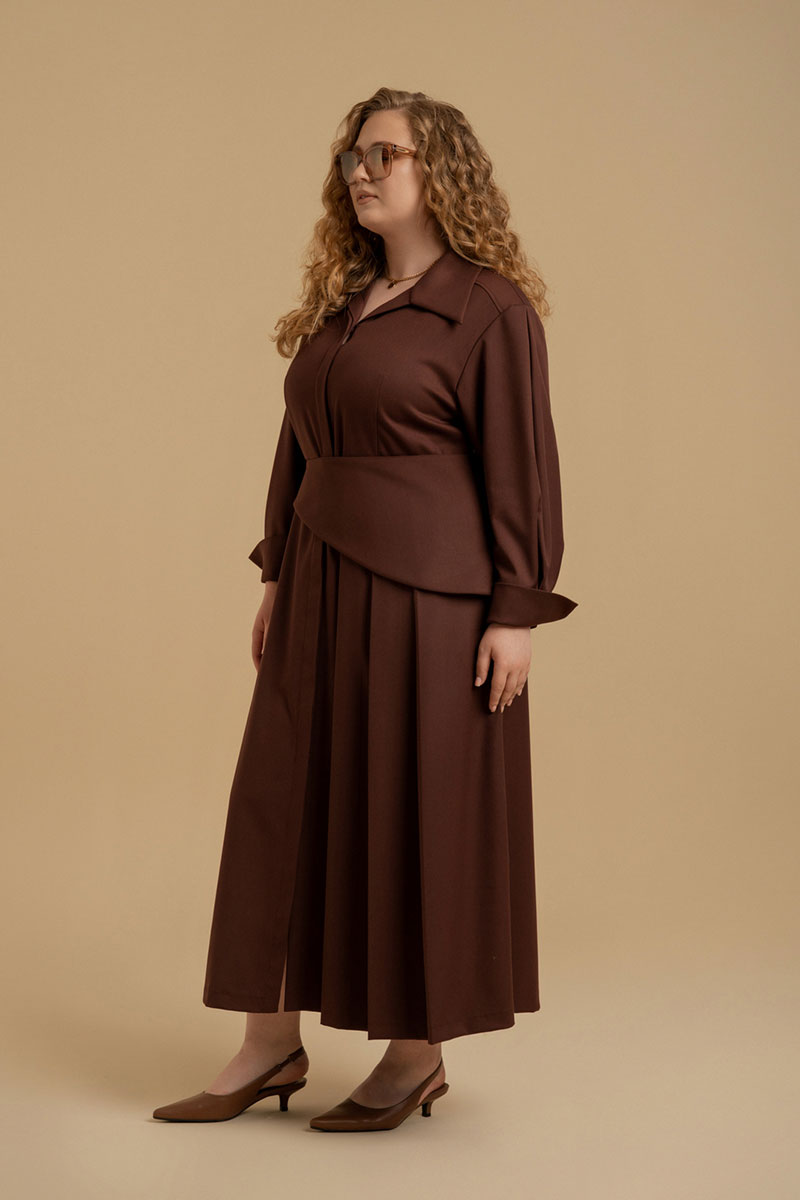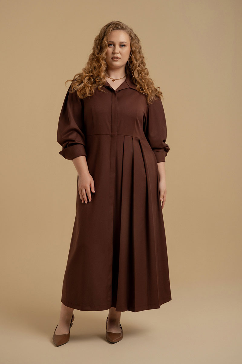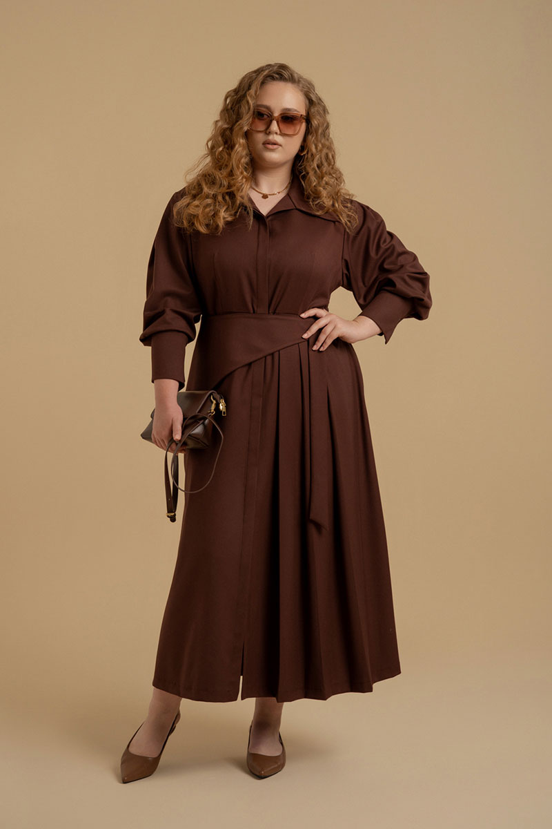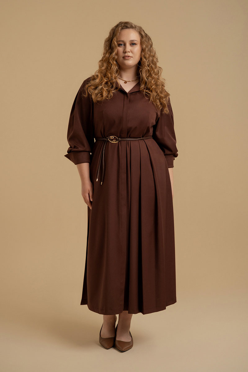 Платье женское приталенного силуэта из костюмной ткани. Вырез горловины оформлен воротником рубашечного типа. Застежка - потайная на петли с пуговицами. Рукава - втачные с мягкой складкой в области оката. Низа посажены на отрезные манжеты с застежкой на петли с пуговицами. Отрезное по линии талии. В боковых швах имеются карманы. Справа выполнен разрез, слева - складки. Изделие декорировано съемной баской.
