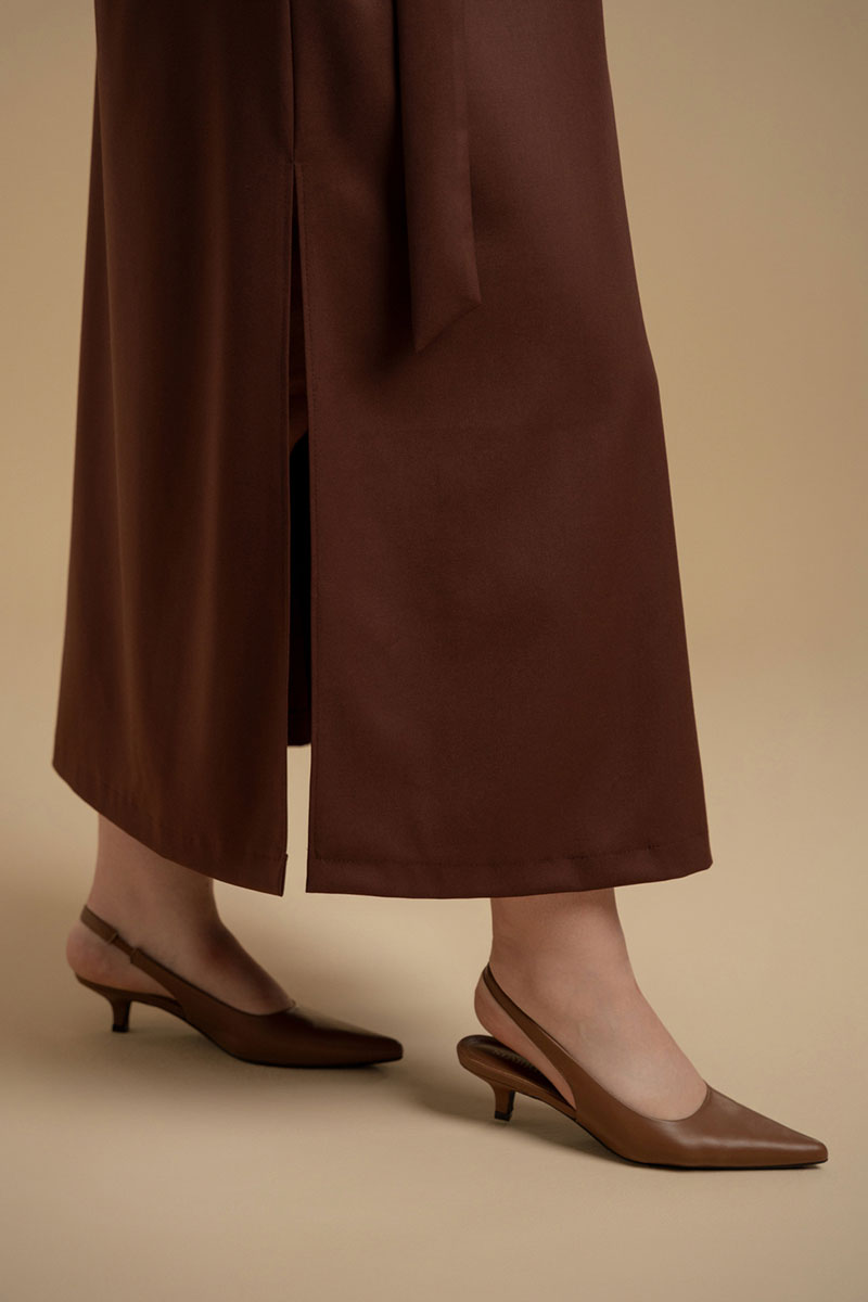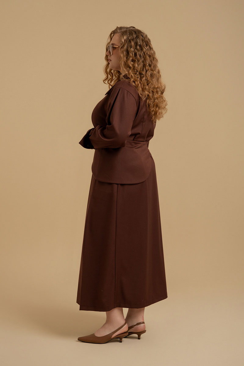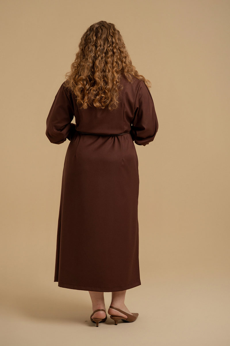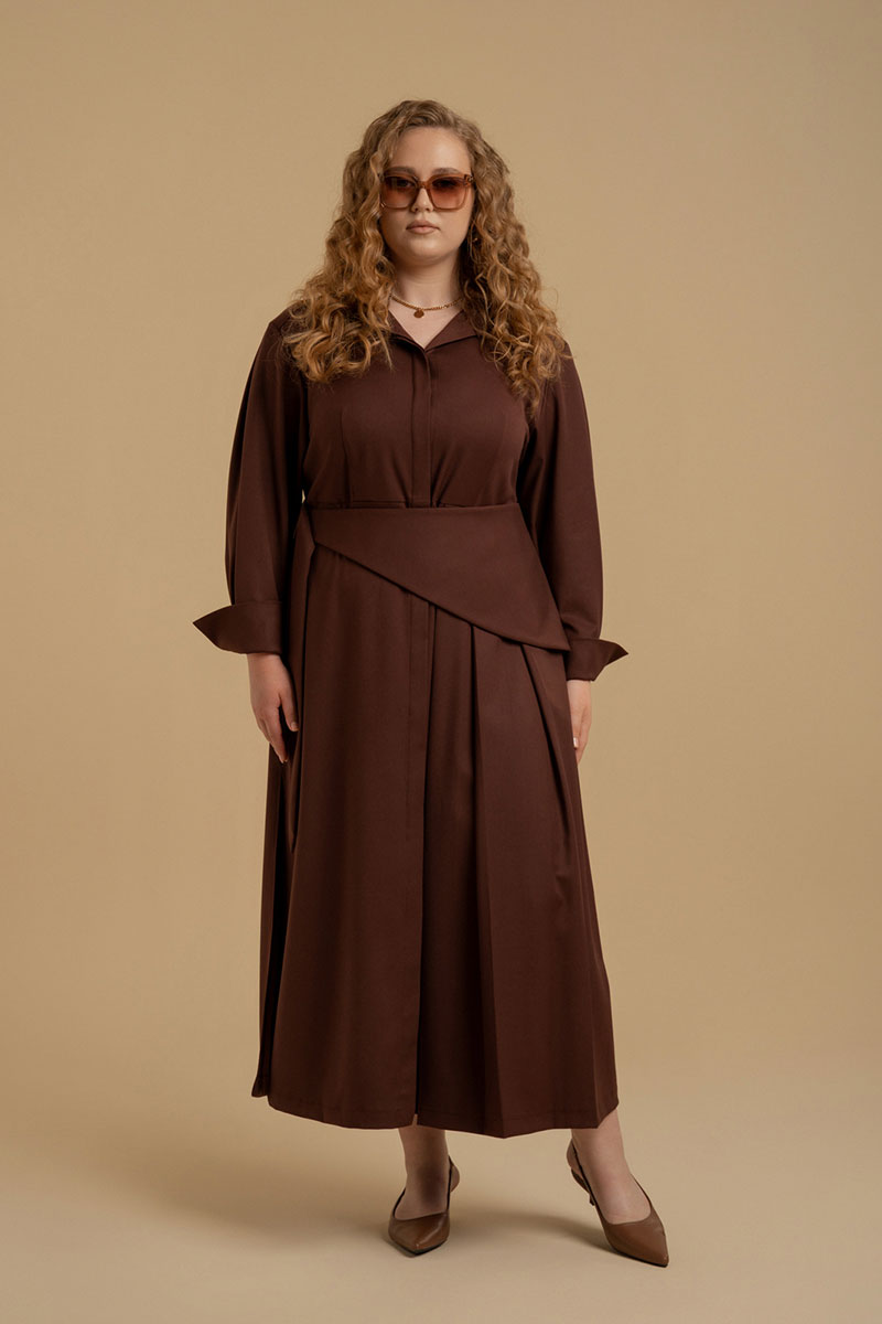 Платье женское приталенного силуэта из костюмной ткани. Вырез горловины оформлен воротником рубашечного типа. Застежка - потайная на петли с пуговицами. Рукава - втачные с мягкой складкой в области оката. Низа посажены на отрезные манжеты с застежкой на петли с пуговицами. Отрезное по линии талии. В боковых швах имеются карманы. Справа выполнен разрез, слева - складки. Изделие декорировано съемной баской.