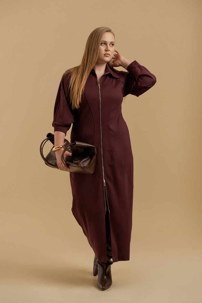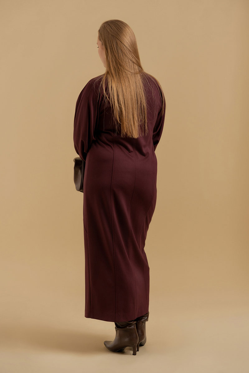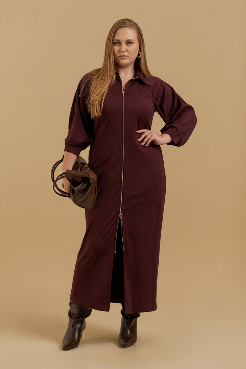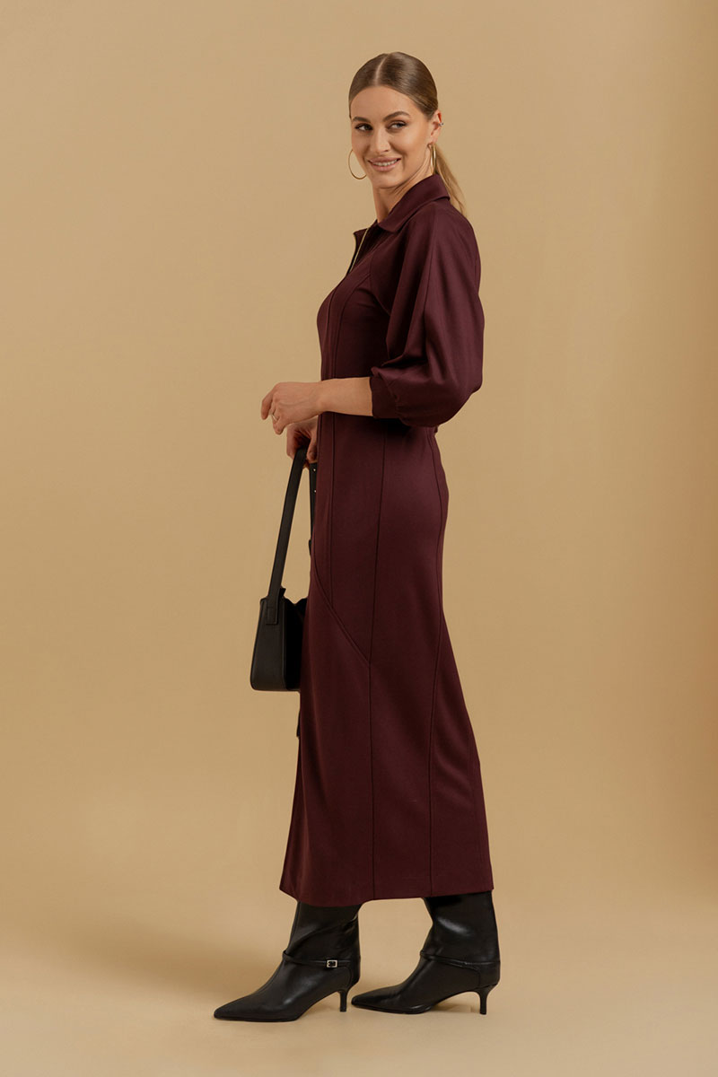 Платье женское прилегающего силуэта из трикотажного полотна. Вырез горловины оформлен воротником рубашечного типа. Застежка - молния. Рукава - реглан со сложными архитектурными формами. Приталивание достигается фигурными рельефами.