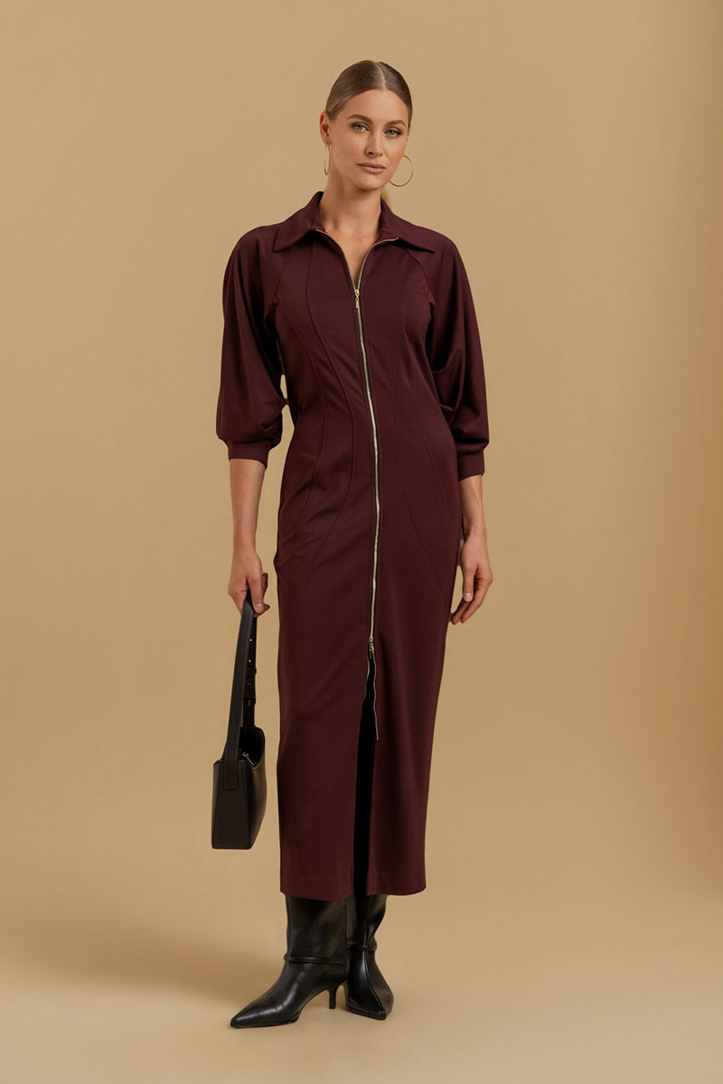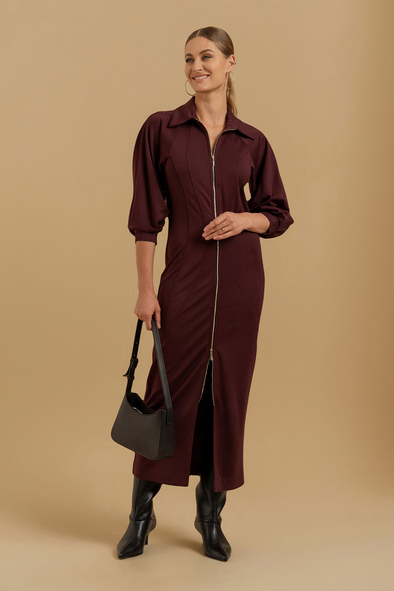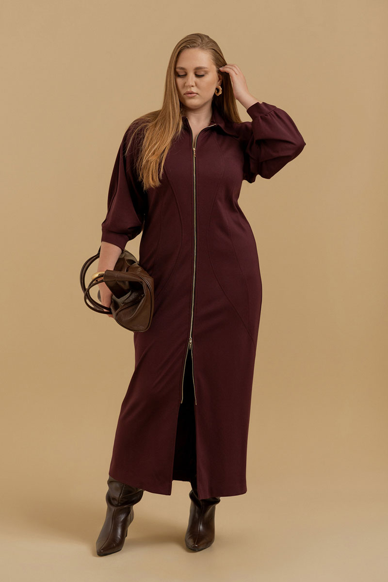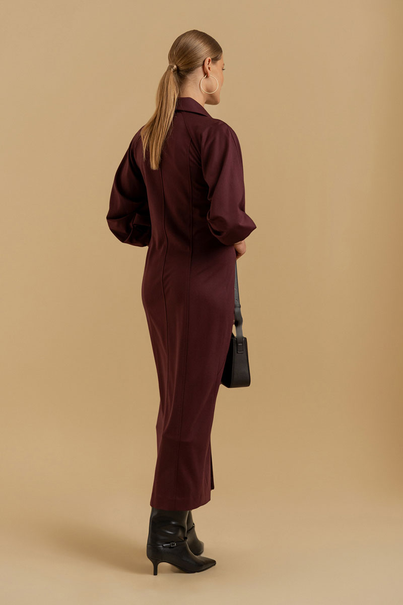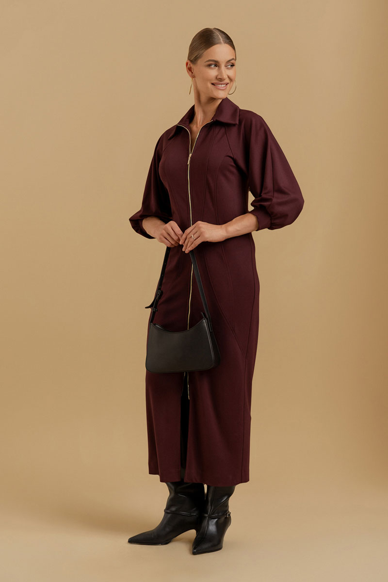 Платье женское прилегающего силуэта из трикотажного полотна. Вырез горловины оформлен воротником рубашечного типа. Застежка - молния. Рукава - реглан со сложными архитектурными формами. Приталивание достигается фигурными рельефами.