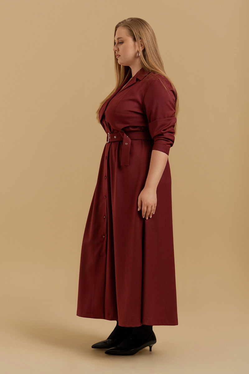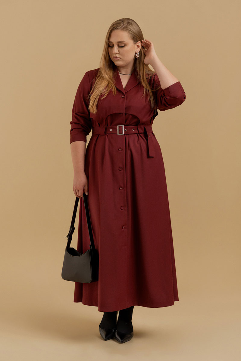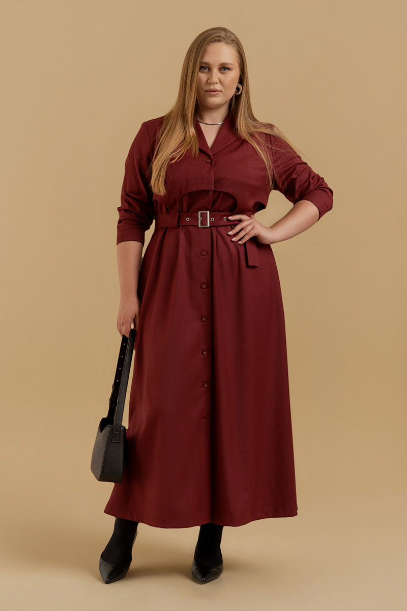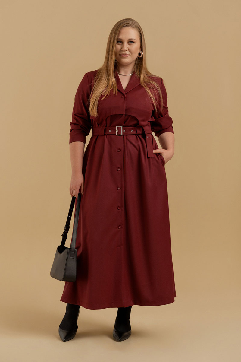 Платье женское А - силуэта из костюмной ткани. Вырез горловины оформлен воротником пиджачного типа с застежкой на петли с пуговицами. Рукава - втачные. В боковых швах выполнены карманы. Спереди и сзади изделие декорировано кокетками сложной архитектурной формы. При помощи пояса из основной ткани возможно создать приталенный силуэт.