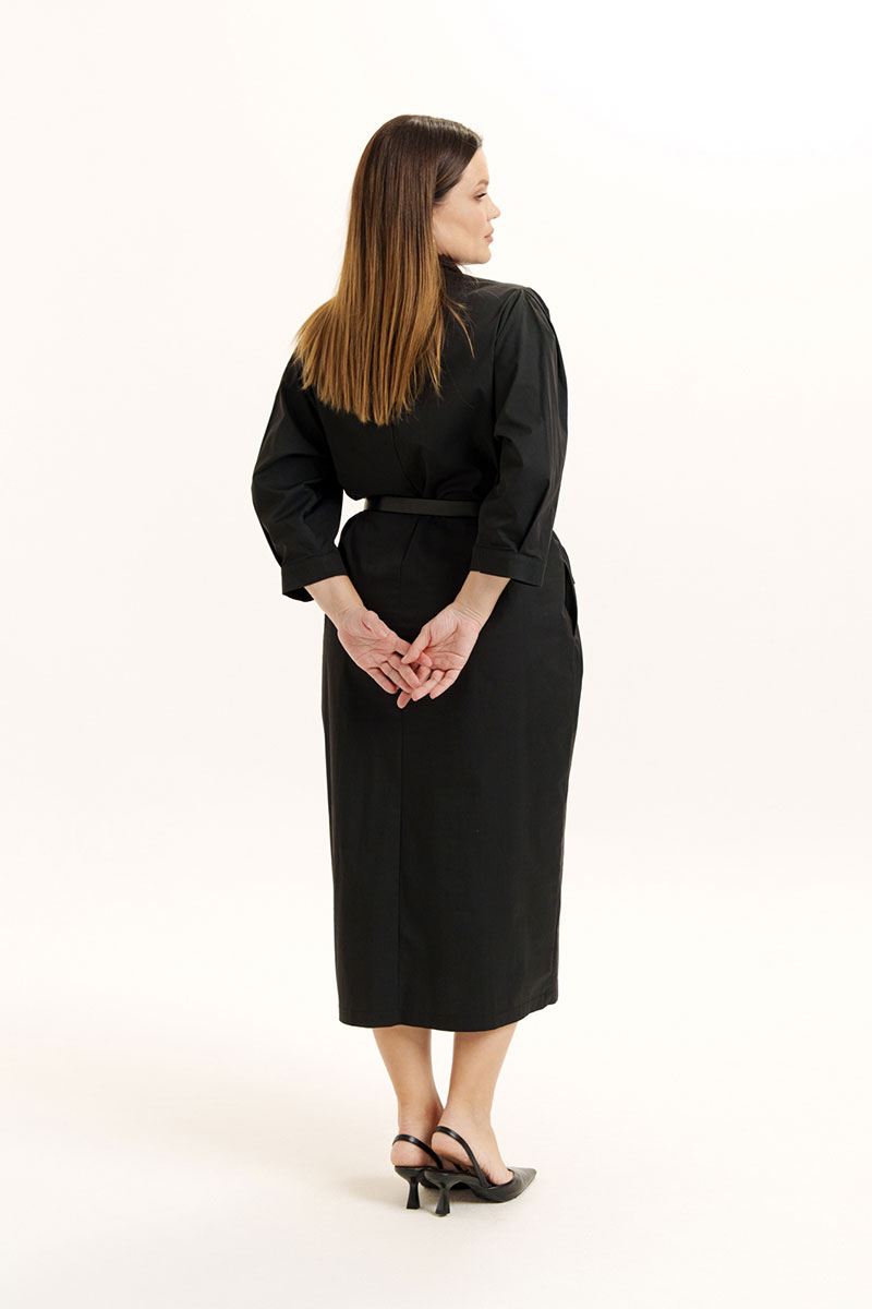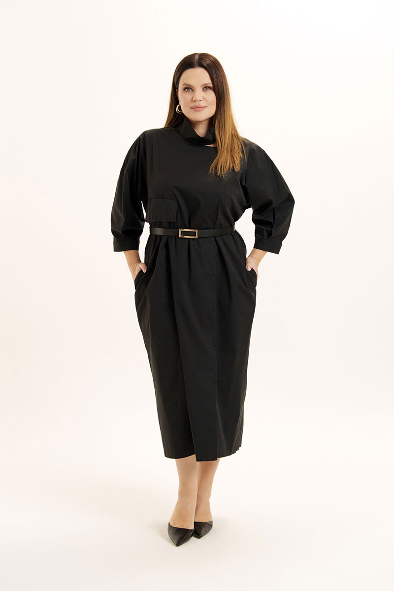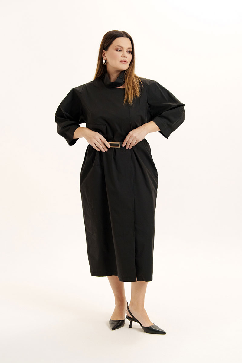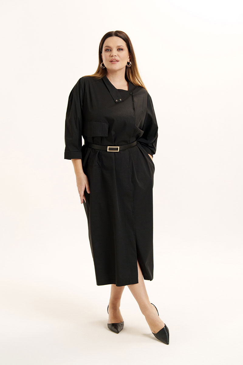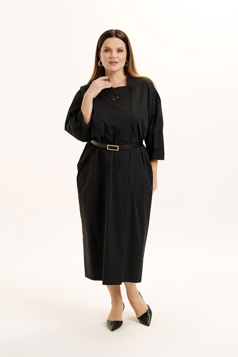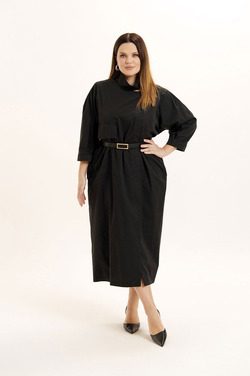 Платье женское свободного покроя из легкой хлопковой ткани. Вырез горловины оформлен воротником стойкой, застежка смещена, на петли -пуговицы и частично кнопки. На правой полочке объемный накладной карман и клапан. В боковых швах расположены функциональные карманы. Рукава слегка спущенные с мягкими складками по окату и по низу, манжет отрезной. Изделие дополнено съемным поясом.