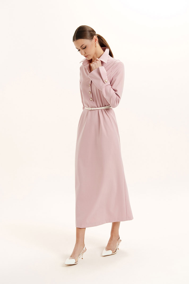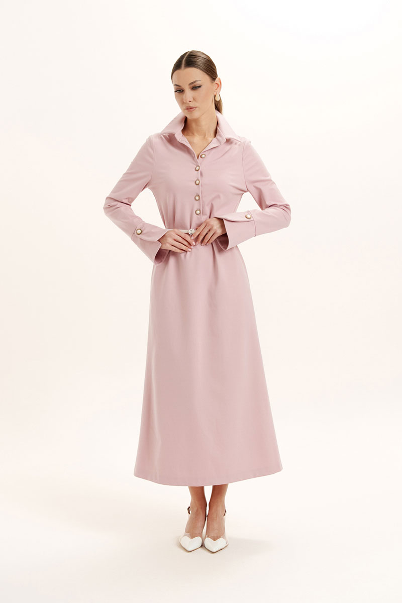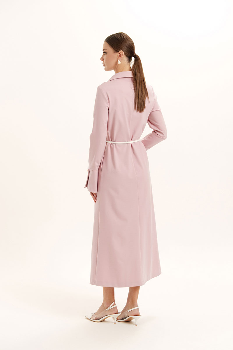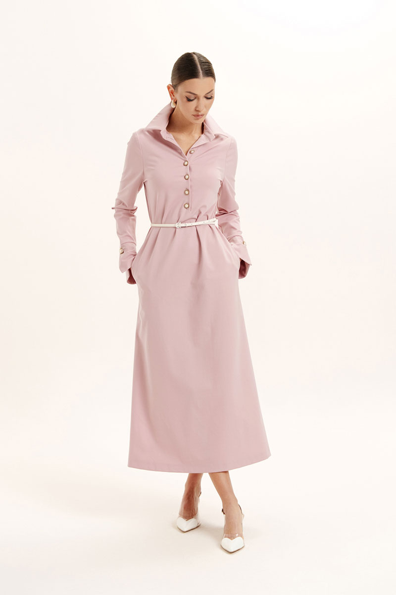 Платье прямого силуэта из мягкого трикотажа слегка расширенного к низу, с втачным одношовным рукавом на высокой манжете с застежкой на петлю и пуговицу. Воротник рубашечного типа с отрезной стойкой. По переду обработана застежка - планка на петли и декоративные пуговицы. Спинка со средним швом. В боковых швах обработаны карманы. В комплект входит съемный пояс.