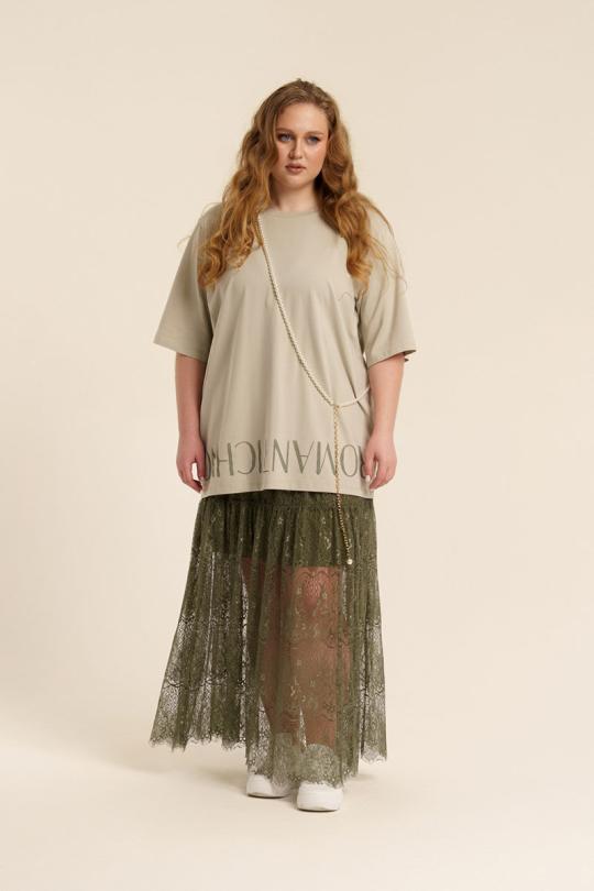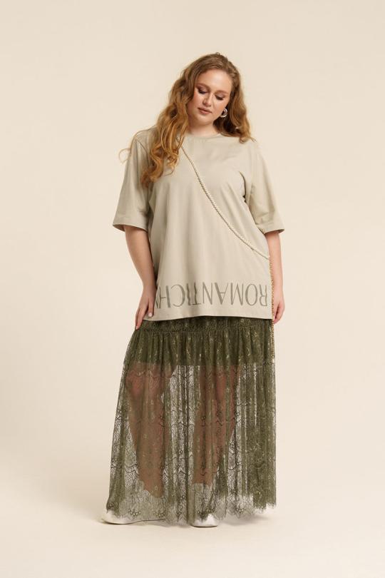 Футболка из хлопкового трикотажного полотна объемной формы с дизайнерским принтом спереди. Вырез горловины- неглубокий округлой формы.