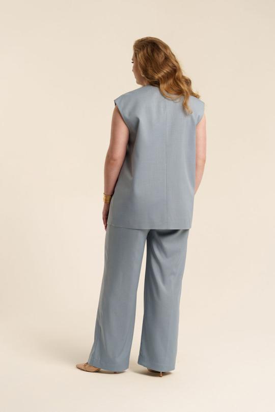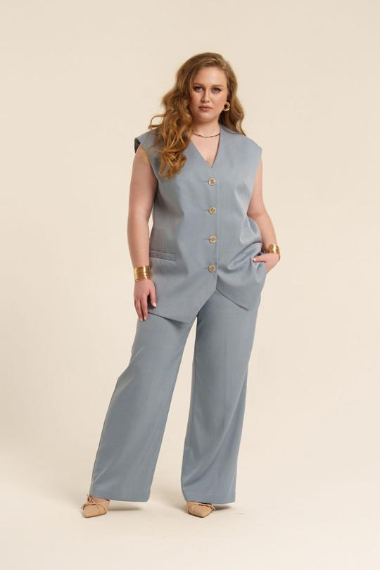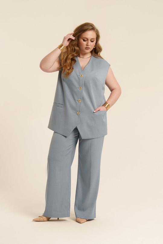 Жилет свободного покроя со спущенной линией плеча. Спереди имеются прорезные карманы. Вырез горловины- V-образной формы. Застежка- однобортная на петли с пуговицами.
