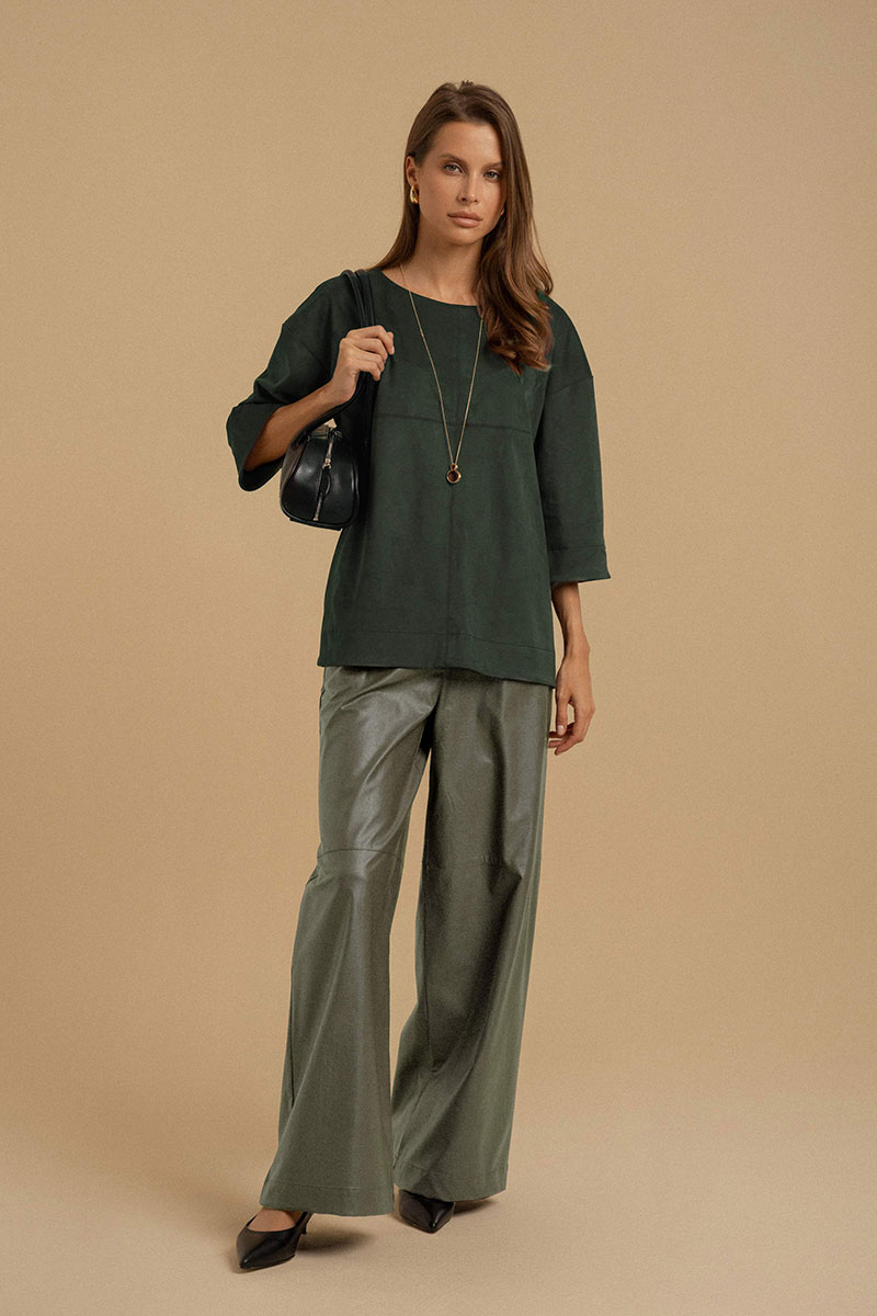 Блузка свободного покроя из искусственной замши. Вырез горловины - неглубокий, округлой формы. Рукава - втачные со спущенной линией плеча. Изделие декорировано подрезами. Низа с широкой подгибкой и отделочными строчками.