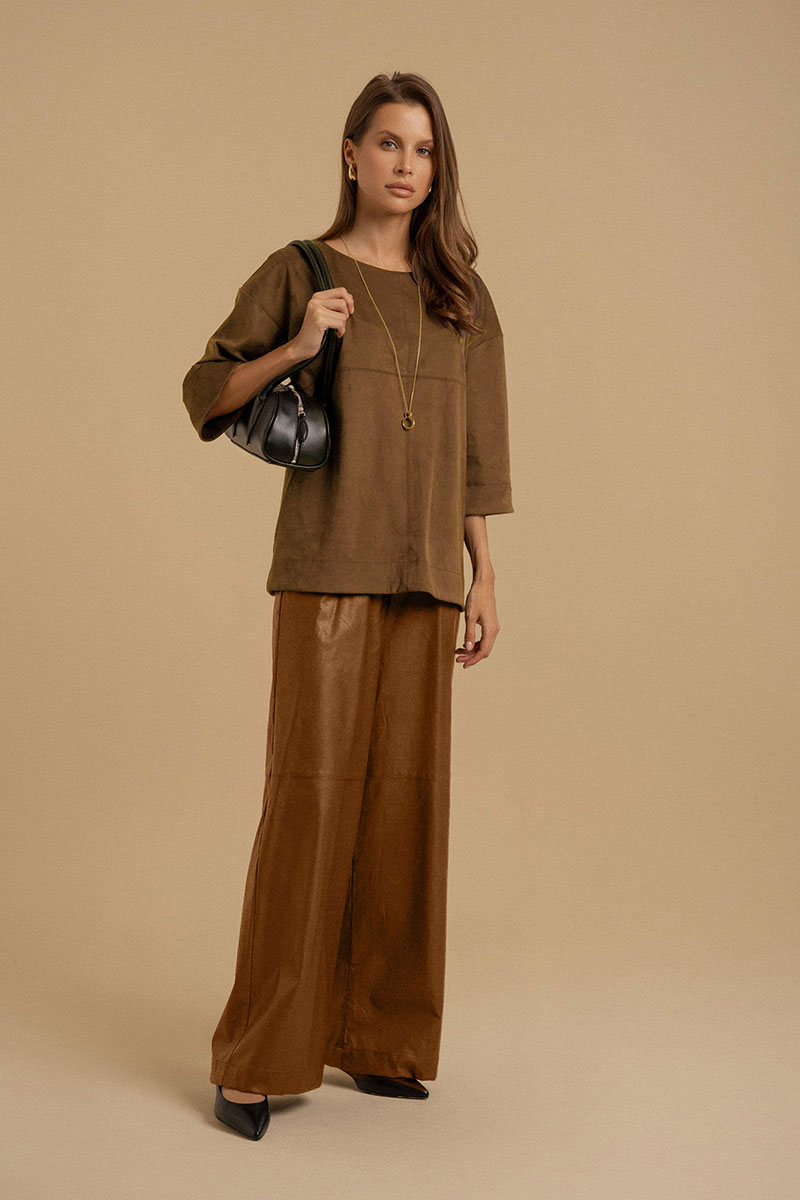 Блузка свободного покроя из искусственной замши. Вырез горловины - неглубокий, округлой формы. Рукава - втачные со спущенной линией плеча. Изделие декорировано подрезами. Низа с широкой подгибкой и отделочными строчками.