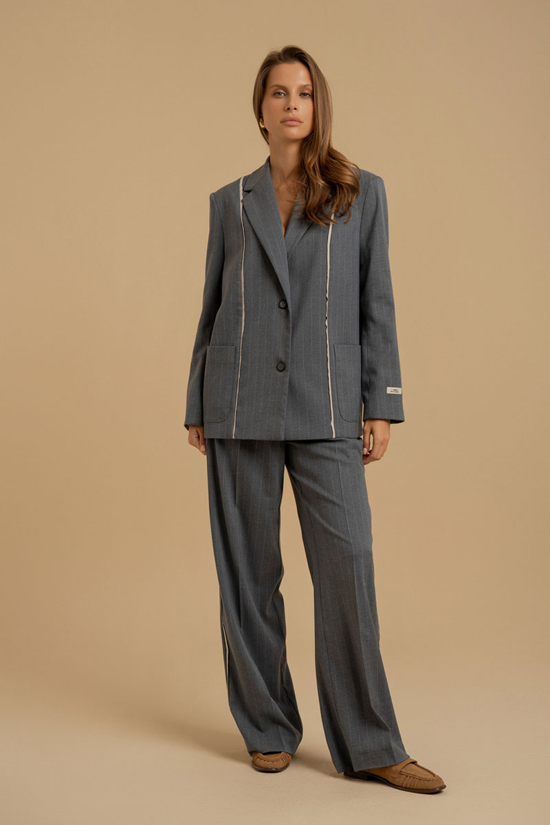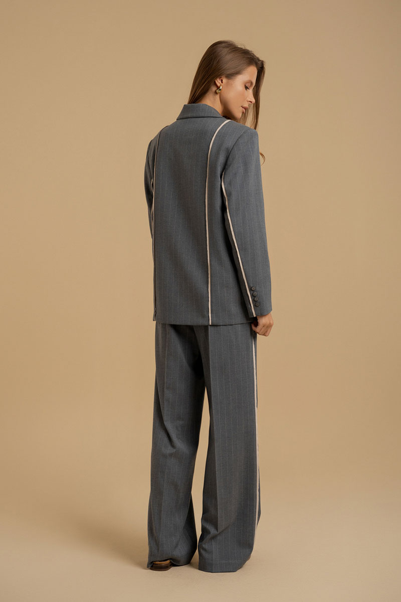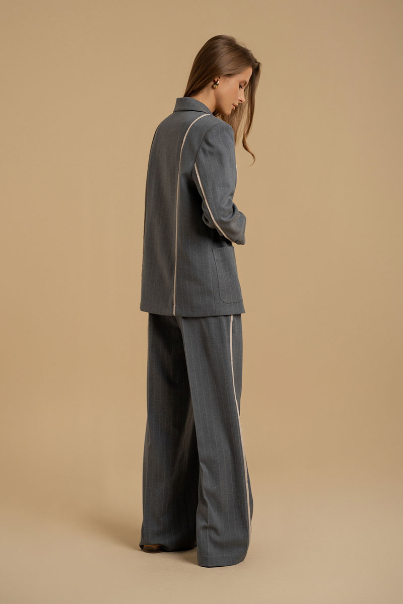 Брюки - прямые со стрелками. Пояс- отрезной с эластичной тесьмой. Имеются карманы с отрезными бочками. В боковых швах - отделочные канты. Есть шлевки для ремня.