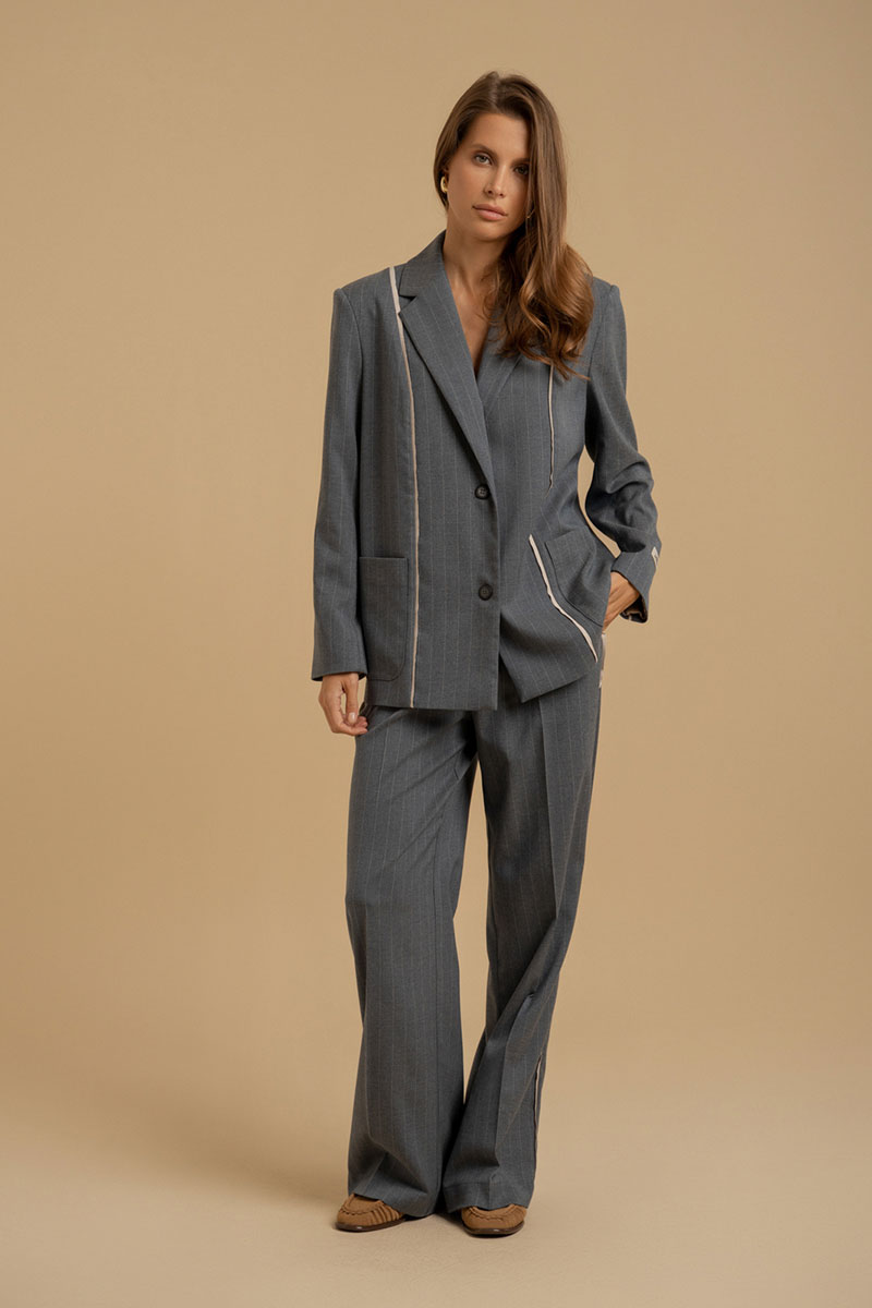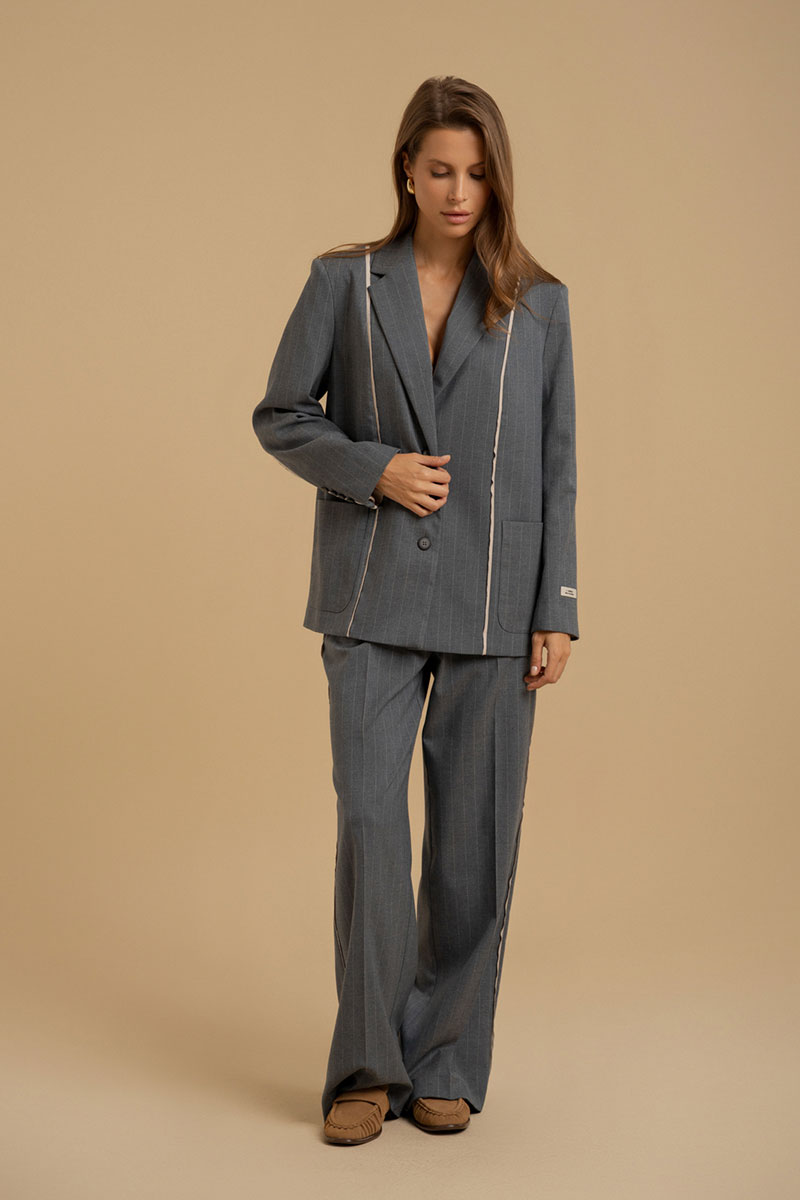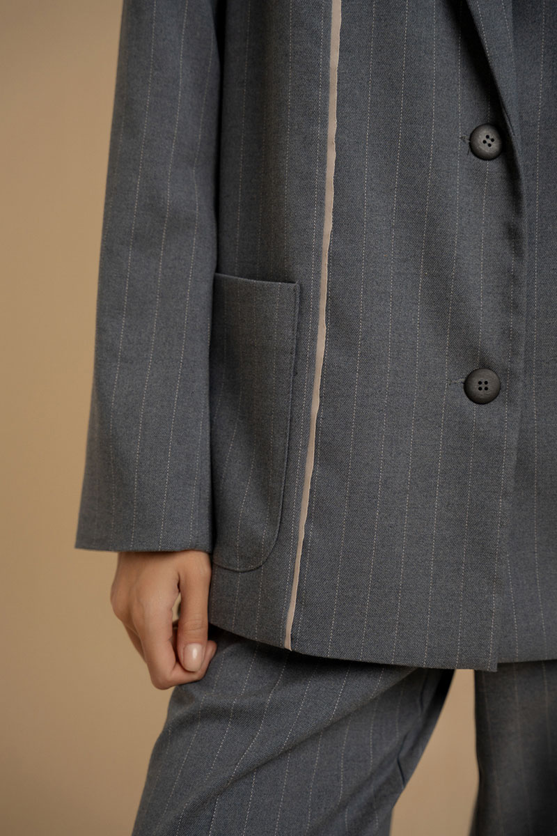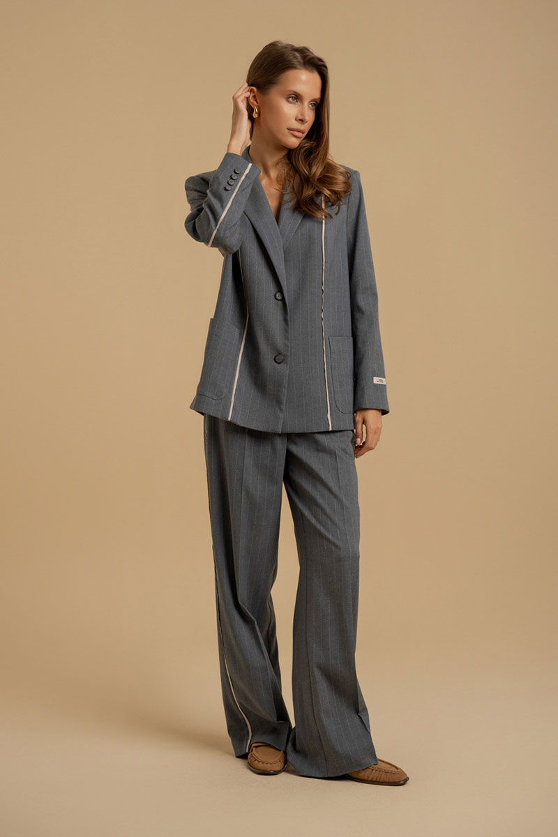Жакет прямого силуэта. Вырез горловины оформлен воротником пиджачного типа. Застежка - двубортная на петли с пуговицами. Линия плеча слегка расширена и усилена плечевыми накладками. Рукава двухшовные. На передних половинках жакета имеются накладные карманы. Изделие декорировано кантами из ткани контрастного цвета. Жакет посажен на подкладку.