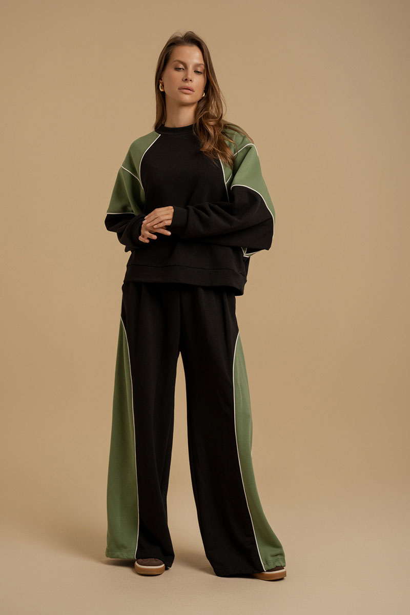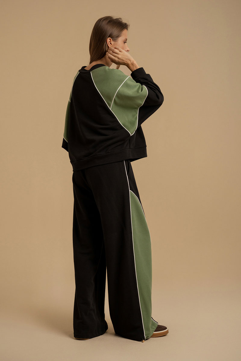 Брюки - свободного покроя. Пояс - отрезной с эластичной тесьмой. В боковых швах имеются карманы. Изделие декорировано вставками и кантами контрастного цвета.