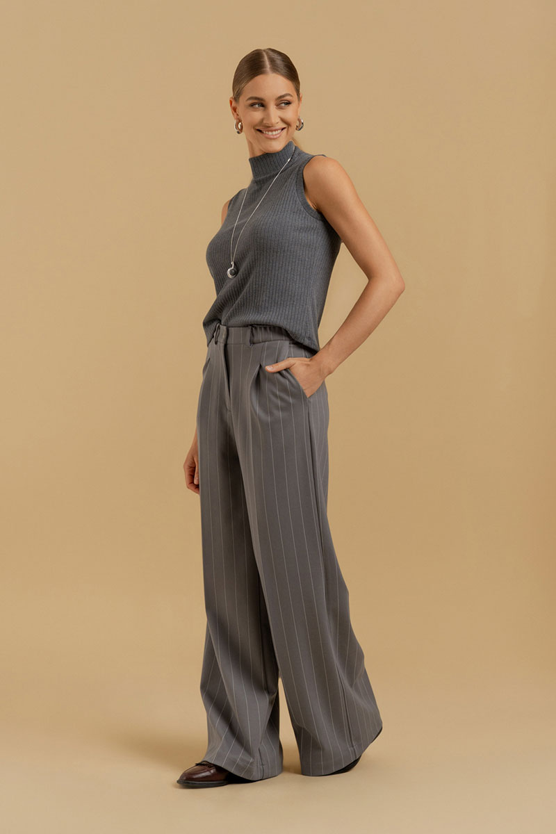 Брюки прямого силуэта со стрелками. Пояс - отрезной с эластичной тесьмой. в боковых швах имеются карманы с отрезными бочками. В боковых швах - карманы. Есть шлевки для ремня.