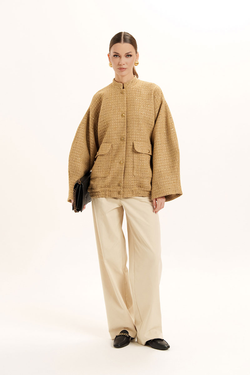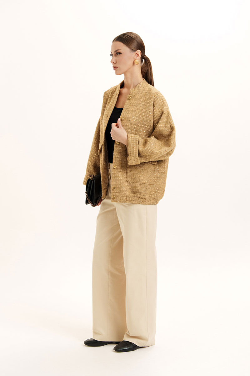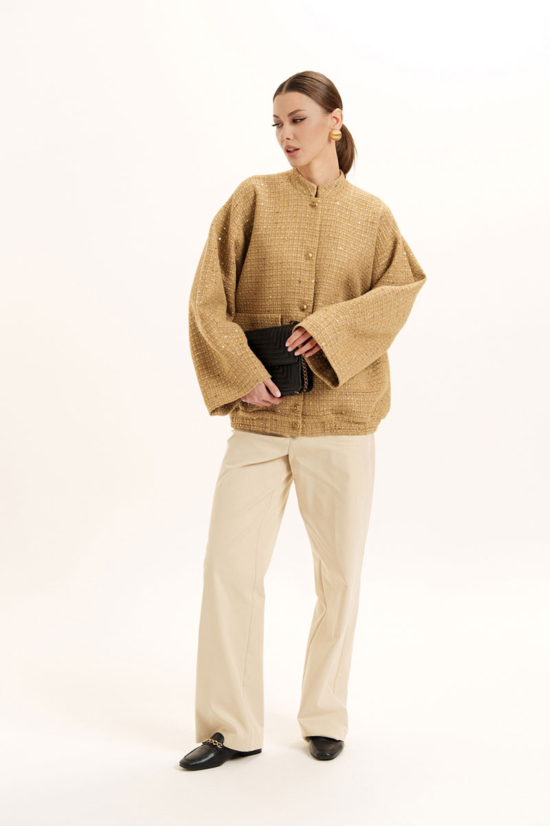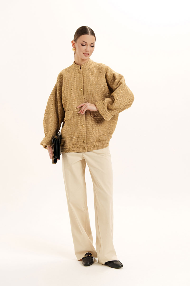 Жакет - бомбер на поясе с резинкой по низу изделия и стойкой по горловине. На полочке обработаны накладные карманы с клапаном. Застежка по борту на петли и пуговицы. Слегка спущенный и расширенный рукав.