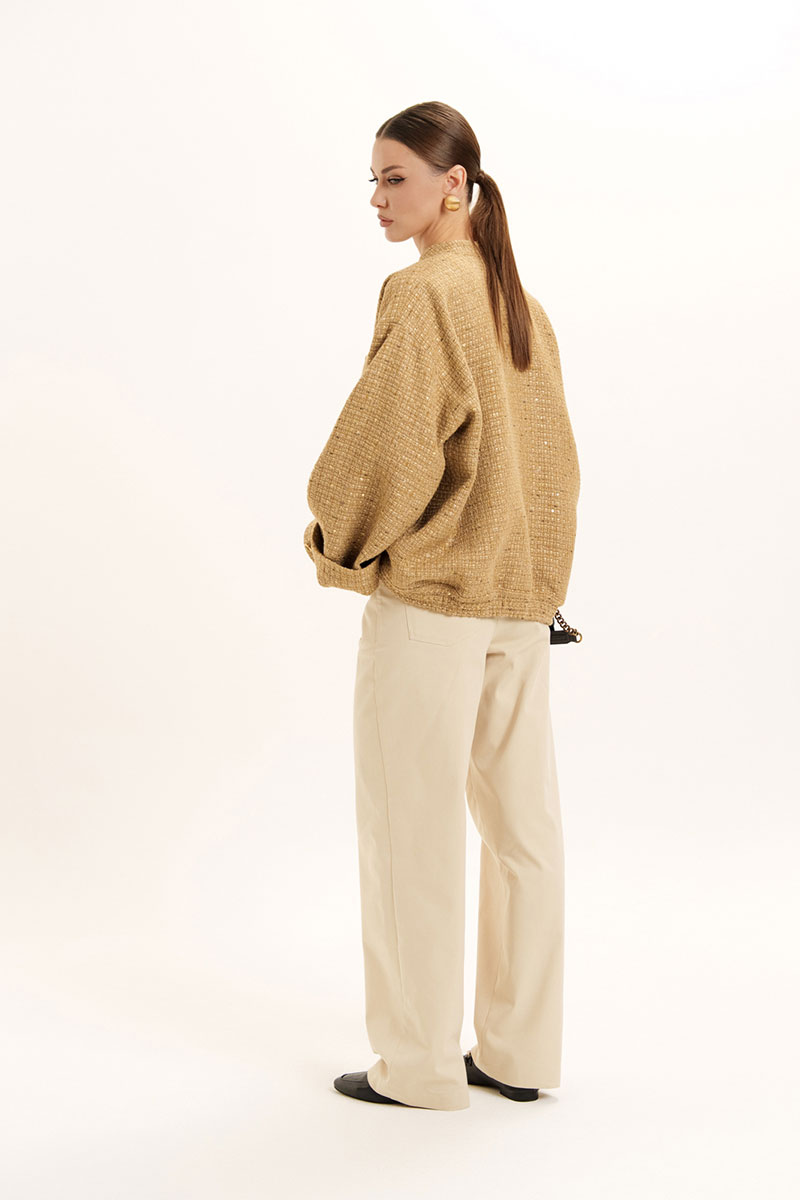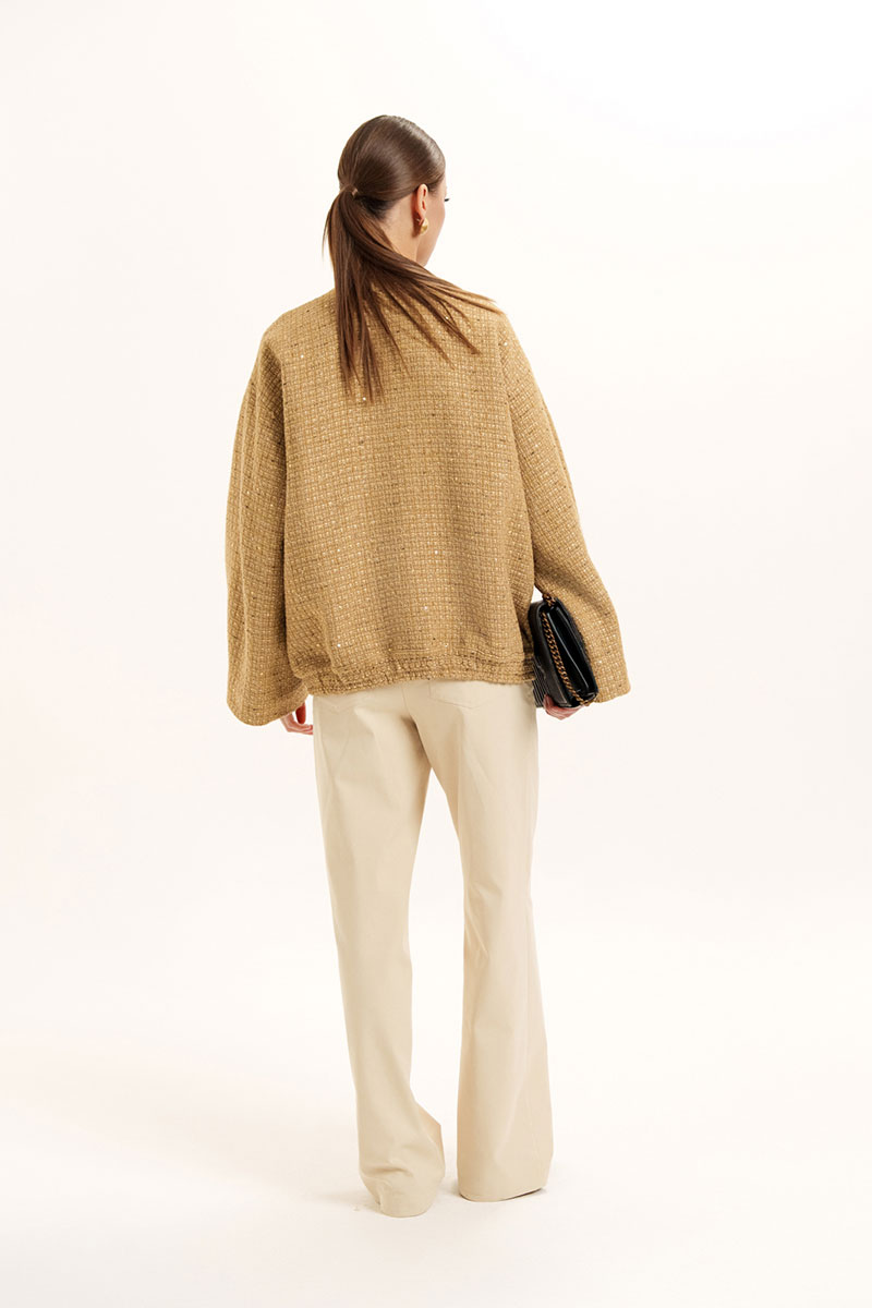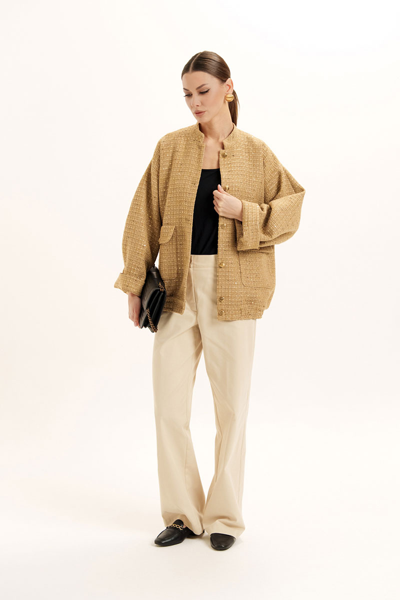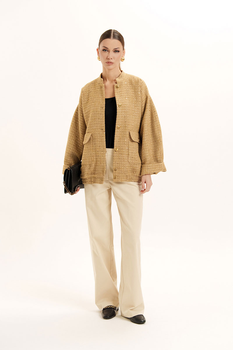 Жакет - бомбер на поясе с резинкой по низу изделия и стойкой по горловине. На полочке обработаны накладные карманы с клапаном. Застежка по борту на петли и пуговицы. Слегка спущенный и расширенный рукав.