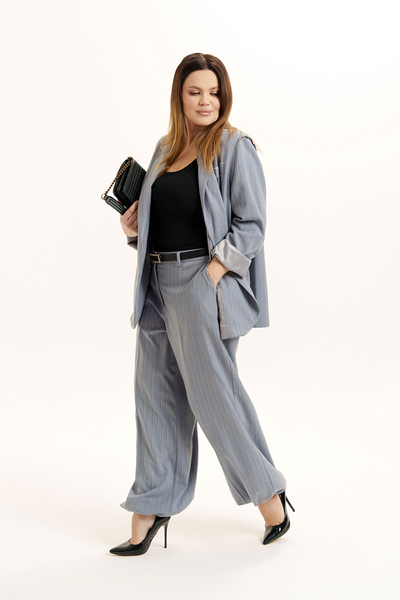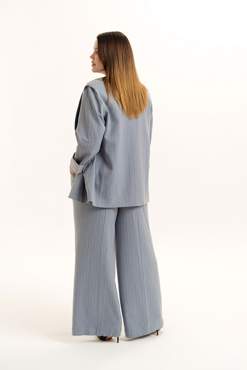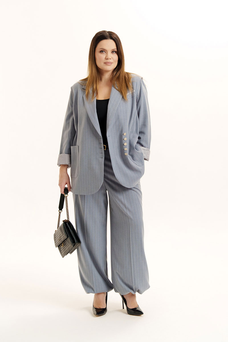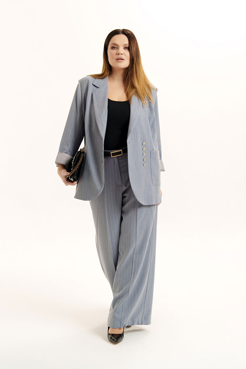 Костюм женский двухпредметный выполнен из костюмной ткани в полоску.