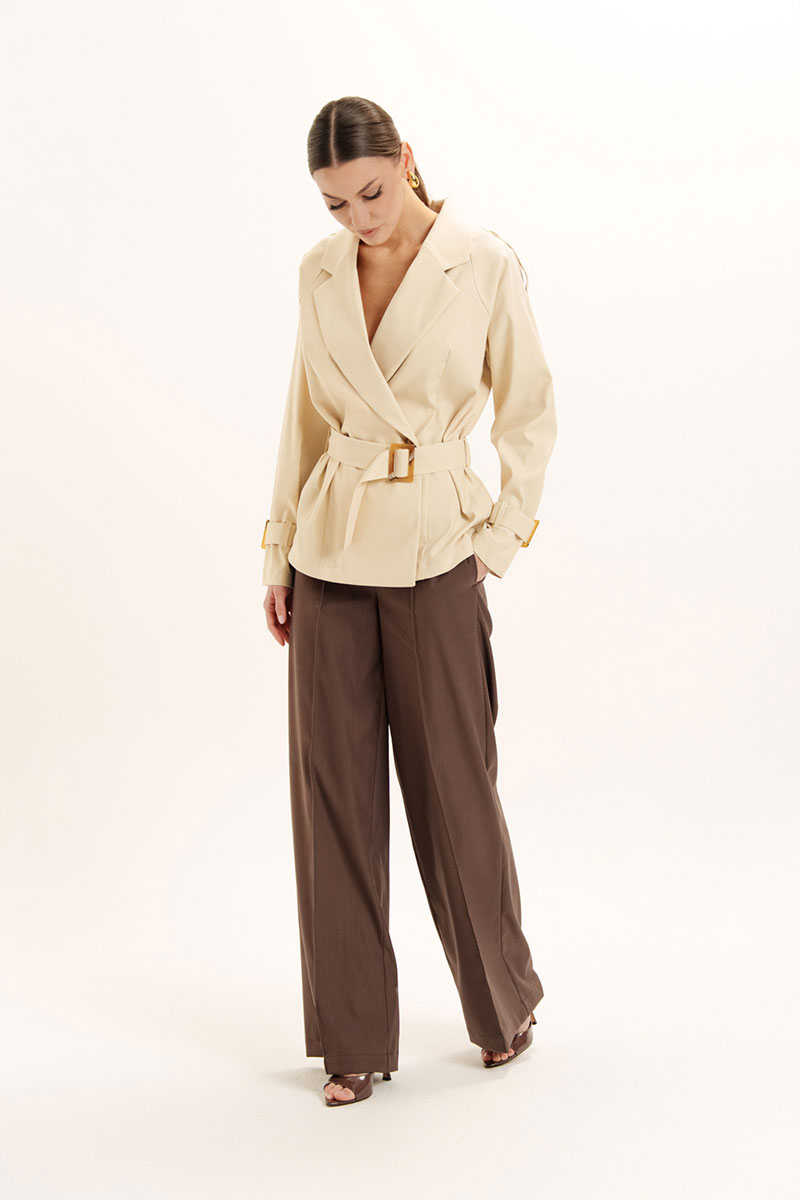 Жакет прямого силуэта с отлетной кокеткой по спинке и двубортной застежкой. Воротник пиджачного типа с лацканами и застежкой на петли и пуговицы. Рукав реглан, на плечевых швах обработаны хлястики с застежкой на петлю и пуговицу. По низу рукава пришиты шлевки и обработаны паты с декоративной пряжкой. В изделии есть съемный пояс, застежка на декоративную пряжку.
