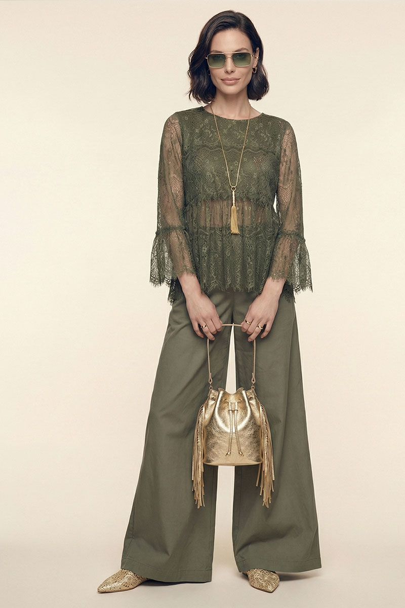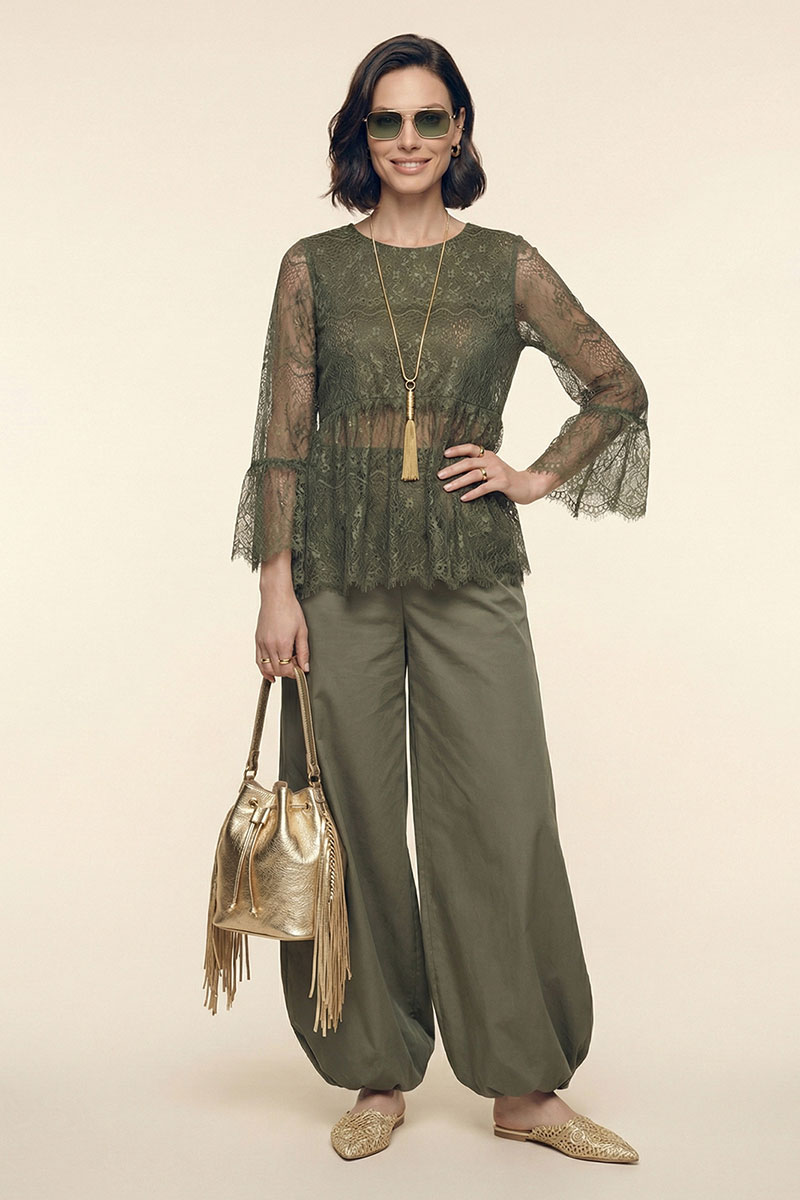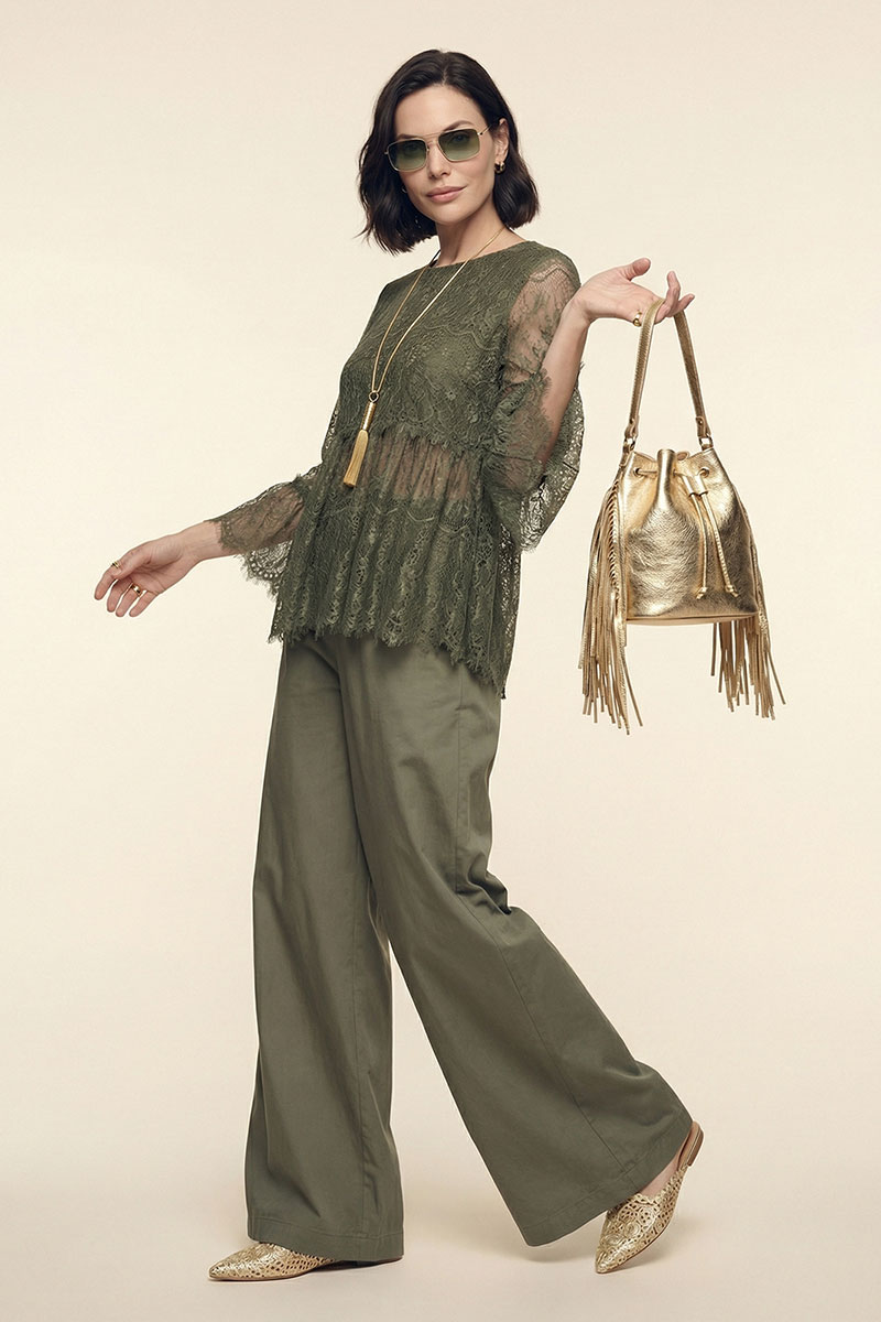 Комплект женский двухпредметный из хлопковой ткани. Блузка с объемными рукавами сложной архитектурной формы. Вырез горловины оформлен воротником пиджачного типа. Застёжка – двубортная на петли с пуговицами. Спереди выполнена имитация прорезных карманов с листочками. Низ изделия – асимметричной формы. Низа рукавов со сборкой, посажены на отрезные манжеты. В подрезы рукавов вставлены декоративные канты из основной ткани контрастного цвета. Юбка – А-силуэта из четырёх клиньев. Пояс – отрезной, частично с эластичной тесьмой. В боковых швах выполнены карманы. Изделия декорировано кантами из основной ткани контрастного цвета.