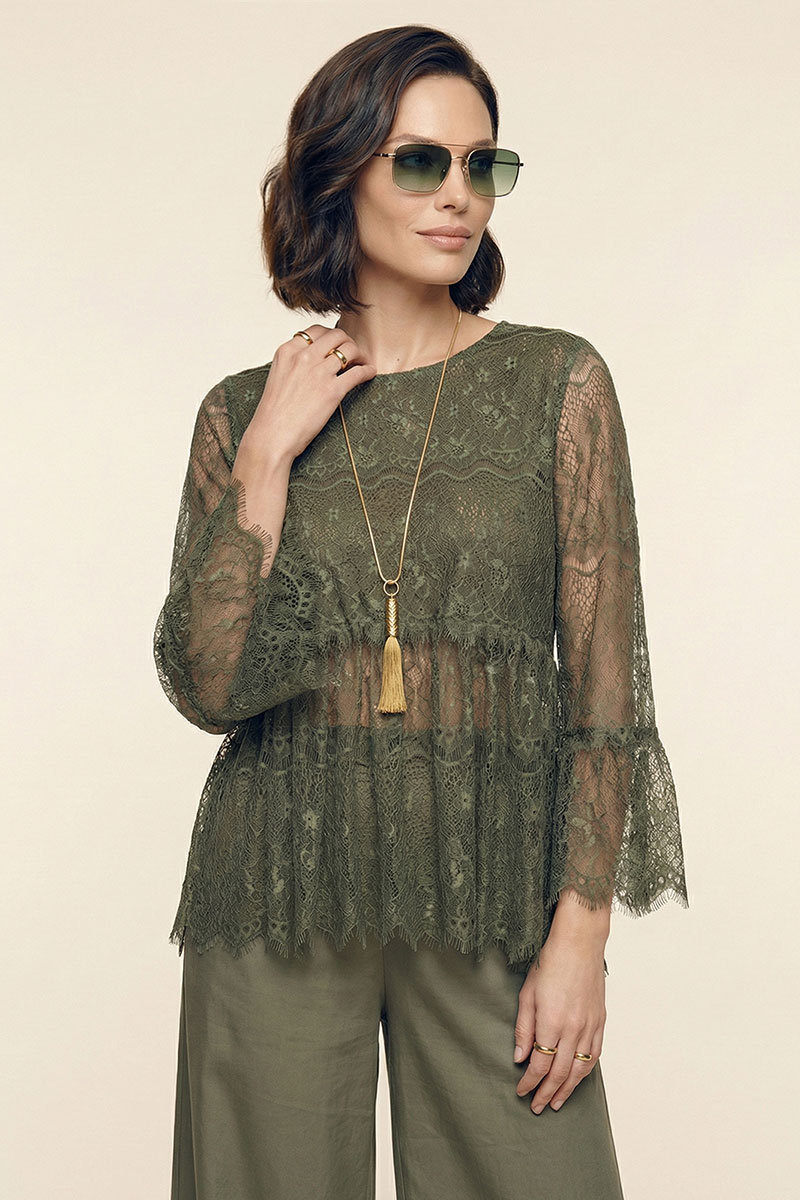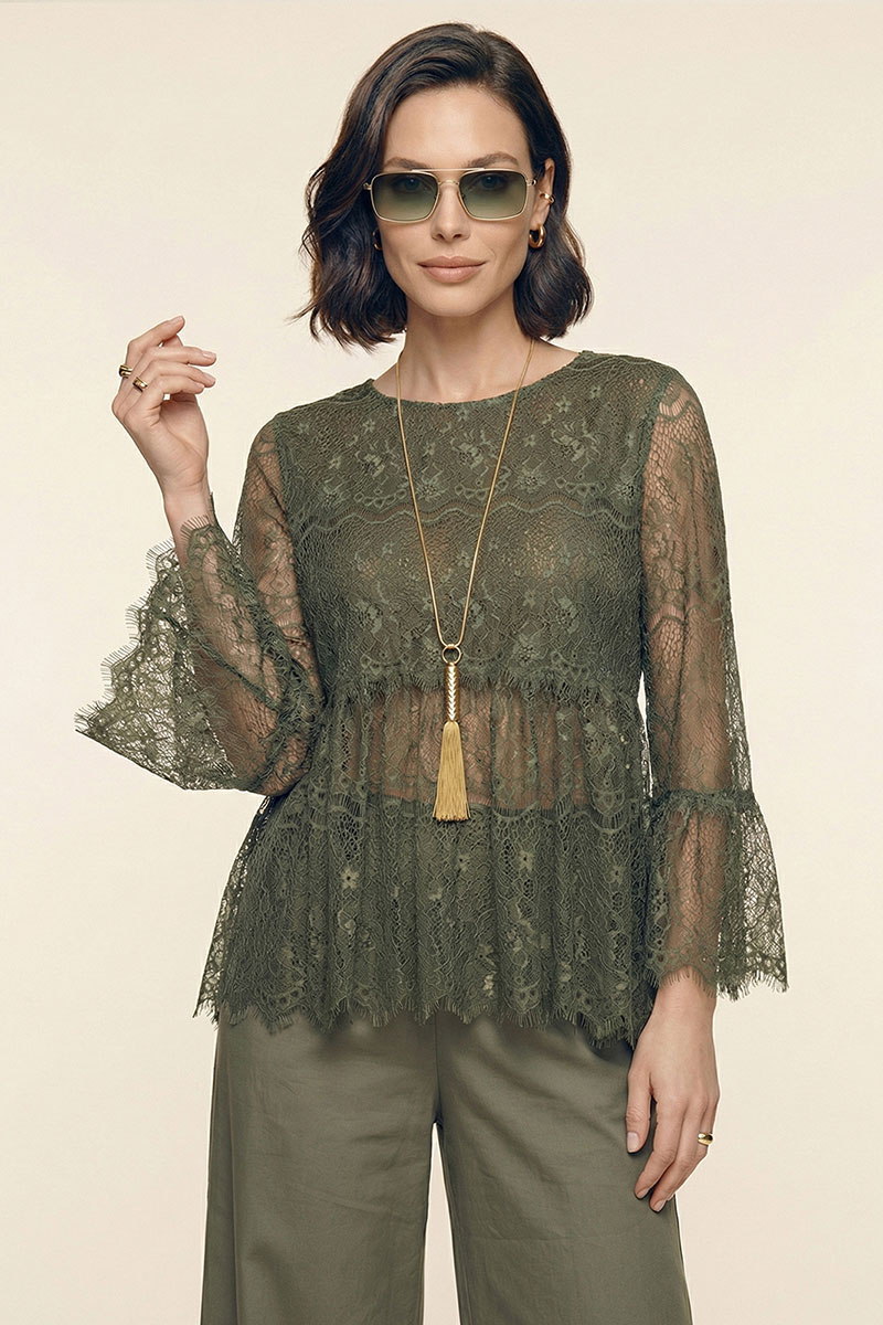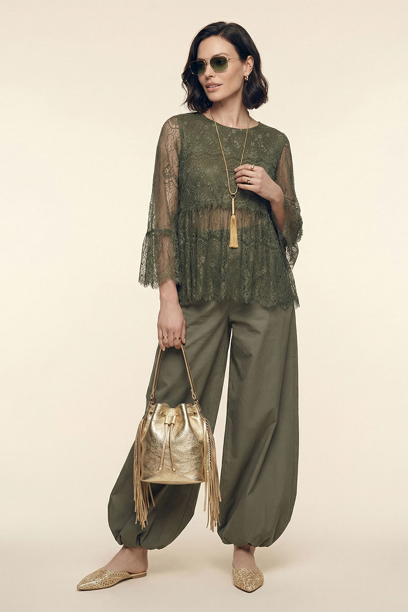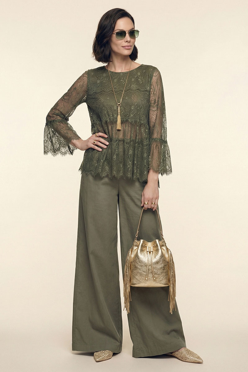 Комплект женский двухпредметный из хлопковой ткани. Блузка с объемными рукавами сложной архитектурной формы. Вырез горловины оформлен воротником пиджачного типа. Застёжка – двубортная на петли с пуговицами. Спереди выполнена имитация прорезных карманов с листочками. Низ изделия – асимметричной формы. Низа рукавов со сборкой, посажены на отрезные манжеты. В подрезы рукавов вставлены декоративные канты из основной ткани контрастного цвета. Юбка – А-силуэта из четырёх клиньев. Пояс – отрезной, частично с эластичной тесьмой. В боковых швах выполнены карманы. Изделия декорировано кантами из основной ткани контрастного цвета.