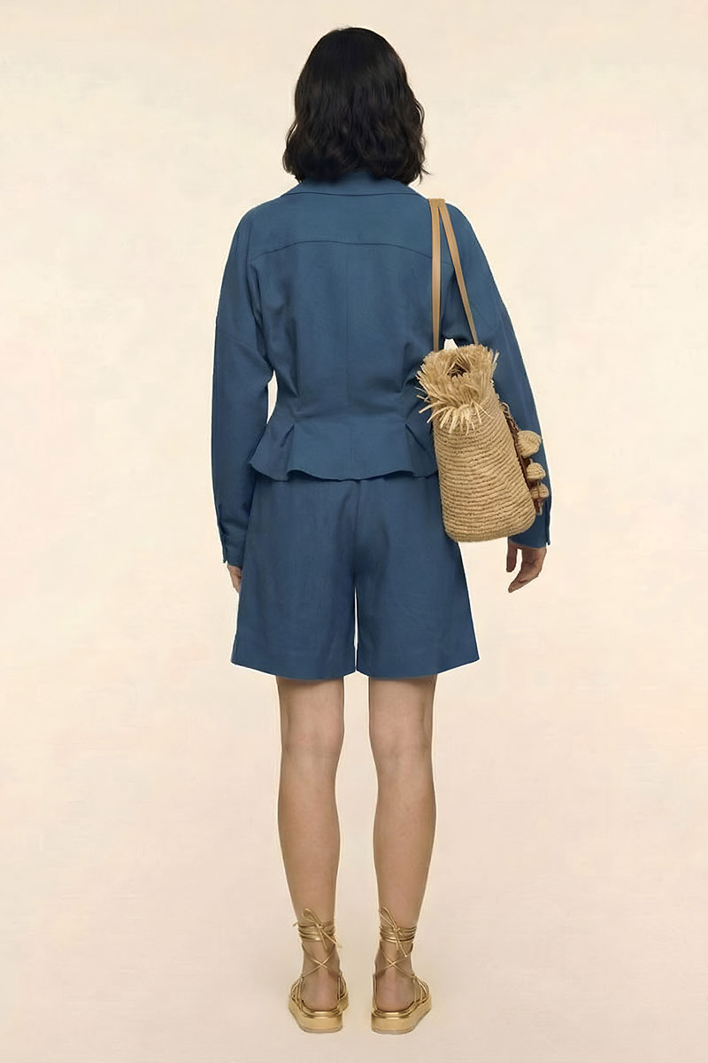 Комплект женский двухпредметный из ткани тенсел. Блузка - приталенная за счёт мягких встречных складок в области талии. Рукава - со спущенной линией плеча на базе цельнокроеных. Низа оформлены отрезанными манжетами с застёжкой на петли с пуговицами. Вырез горловины – воротник рубашечного типа с отрезной стойкой. Застёжка – отрезная планка на петли с пуговицами. Шорты – бермуды свободного покроя. Пояс – отрезной с эластичной тесьмой. В боковых швах имеются карманы.