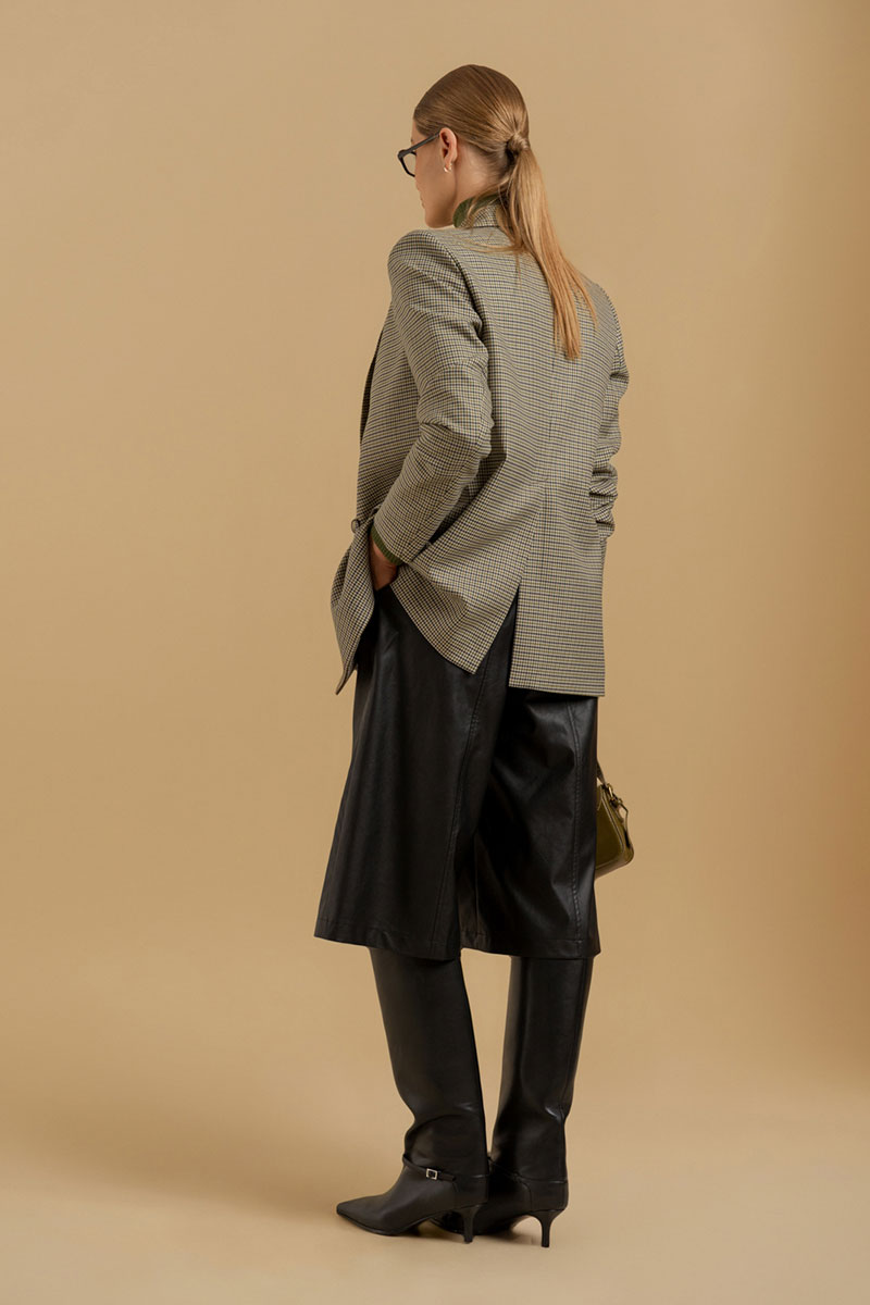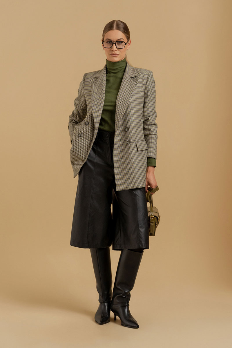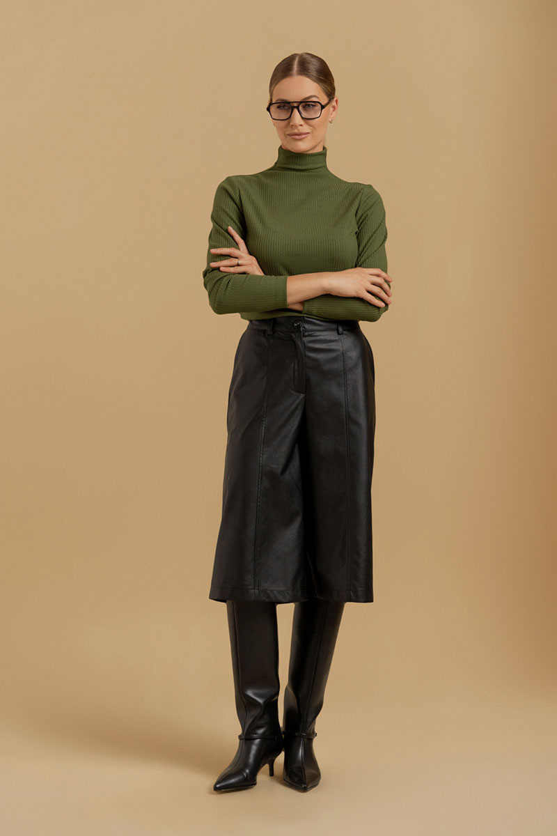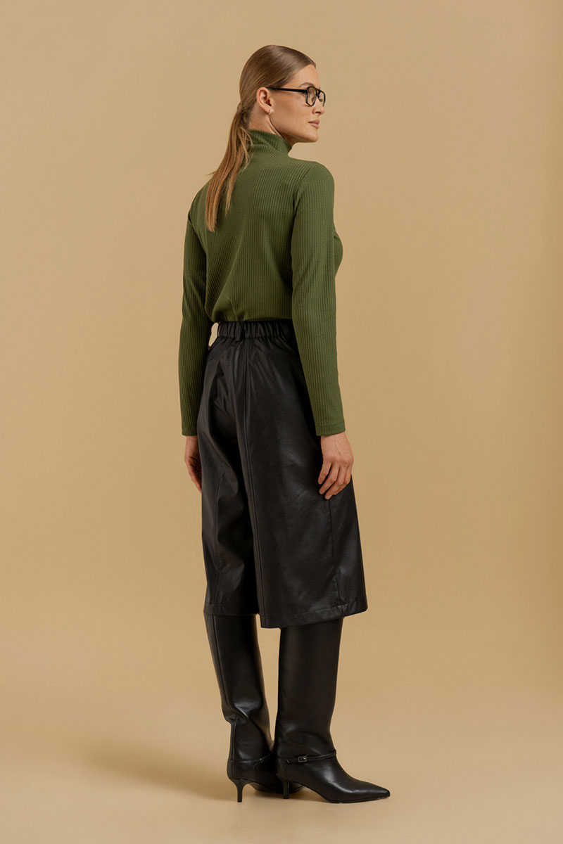 Шорты-бермуды из искусственной кожи на хлопковой основе. Пояс - отрезной с эластичной тесьмой и застежкой на брючный крючок. В боковых швах - карманы с отрезными бочками. Изделие декорировано вертикальными подрезами с отделочными строчками. Есть шлевки для ремня.