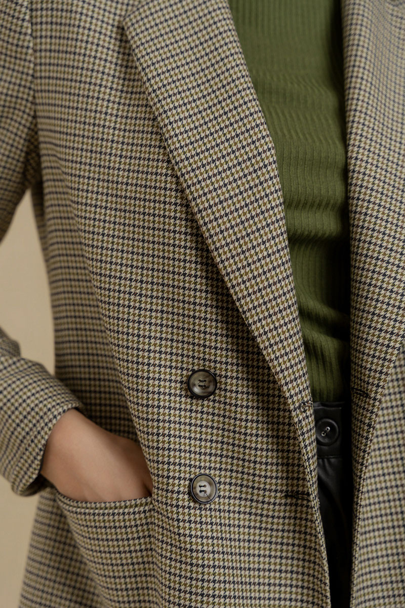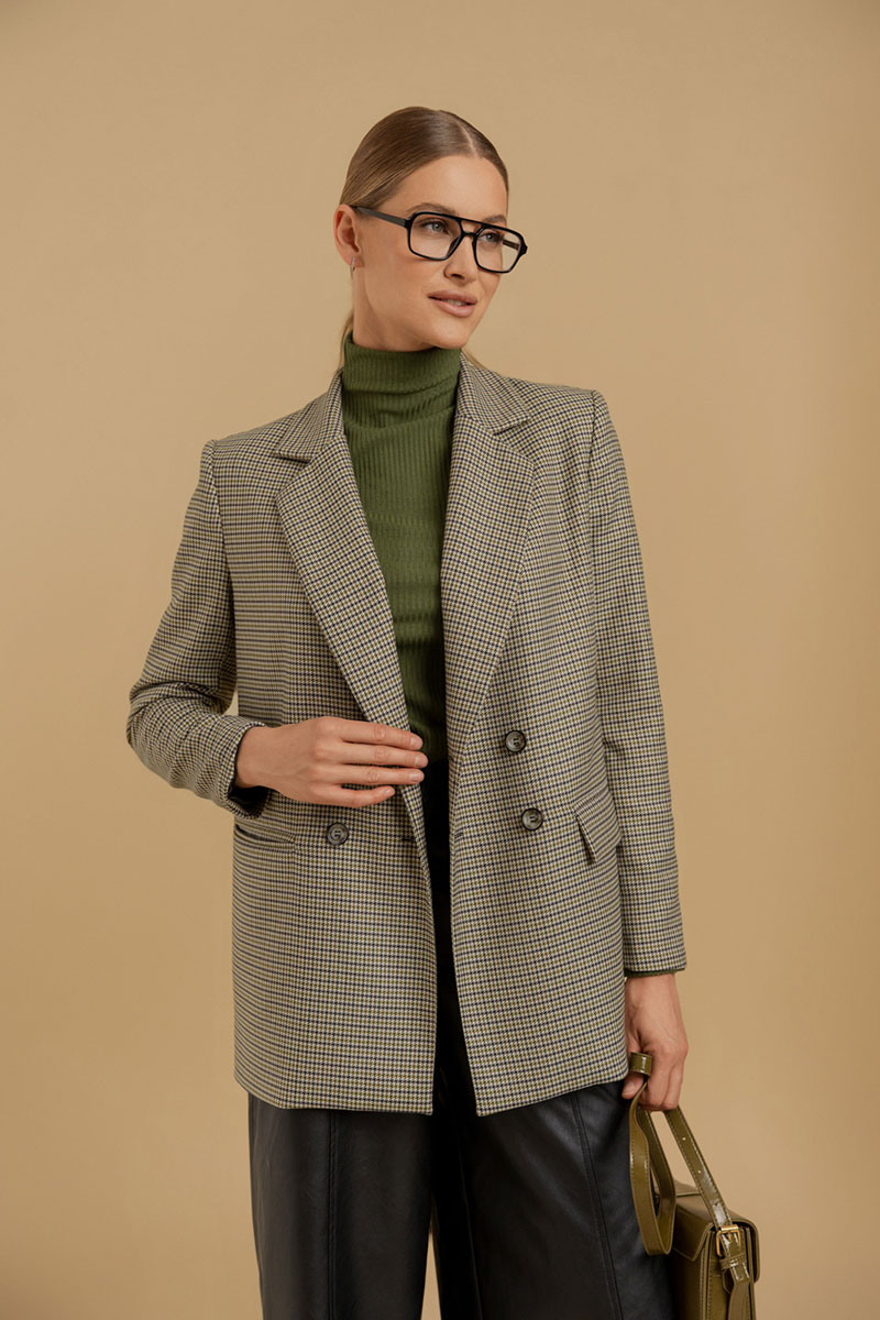 Жакет классического покроя из поливискозной ткани. Вырез горловины оформлен воротником пиджачного типа с двубортной застежкой на петли с пуговицами. Рукава - втачные, двухшовные. Линия плеч усилена плечевыми накладками. Спереди имеются прорезные карманы, сзади - шлица. Изделие посажено на подкладку.