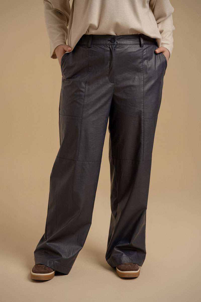 Брюки женские прямого силуэта из искусственной кожи на хлопковой основе. Пояс - отрезной с эластичной тесьмой и застежкой на брючный крючок. В боковых швах - карманы с отрезными бочками. Изделие декорировано подрезами. Есть шлевки для ремня.