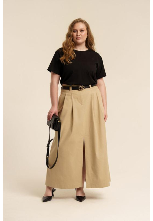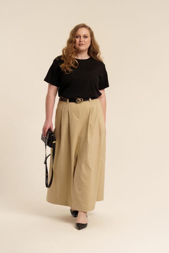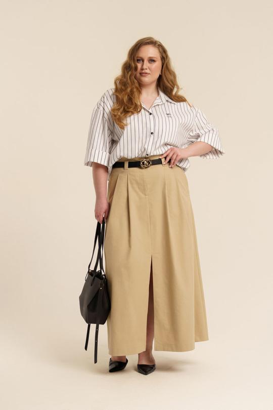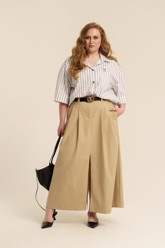 Юбка женская свободного покроя с мягкими складками из джинсовой ткани. Пояс- отрезной с застежкой на молнию и петлю с пуговицей. В боковых швах имеются карманы с листочками. Сзади- настрочные карманы. В переднем и заднем средних швах выполнены высокие разрезы. Есть шлевки для ремня.